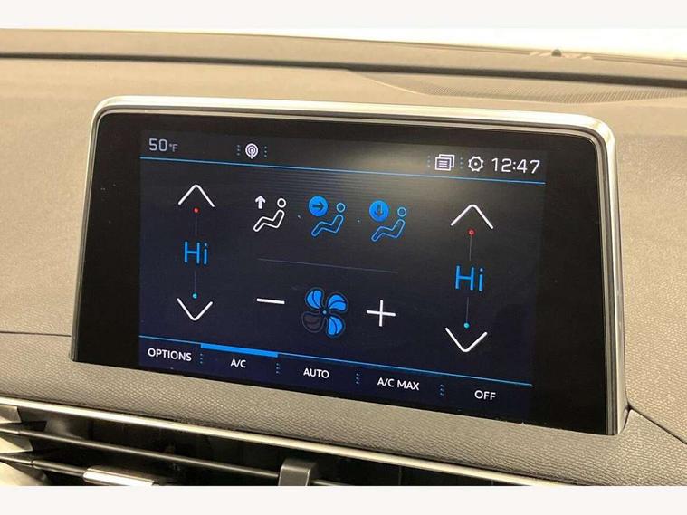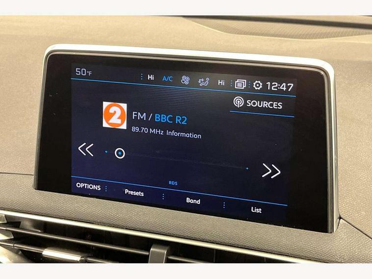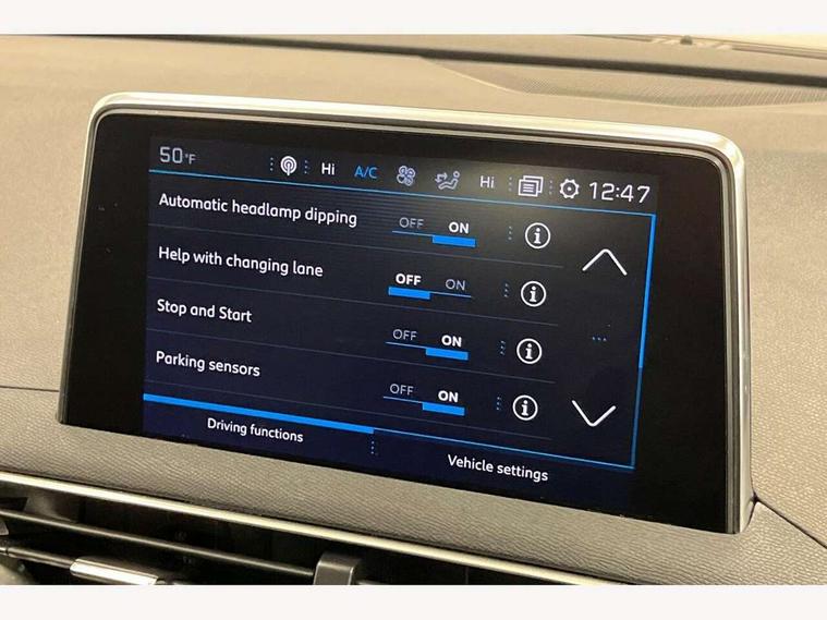 'Lights On' Reminder warning buzzer, 3D connected navigation + voice control + Peugeot connect SOS and assistance, Bluetooth telephone facility, Digital clock, Exterior temperature indicator with ice warning, Front and rear parking sensors, Lane departure warning system, Mirror screen with mirror link, apple carplay and android auto, Multi function trip computer, PEUGEOT i-Cockpit with 8.0" capacitive touchscreen in centre console, PEUGEOT i-Cockpit with compact sports steering wheel, PEUGEOT i-Cockpit with configurable 12.3" Head-up digital instrument panel, Speed limit recognition and recommendation, Sports button, Dynamic stability control and electronic anti-skid system, DAB Digital radio, Steering column mounted multifunction controls, USB socket, 2 X Rear number plate lights, Aluminium longitudinal roof bars, Automatic triggered rear windscreen wiper in reverse gear, Black and chrome front wing trim, Black bumper protection plate, Black rubber side window trim, Black wheel arch extensions, Body colour door handles, Body colour door mirror shells, Body colour rear spoiler with stainless steel edging trim, Body coloured bumpers, Body protectors (bottom of front and rear bumpers + wheel arches + protection at bottom of doors) in black, Chrome bumper inserts, Chrome front fog light trim, Chrome radiator grille and surround, Chrome rear bumper facia, Dark tinted rear side windows + tailgate window, Door mirror mounted LED courtesy approach lights, Electric operated/heated door mirrors, Front windscreen wiper with magic wash cleaning system, Gloss black finish B and C pillar, Gloss black rear cluster connecting strip, Gloss black windscreen surround, Halogen headlights, Headlights left on audible warning, Heated rear windscreen with integrated antenna, LED daytime running lights, LED rear lights, LED sequential scrolling front indicators, LED side indicator lights integrated into door mirrors, Lion grey front bumper scuff plate, One touch electric front/rear windows with pinch protection, Power folding door mirrors with blind spot detection indicator and auto dipping function in reverse gear, Radiator grille in chrome edge trim and facets, Rear LED Peugeot signature 'Claw Effect' lights, Stainless steel roof arches, 1/3 to 2/3 split folding rear seats, 12V Sockets in dashboard, rear cabin and load area, 2 cupholders in front centre console, 2 rear reading spotlights, 2x Rear coat hooks, 3x Isofix child seat fittings in the front passenger and outer rear seats, 4 Grab handles retractable and damped, 4 Lashing eyes in boot, Automatic gear lever in satin chrome, Blue ambient lighting for connecting zone, Blue ambient lighting to front door panels, central storage and cupholders, Blue ambient lighting to head up instrument panel, Centre front armrest with butterfly wing opening and illuminated storage compartment, Driver and front passenger seat height adjustment, Driver seat manual adjustment, Dual zone automatic climate control, Electric power steering with reach and rake adjustable steering column, Fixing rings 4 in load compartment, Flocked glovebox interior, Fold flat front passenger seat with picnic table, Footwell illumination, Front headrests, Front interior light with 2 reading spotlights and rear interior light with timer, Front seat back map pockets, Gear shift indicator, Height adjustable headrests, Illuminated cupholders, Illuminated glovebox, Illuminated vanity mirrors, Mistral full grain leather steering wheel, Rear armrest with ski flap and two cup holders, Rear centre console ventilation system, Rear headrests, Reclining front seats, Roof LED interior lighting, Roof lining - Salin light grey, Satin chrome dashboard trim, Satin chrome digital instrument panel and touchscreen trim, Satin chrome front door panel recess trim, Satin chrome interior door handles, Satin chrome scorpion's tail and toggle switch trim, Seatbelt not fastened audible and visual alert for front seats, Seatbelt unfastened on the move audible and visual alert for front and rear seats, Two position boot floor, Variable boot floor, Safety pack - 3008, Safety Plus Pack - 3008, Visibility pack - 3008, 3x Rear three-point retractable seatbelts with force limiters in the outer rear seats, Adaptive driver and front passenger airbags with passenger airbag deactivation function, Anti-lock braking system with electronic braking distribution and emergency braking assistance, Auto city emergency braking, Driver and front passenger side airbags, Driver SMART airbag, Electric child locking functionality on rear windows and doors, Electric parking brake, ESP with ASR, Front and rear curtain airbags, Front optimised safety headrests and 3 x rear retractable headrests with height adjustable, Front passenger SMART airbag with deactivate switch, Front three point retractable seatbelts with pre tensioners and force limiters, Front ventilated disc brakes and rear disc brakes, Height adjustable front seatbelts, Hill start assist, Tyre pressure sensor, Anti theft alarm, Automatic door lock/re-lock after 30 seconds, Automatic hazard light activation upon heavy brake application, Central locking button on dash, Deadlocks, Electronic immobiliser, Locking wheel bolts, Remote control central locking with two plip keys, Brumeo fabric Dashboard, front and rear door panel finish, Satin chrome dash trim, Satin chrome instrument dial surrounds,