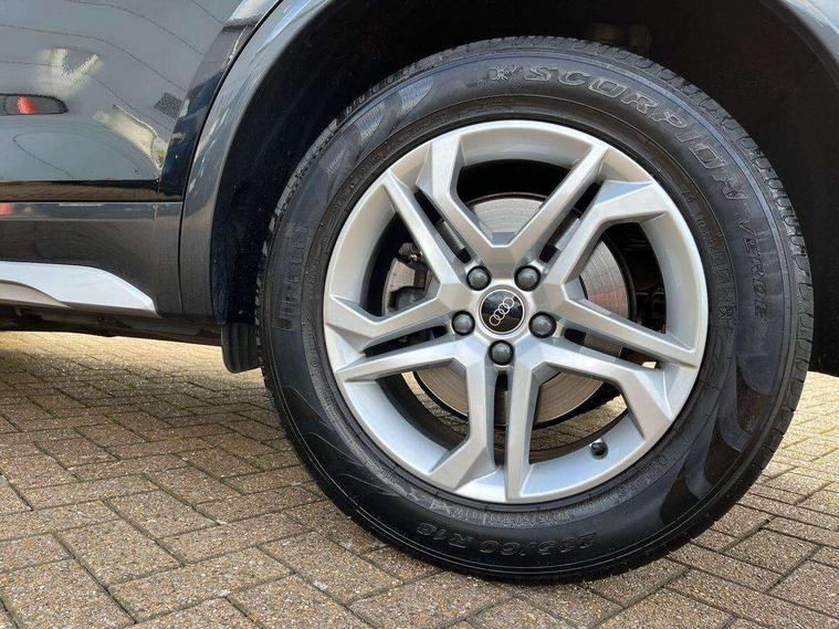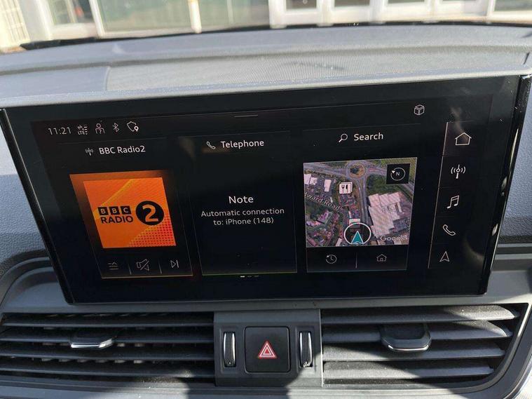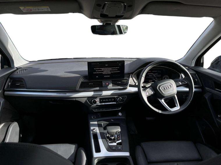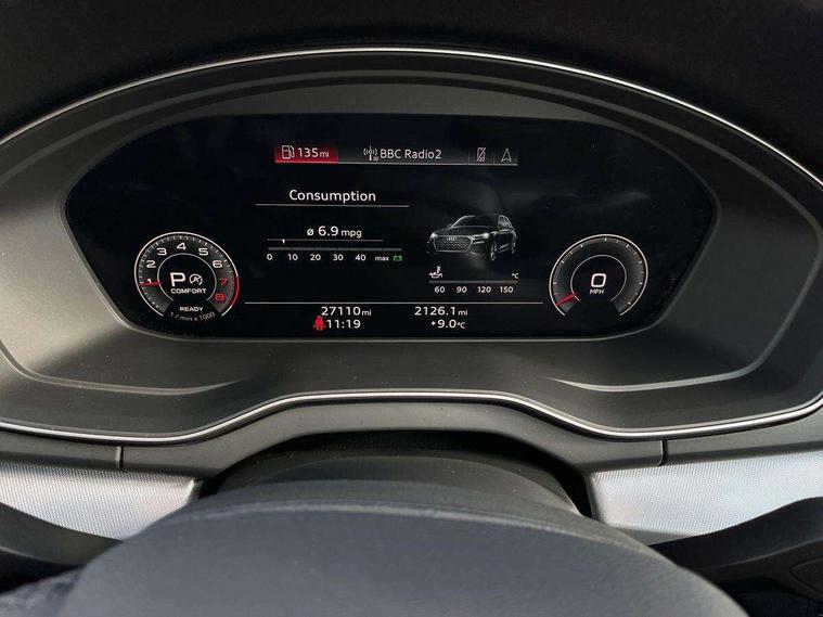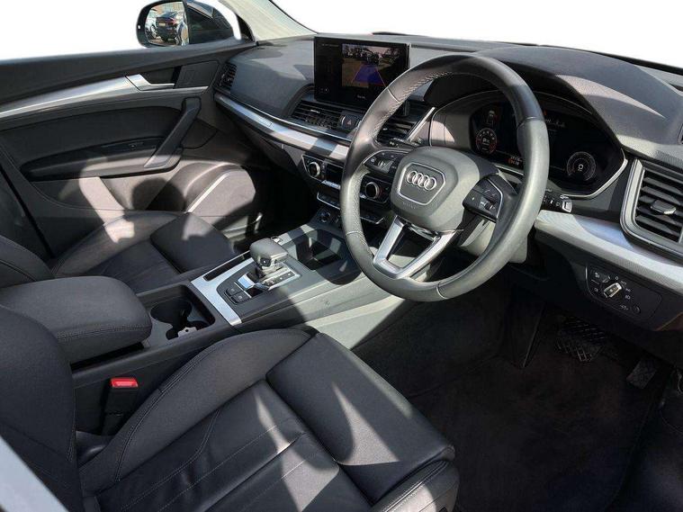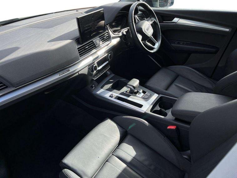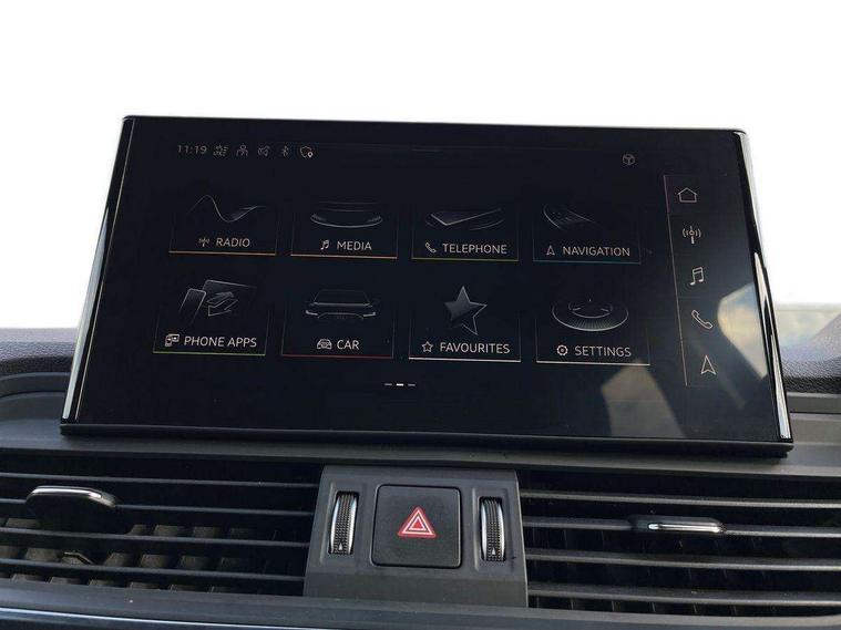 Acoustic front and rear parking sensor, Audi connect safety and service (e-call), Audi drive select, Audi virtual cockpit plus with 12.3" screen and three different layout designs, Audi wireless smartphone interface, Automatic start-stop system with coasting functionality and efficiency programme, Bluetooth interface, Camera based traffic sign recognition, Electro - mechanical power assisted steering, Lane departure warning, MMI navigation plus with 10.1" touch screen, Power tailgate, Reversing camera, Service interval indicator, Voice control system with Audi hotword activation "Hey Audi", Dynamic suspension, Quattro on demand, 2 x USB charging port with aux input socket, 8 loudspeakers, DAB Digital radio, Acoustic windscreen, Air inlets in matt anthracite black with blades in matt aluminium silver, Aluminium roof rails, Auto dimming door mirrors, Auto dimming frameless rear view mirror, Automatic headlight adjustment, Automatic headlights and windscreen wipers, Body colour bumpers, Body colour door mirrors, Chrome plated exhaust trims, Daytime running lights, Door sills in Selenite silver, Electric adjustable/heated/folding door mirrors, Front and rear electric windows, LED 3rd brake light, LED headlights and LED tail lights, Loading edge protection in stainless steel, Lower bumpers painted in contrast Manhattan grey, Matt selenite silver underbody protection, Matt twilight grey radiator grille with chrome vertical struts, Rear chrome trim strip below lights, Rear diffuser strip in selenite silver, Rear side wing doors, Rear spoiler, Rear wiper, Roof bars, 3 rear headrests, 3 spoke multifunction leather steering wheel with shift paddles, Comfort front centre armrest, Deluxe 3 zone electronic climate control, Door sills trims with aluminium inlays, Front head restraints, Front sport seats, Front/rear floor mats, Heated front seats, Height/reach adjustable steering column, Luggage compartment cover, Manual seat adjustment with 4-way electric lumbar support, Single front passenger seat, Split folding 3 seater rear seat bench in 3 parts (40/20/40), Sunvisors with vanity mirrors, Twin leather upholstery, High gloss pack - Q5, LED interior light pack - Q5, 3 point seatbelts on all seats, 6 airbags - Driver, front passenger, curtain and side airbags, Attention and drowsiness assist, Electrically operated child locks on rear doors, Electromechanical parking brake, Electronic stabilisation control including ABS, ASR and EDL, First aid kit with warning triangle and vests, Front passenger airbag deactivation, Hill descent control, Hill hold assist, ISOFIX child seat mounting for front passenger seat and ISOFIX child seat mounting with Top Tether for outer rear seats, Multi collision brake assist, Pop-up bonnet for pedestrian protection, Pre sense city, Seatbelt monitoring, Tyre pressure warning, Anti theft alarm, Anti-theft wheel bolts, Remote central locking, Remote control key with SAFELOCK and keyless go, Air vents inserts and centre console in matte black, Aluminium rhombus inlay, Tool kit, Tyre repair kit,