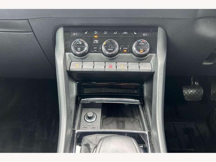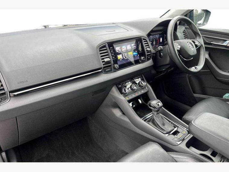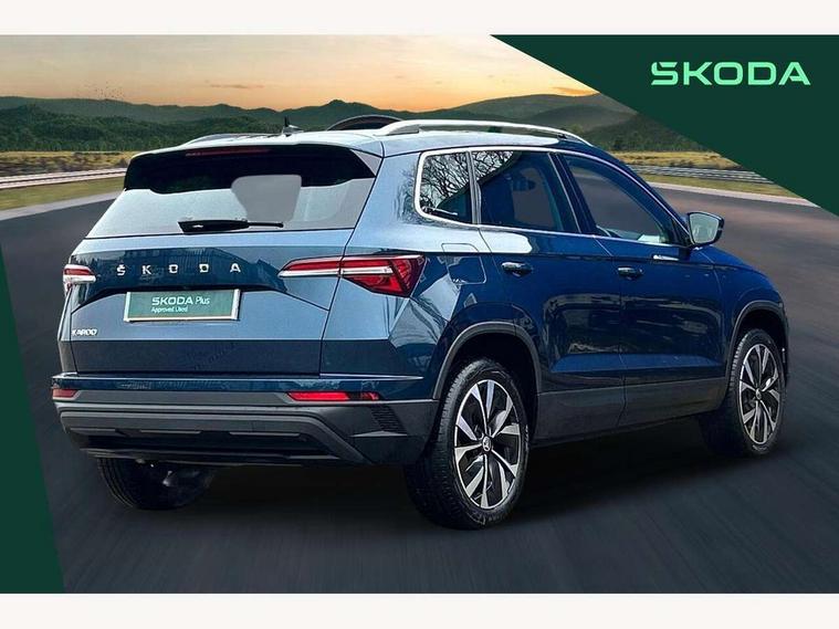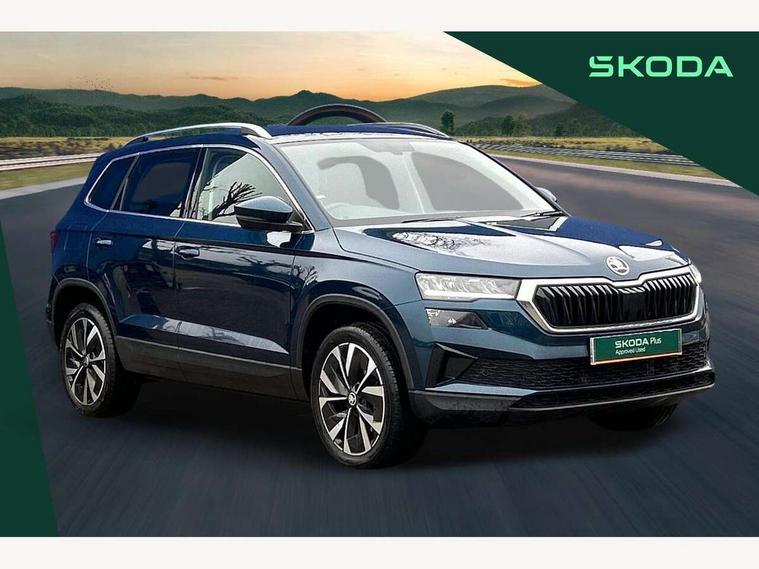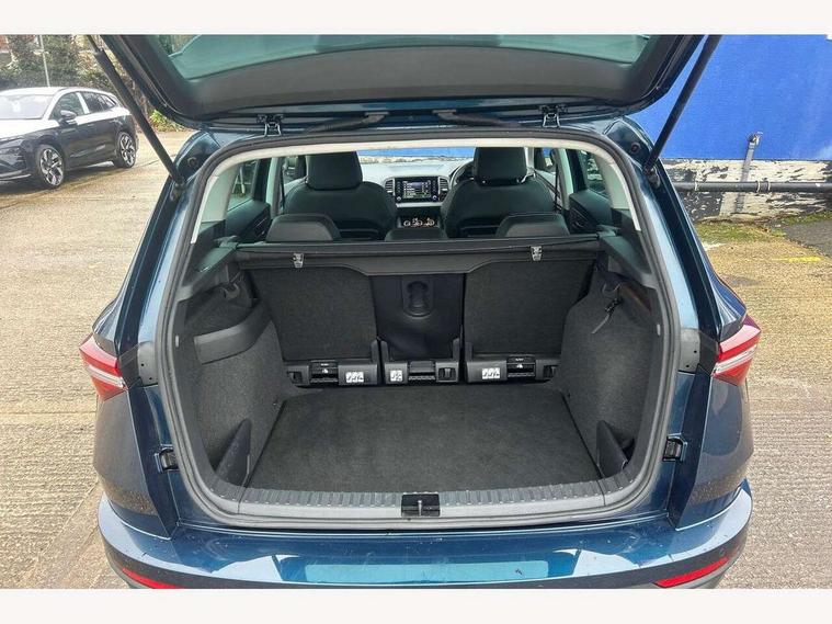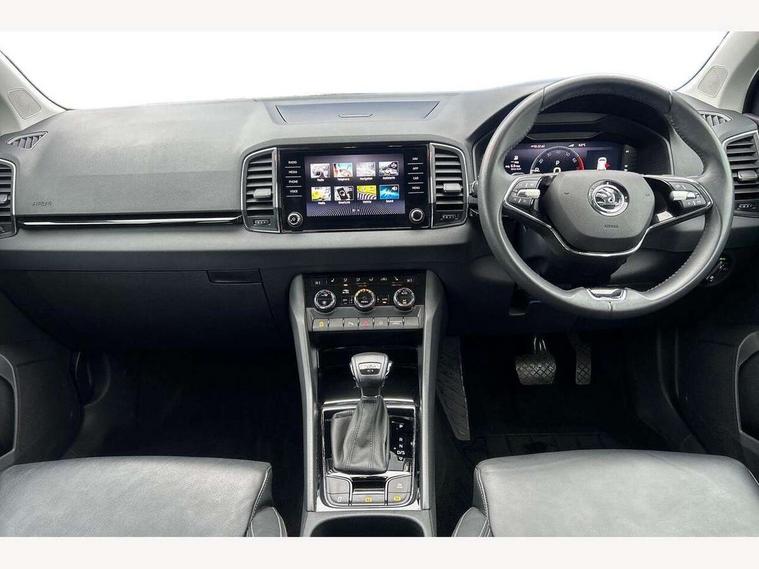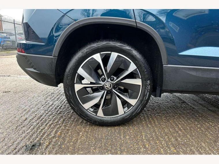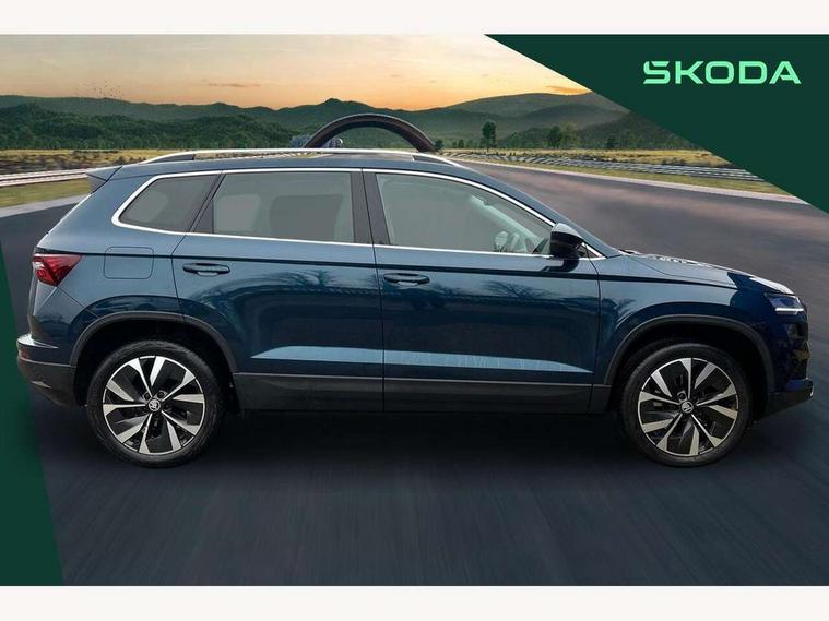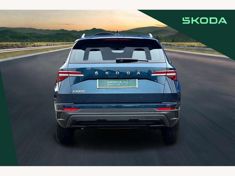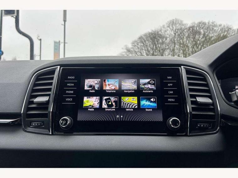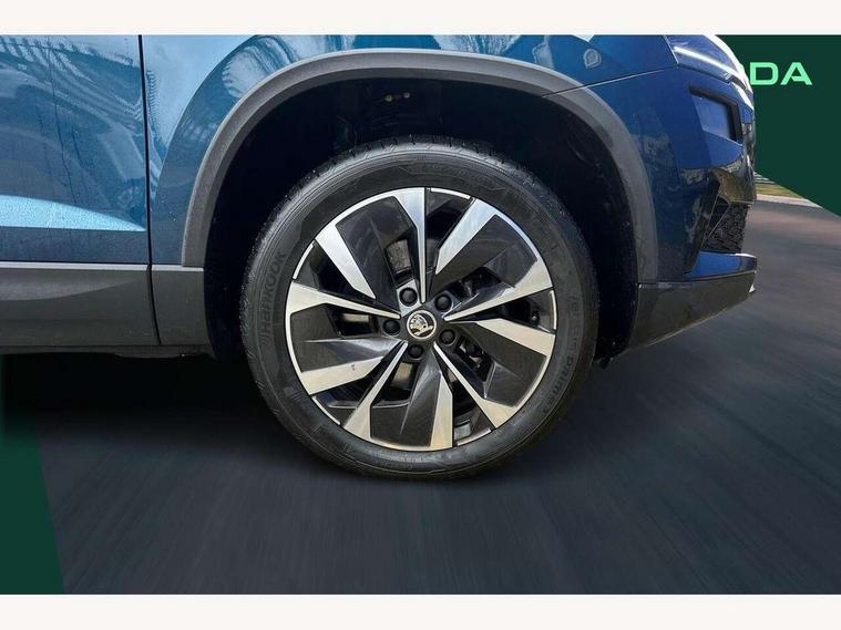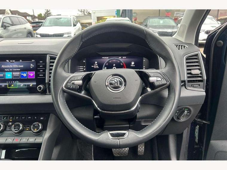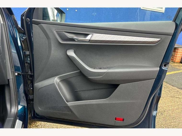8" Digital display, Care connect, Colour multifunction trip computer, Driver fatigue sensor, Emergency services call system, Outside temperature gauge, Service interval indicator, SmartLink wireless for Apple and wired for Android, Start/stop system with regenerative braking, USB C Port x 2 in front centre console, 8 Speakers, DAB radio with Bluetooth, USB connection, Acoustic glass, Aero front windscreen wipers with intermittent function, Auto dimming rear view mirror with light and rain sensors, Automatic headlight control system, Black electric window control buttons, Body colour door mirrors and handles, Electric front and rear windows with child proof lock, Heated rear windscreen, LED daytime running lights, LED rear lights with high functionality welcome effect and dynamic indicators, Light assistant (coming/leaving home/tunnel light), Plastic scuff plates, Privacy glass, Rear side wing doors, Rear spoiler, Rear window wiper with washer system and intermittent control, Safety reflectors on front doors, 1.5 litre bottle holders in driver and front passenger door panels, 12V socket in boot, 12v socket in front centre armrest with storage compartment and rear air vents, 2 Folding hooks and nets in boot, 2 spoke leather heated multifunction steering wheel with DSG paddles, 2 x Tablet holder, 3 rear height adjustable headrests, 3 seat bench in 2nd row, 4 foldable roof handles with rear coat hooks, Black floor carpet, Chrome inner door handles, Decorative door sills with KAROQ badging, Double sided boot floor, Foldable hooks in the boot, Front head restraints, Height adjustable front three point seats belts with tensioners, Height/reach adjust steering wheel, Ice scraper, Illuminated glovebox, Illuminated luggage compartment, Isofix child seat preparation for front passenger seat, Isofix child seat preparation outer rear, Manual lumbar support for front seats, Pen holder, Pollen filter, Rear boot cover, Rear reading lights, Rubbish bin door, Safety vest holder, Single front passenger seat, Storage box in upper central dashboard closed, Sunvisors with illuminated vanity mirrors, Textile floor mats, Ticket holder, VarioFlex seats with standard rear seat release, Chrome roof rails + chrome pack - Karoq, Parking pack - Karoq, Automatic door unlocking in case of crash, Automatic fuel cut off in case of crash, Child locks on rear doors, Driver airbag, Electronic parking brake with auto hold function, Emergency rear braking signal, ESC including ABS, MSR, ASR, EDS, HBA, DSR, RBS, MKB and traction control, Front side airbags, Hill hold control, Knee airbags, Passenger airbag with switch-off function, Pedestrian monitor, Seatbelt reminder signalisation and pretensioner for all seats, Three point seatbelts rear, Two tone horn, Tyre pressure display, Tyre pressure monitor, Alarm with interior monitoring, back up horn and tilt sensor with safe function, Electronic engine immobiliser, Keyless entry and start/stop, Remote central locking with 2 remote folding keys, Chrome framed air vents, Anti-theft wheel bolts protection, Storage on wheel cover, Tool kit,