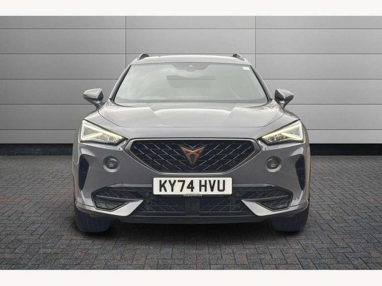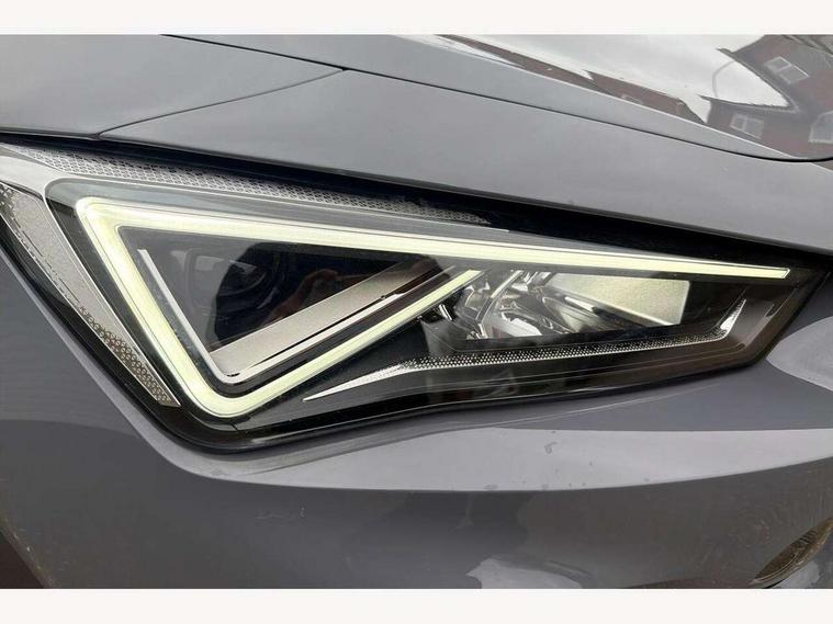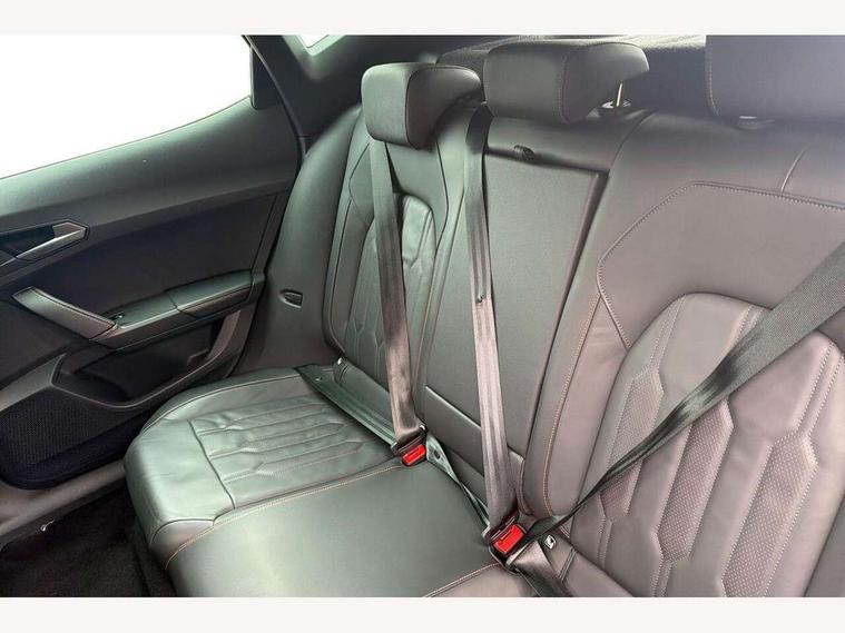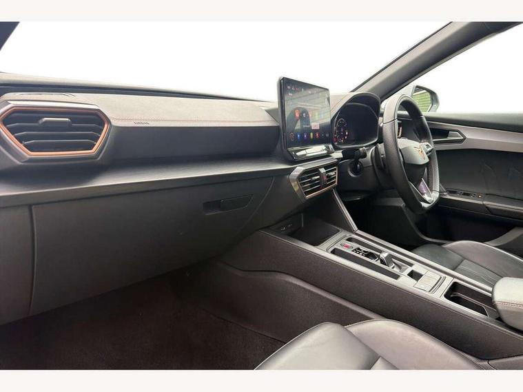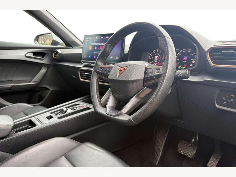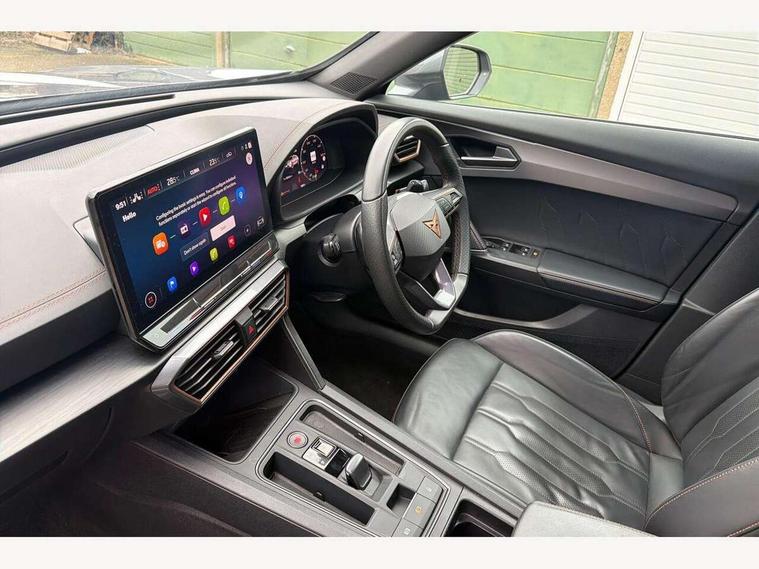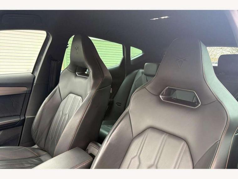 Digital cockpit and configurable dashboard, Driver alert system, Driving profile selection, Forward collision warning with automatic braking, Lane assist, Navigation system with 12'' Touchscreen Display, Park assist (inc front/rear parking sensors), PAS, Predictive adaptive cruise control with speed limiter, Rear view camera, RPM, trip computer, outside temp gauge, instrument light brightness, low fuel warning light, lights on reminder, gearshift indicator, Service interval indicator, Start/stop system with regenerative braking, Voice control system, Wired Android Auto, Wireless apple carplay, Wireless phone charger, Electronic locking differential and dynamic traction support, Standard suspension, 2 front and 2 rear USB type C sockets, Auxiliary input socket, DAB radio, Auto dimming rear view mirror, Body colour door handles, Body coloured bumpers, Dark grey wing mirror, Daytime running light with automatic headlight control and coming home feature, Dynamic headlight range control, Electric front/rear windows, Electrically adjustable heated and folding door mirrors with memory function, Front fog lamps with cornering function, Gloss black roof rails and window surrounds, LED Headlights, LED Taillights with dynamic indicator, Rain sensing wipers, Rear diffuser with black simulated exhaust pipes, Rear side wing doors, Rear wash/wipe, Third brake light, Tinted rear windows, Welcome lights, 12v power supply in centre console, 12V socket, 12v socket in loadspace, 2 front and 2 rear reading lights, 230V socket, 3 seat bench in 2nd row, 60/40 split rear bench seat with armrest and mechanical seat release, Black headlining, Dust/pollen filter, Front and rear head restraints, Front centre armrest, Height/reach adjust steering wheel, Illuminated interior front door sills, Illuminated sunvisor with mirror, Isofix, Leather multi function heated steering wheel with gear shift paddles, Luggage tie-down hooks, Single front passenger seat, Three zone climate control with control panel in rear, Variable luggage/load compartment floor, Wraparound lighting, Genuine Nappa leather Pack - Cupra, 3 point seatbelts on all rear seats, ABS, Brake control system - ESC and brake booster, Child proof door locks, Driver and front passenger airbags with front passenger airbag de-activation, Electronic parking brake, Front and rear disc brakes, Front side curtain airbags, Hill hold control, Public e-call, Seat belt reminder for front and rear seats, Tyre pressure monitoring system, Anti theft alarm system, Keyless entry and start system (KESSY), Locking wheel bolts, Copper and aluminium interior detailing, 19" 'Exclusive' machined sport matte black and silver alloy wheels,