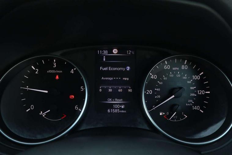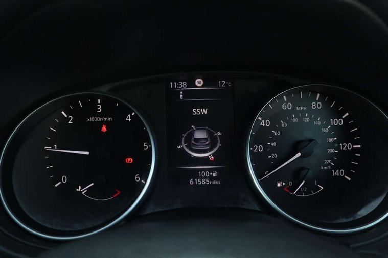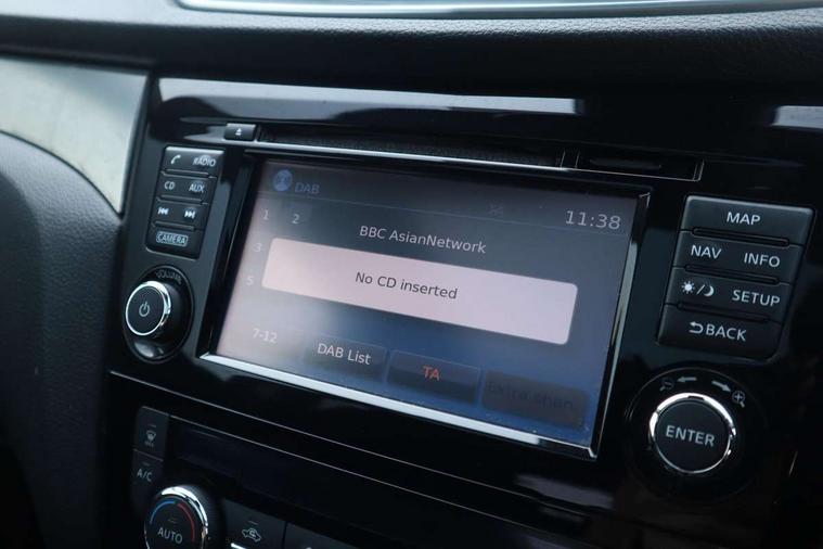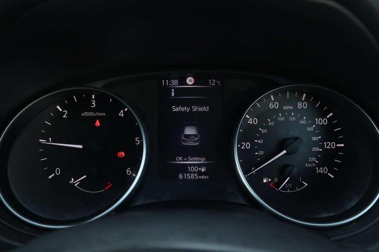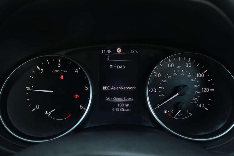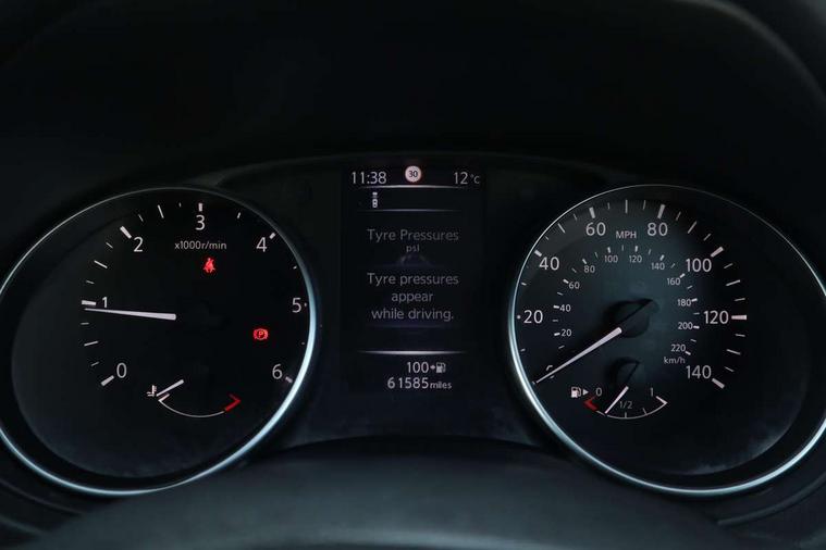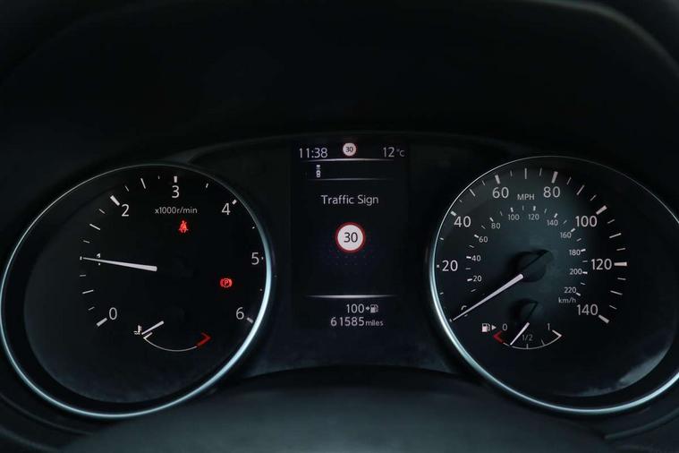 5" TFT driver information centre, Around View Monitor, Bluetooth phone integration system, Cruise control, Electric speed sensitive power steering, Front and rear parking sensors, Lane departure warning system, Nissan connect sat nav system, Outside temperature display, Push button starter, Rear view camera, Service interval indicator, Speed limiter, Traffic sign recognition, Trip computer, Diesel particulate filter, 'Shark fin' mobile antenna, 6 speakers, DAB Digital radio, Radio/CD, Smartphone apps, Steering wheel mounted audio controls, USB/aux input socket, Automatic headlamp activation, Body colour bumpers, Body colour door handles, Body colour door mirrors, Chrome window surround, Electric folding and heated door mirrors, Front fog lights, High beam assist, Interior mirror with auto anti dazzle, LED indicators in door mirrors, Matt silver roof rails, One touch electric front/rear windows, Privacy glass, Rain sensor windscreen wipers, Rear roof spoiler, Rear wiper, 2 X front 12v power sockets, 60/40 split folding rear seat, Ambient interior lighting, Centre console with armrest, Chrome interior door handles, Cloth upholstery, Configurable luggage board system, Driver + front passenger lumbar support, Dual zone climate control, Front and rear door pockets with bottle holders, Front headrests, Front seat belt pre-tensioners with load limiters, Height adjustable driver's seat, Height adjustable passenger seat, Illuminated electric window switch, Isofix child seat preparation, Leather gearknob, Leather interior door handles, Leather knee rest, Leather steering wheel, Luggage compartment lighting, Parcel shelf, Pollen filter, Rake/reach adjustable steering wheel, Rear armrest with 2 cupholders, Rear headrests, ABS, brake assist and EBD, Child locks on rear doors, Curtain airbags, Driver/front passenger airbag, Electronic parking brake, ESP + traction control, Forward emergency braking, Front passenger airbag deactivation, Height adjustable front seatbelts, Hill start assist, Seatbelt warning, Side airbags, Three 3 point rear seatbelts, Tyre pressure monitoring system, Alarm, Immobiliser, Intelligent Key, Remote central locking, Graphite interior trim, 18" Bi-colour alloy wheels, Tyre puncture repair kit,