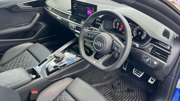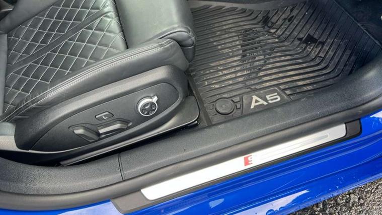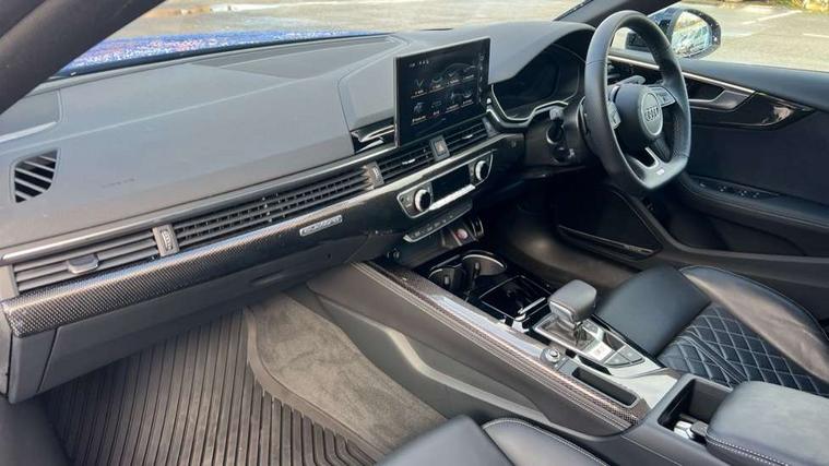 Audi connect safety and service (e-call), Audi drive select (Auto, Comfort, Dynamic, Efficiency and Individual), Audi phone box light with wireless charging, Audi smartphone interface, Audi virtual cockpit - 12.3" full colour digital instrument cluster, vehicle/engine speed, Radio/media information+Driver assistance systems, Automatic start-stop system with coasting functionality and efficiency programme, Bluetooth interface, Camera based traffic sign recognition, Electro-mechanical power steering, Email, calendar and text messages displayed via MMI, Lane departure warning, MMI nav+ with MMI touch - 10.1" high resolution MMI display, touch sensitive, 3D map, route/country info, dynamic route guide, personal route assist, Park assist system, Power operated tailgate, Rear view camera, S instrument dials, Service interval indicator, Voice control system, 58 Litre fuel tank, Diesel particulate filter, S sports suspension, Bang and Olufsen 3D sound system, CD player, DAB digital radio reception, Two additional USB ports for rear passenger in rear centre console, Two SDXC card slots, Audi Beam uses LEDs to project the Audi logo, Audi matrix LED headlights with LED rear lights + dynamic front and rear indicators, Audi rings and model badging in black, Auto dimming door mirrors, Auto dimming rear view mirror, Badges on front wing, Body colour door handles, Body colour front spoiler lip, Body colour side sill trim, Electric adjustable heated door mirrors, Electric folding door mirrors, Electric front windows, Front and rear bumpers with side skirts, Front fog lights, Headlight cleaning system, Kerb-view function for passenger side, LED daytime running lights, LED side indicator lights integrated into door mirrors, LED third brake light, Privacy glass, Rain and light sensors, Rear side wing doors, Rear wiper, S radiator grille in twilight grey matt with dual struts in aluminium and S5 logo, S rear diffuser in twilight grey matt and honeycomb grille in black, S rear spoiler, S specific dual branch chrome tailpipes with twin oval pipes on left and right, S specific side air inlets in titan black with chrome inlays in unique S design, Variable front intermittent wipers, Windscreen with acoustic glazing, 3 seat bench in 2nd row, 40/20/40 split folding 3 seater rear bench seat, Adjustable steering column, Black cloth headlining, Black perforated leather gearknob, Contrast stitching on seats, steering wheel and gear lever gaiter, Deluxe 3 zone electronic climate control, Electrically adjustable front seats, Fine nappa leather upholstery with S embossed logo + super sports seats, Front centre armrest, Front head restraints, Front/rear floor mats, Heated front seats, Illuminated door sill trim with S logo, ISOFIX child seat mounting and top tether, Key with S logo, Luggage compartment mat, Pneumatically adjustable lumbar support with massage function, Rear centre armrest, Rear headrests, Single front passenger seat, Stainless steel pedals, Sunvisors with vanity mirrors, Tool kit, Black styling pack - S5 Coupe/Sportback, Extended leather pack - A5, Extended LED interior light pack - A5/S5, 3x3 point rear seatbelts, 6 airbags - Driver, front passenger, curtain and side airbags, Attention and drowsiness assist, Brake calipers painted black with S logo at the front, Electromechanical parking brake, Electronic Stabilisation Control (ESC) including ABS, ASR and EDL, Front passenger airbag deactivation, Height adjustable front seatbelts, Hill hold assist, Manual child lock in rear doors, Multi collision brake assist, Pop-up bonnet for pedestrian protection, Pre sense city, S model enhanced braking system, Seatbelt monitoring, Tyre pressure warning, Variable restraint system, Warning triangle and first aid kit, Anti theft alarm system, Anti theft wheel bolts, Immobiliser, Keyless Go, Remote central locking, Tyre repair kit,