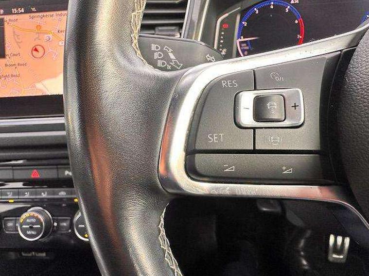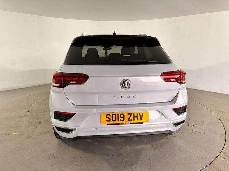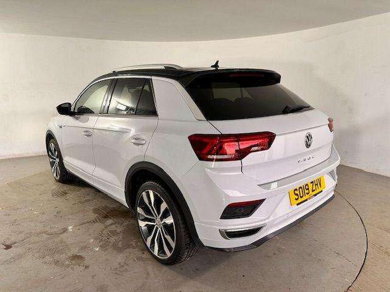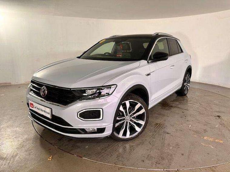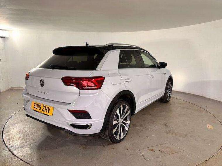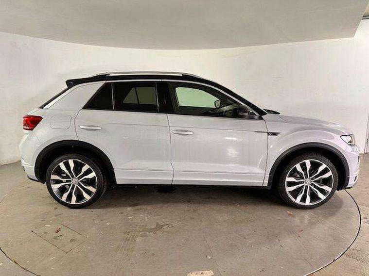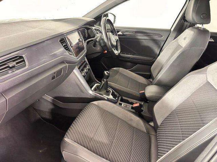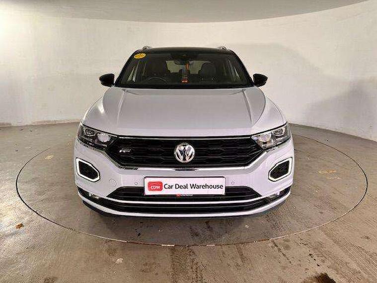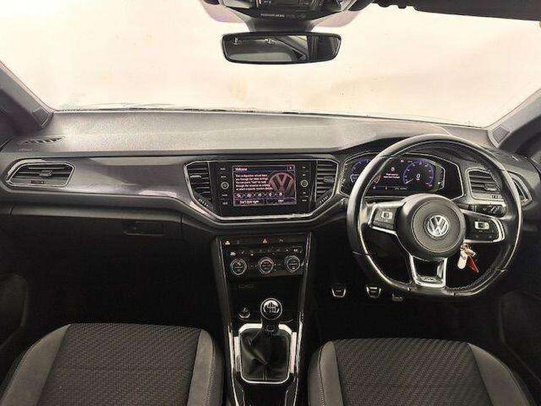 App-Connect, 2 USB connection charging sockets, Active Info Display, 10.3" high resolution TFT dash display screen with customised information, Adaptive cruise control, Automatic start/stop system, Bluetooth telephone and audio connection for compatible devices, Car information display, Car-Net Security and Service, Discover navigation, 8" touch screen navigation/infotainment system with Car-Net, European map, CD/radio, 2D/3D map and speed limiter, Driver alert system with audible and visual fatigue detection system, Driver profile selection, Dusk sensor, Front assist, radar sensor controlled distance monitor, city emergency braking + predictive pedestrian protection, Lane assist, Multifunction computer with visual gear change recommendation for fuel consumption, Progressive power assisted steering, Service interval indicator, Think blue trainer driver tips and journey analysis, Voice activation, Warning sound and light for doors and tailgate open, Warning sound and light for front seatbelts unfastened, Battery regeneration during braking, Bluetooth - Simultaneous pairing of 2 compatible mobile devices, DAB Digital radio, Dynamic navigation based on TMC+, Multi device interface (MDI) with USB connection, Music playback - MP3, WMA and AAC files, Premium USB cable in choice of either Apple or Android smartphone compatibility, SD card slot, SMS functionality - read, compose and send SMS messages using touch-screen display, Three route options - Fast, Short, Eco, Title and cover art display, Auto dimming interior rear view mirror, Automatic hazard lights activation under emergency braking, Black grained lower door protectors, Black grained wheel arches, Body colour door handles, Body colour rear roof spoiler, Chrome effect left and right trapezoid exhaust tailpipe fascia surround, Chrome trim on upper and lower radiator grille, Door mirror integrated indicators, Electrically foldable, adjustable and heated door mirrors with puddle lights and reverse activated kerb-view adjustment on passenger's door mirror, Front and rear electric windows, Front fog lights with static cornering function, Front windscreen wiper with intermittent wipe and 4 position delay, Fully galvanised body, Heated rear window, High level 3rd brake light, LED darkened rear light clusters, LED dipped and main beam headlights with automatic range adjustment including signature LED daytime running lights, LED rear number plate lights, Manual coming/automatic leaving home lighting function, Rain sensor, Rear tinted glass from B-pillar backwards approx 65% tinted, Rear windscreen washer and wiper with interval delay, 12V socket in centre console storage area, 2 LED front and rear reading lights, 3 rear head restraints, 4 load lashing points in luggage compartment, Aluminium pedals, Ambient lighting in front footwell and light strips below trim in front doors, Black roof lining and sun visors, Carbon flag cloth upholstery, Climate control - 2 zone electronic air conditioning with automatic air recirculation and allergy filter, Drawer under drivers seat, Front + rear carpet mats, Front centre armrest with storage compartment, longitudinal and height adjustable and two rear air vents, Front cupholders x 2, Front footwell illumination, Front seat back storage pockets, Front sport seats, Glovebox, Height adjustable front seats, Height/reach adjust steering wheel, Illuminated vanity mirrors, Instrument lighting, white adjustable panel illumination, Interior light delay, Isofix easy fit child seat preparation for 2 outer rear seats, Load through provision with single cup holder when folded down, Luggage compartment cover, removable, Luggage compartment lighting, R Line badge, Split folding rear seat backrests with centre armrest, Storage compartment in left and right luggage area, Storage compartment in rear doors, Storage compartments in driver and front passenger doors, Three spoke multi-function leather trimmed steering wheel and gearknob, Unique R Line door sill protectors, R line styling pack - T-Roc, Winter pack - T-Roc, 3 rear three point seatbelts, ABS, Driver and front passenger safety-optimised head restraints, Electronic parking brake with auto hold, ESC with EDL, ASR, EDTC and trailer stabilisation function, Front and rear curtain airbags, driver and front passenger airbags with passenger deactivation switch and front side impact airbags, Rigid safety cell with front and rear crumple zones, Three point height adjust front seatbelts + pretensioners, Tyre pressure loss indicator, Ventilated front and rear disc brakes, Volkswagen roadside assistance, Alarm with remote central locking and interior protection, Electronic engine immobiliser, Remote central locking with 2 remote folding keys, Caribou grey decorative inserts in dash and door panel, 19" Suzuka alloy wheels with low rolling resistance tyres and anti wheel bolts, Steel space saver spare wheel,