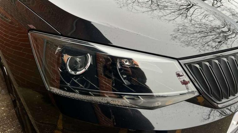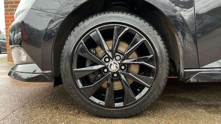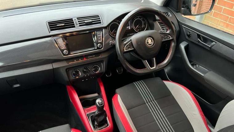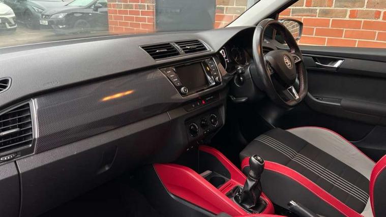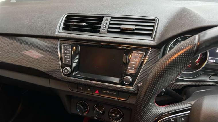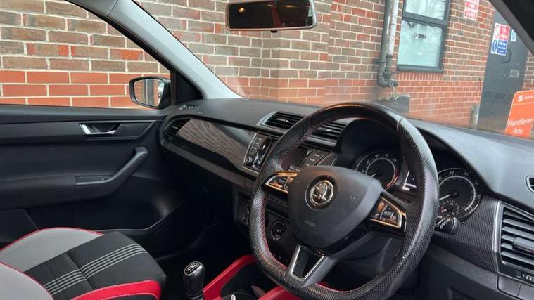 Bluetooth system, Exterior temperature gauge, Front assistant collision mitigation, Multi function trip computer, PAS, Service interval indicator, SmartLink, 6.5" touchscreen, Auxiliary socket for external MP3 player, Bolero Radio, DAB Digital radio, SD card slot, USB interface, Black door mirrors, Black radiator grille, Body colour bumpers, Body colour door handles, Body coloured rear spoiler, Electric front windows, Electrically adjustable and heated door mirrors, Fixed panoramic sunroof with black roof rails, Heated rear window, Height adjustable headlamps, Illuminated door sill inserts, Intermittent rear wash/wipe, LED daytime running lights, Rear diffuser, Tinted rear windows, Tinted windscreen, 1.5L bottle holder in front door panels, 2 height adjustable rear headrests, 3 spoke leather multifunction sports steering wheel with red stitching, 60/40 split folding rear seat, Boot stowage box, Cargo area storage tray, Cloth upholstery, Driver + passenger vanity mirrors, Floor mats with red stitching, Folding grab handles, Front reading lights, Front sports seats, Height adjustable driver's seat, Height adjustable front headrests, Height adjustable passenger seat, Height/reach adjust steering wheel, Interior light with delay, Leather gearshift, Leather handbrake, Lower glovebox cover, Luggage load hooks, Parcel shelf, Pearl grey carpets, Pearl grey headlining, Pollen filter, Rear courtesy light, Rear storage trays, Ticket holder, Two rear outer seat isofix location points, Umbrella under front passenger seat, Arkamys surround sound pack - Fabia, Chrome Pack - Fabia, 3x3 point rear seatbelts, ABS, Curtain airbags, Driver and passenger airbags, Driver and passenger side airbags, EDS, ESC with ASR, Front seatbelt pretensioners, Hydraulic Brake Assist (HBA), Passenger airbag deactivate switch, Seatbelt warning, Tyre pressure monitor, Alarm with interior monitoring, Immobiliser, Locking wheel bolts, Remote central locking, Black decorative inserts,
