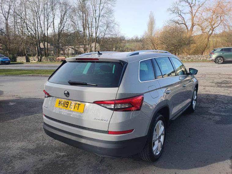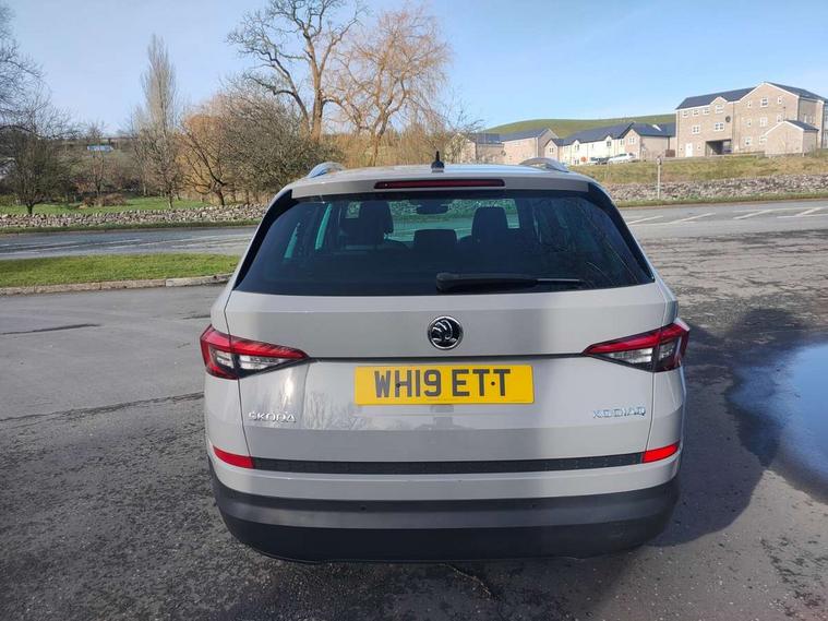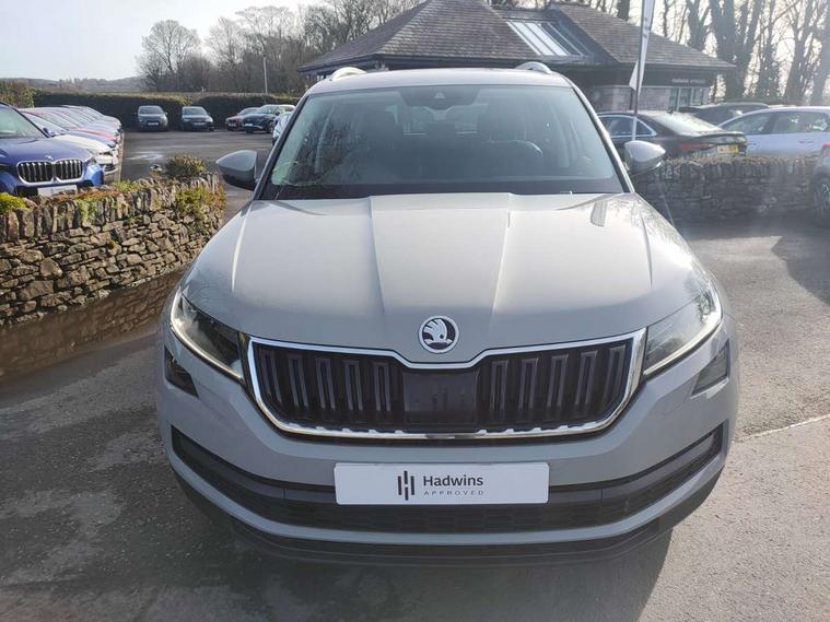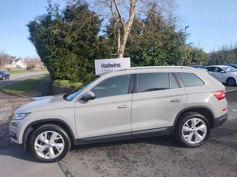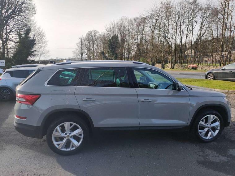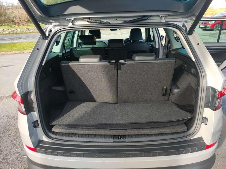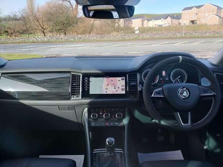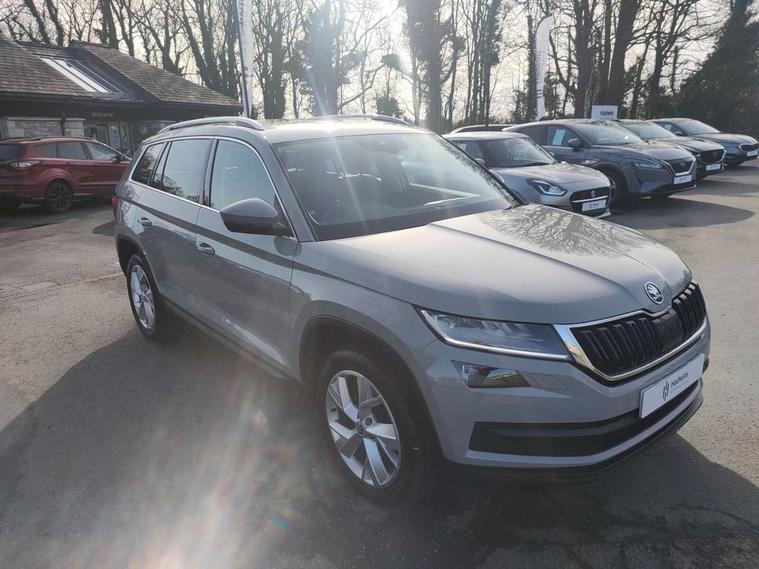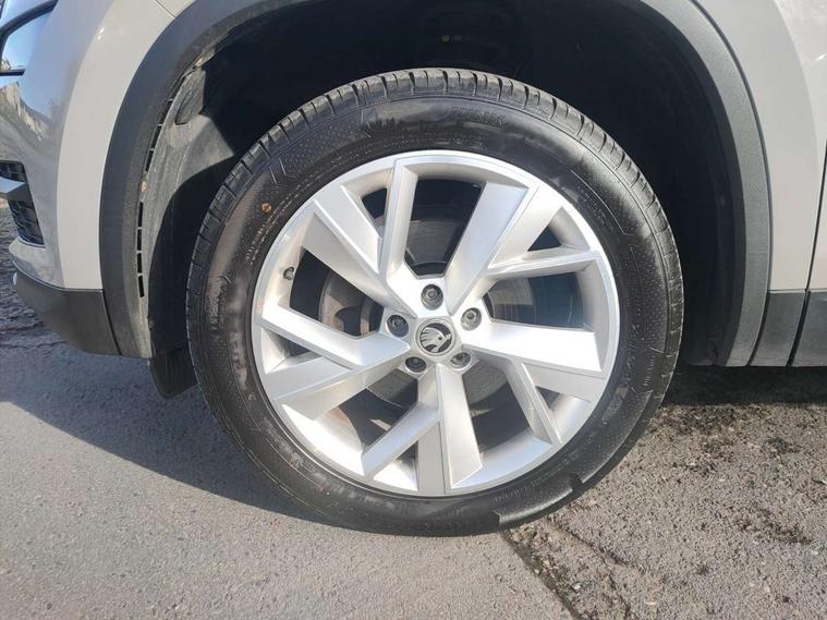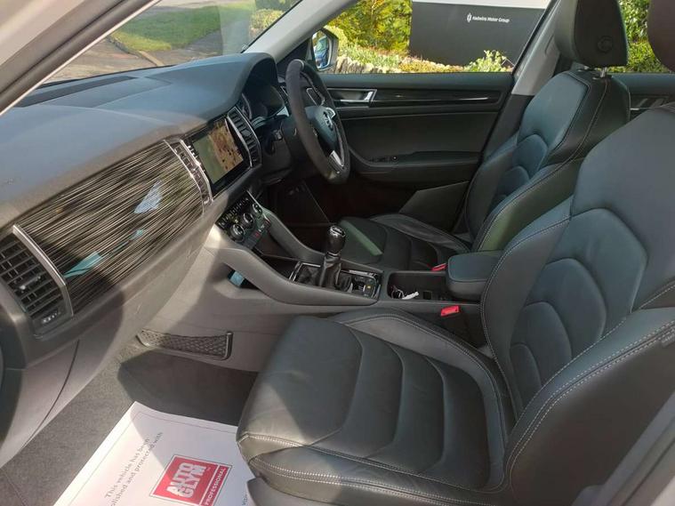 Bluetooth system, Colour multifunction trip computer, Columbus satellite navigation with 9.2" touch screen and integrated Wi-Fi + WLAN, Digital voice enhancement, Drive mode selector, ECO Stop/start function, Exterior temperature indicator, Phone box, SmartLink plus, Speed limiter, Tailgate unlocking from outside, Bolero Radio, DAB Digital radio, DVD System, USB and SD card connectivity, Aero front windscreen wipers with intermittent function, Aero rear window wiper, Auto dimming rear view mirror, Automatic activation of hazard warning lights, Black wheel arch surrounds, Body colour bumpers, Body colour door mirrors and handles, Electric front and rear windows, Electrically adjustable heated foldable and auto dimming door mirrors with boarding spots, Front and Rear door steps, Full LED Headlights with adaptive front light system and LED daytime running lights, Headlight washers, Heated rear window, High beam assist, Invisible tailpipe, LED front fog lights with static cornering light function, LED rear fog light, LED third brake light in rear spoiler, Light assistant (coming home/tunnel light), Radiator grille frame in matt black with chrome strip, Rain and light sensors, Rear spoiler, Safety reflectors on front and rear doors, Silver roof rails, Sunset privacy glass, Tinted windows, 12V socket in boot, 2 rails with 2 hooks including 4 hooks for net programme, 4 foldable roof handles with rear coat hooks, 4 lashing points on luggage floor, 60:40 foldable rear seat with sliding adjustment and backrest angle adjustment, Bottle holders in door panel in the 1.5 litre front and 1 litre rear, Cargo storage compartments, Centre console with open storage box, cup holder and 12V socket, Chrome headlight control button, Chrome interior door handles, Coat hooks on B pillar, Covered storage compartment on driver side, Electrically adjustable front seats with lumbar support and memory function, Front centre armrest with storage compartment, Front/rear courtesy lights, Gear shift lever with chrome frame and black gloss insert, Height adjustable front headrests, Illuminated and cooled glovebox, Illuminated luggage compartment, Isofix system on outer rear seats, Leather upholstery, Manually adjustable steering column, Net programme in boot (1x horizontal Net, 2x vertical Nets), Overhead glasses storage compartment, Passenger side net compartment on centre console, Pollen filter, Rear centre armrest with cupholders, Removable lamp in luggage compartment, Roll up luggage compartment cover with intermediate position, Small Bags on the inner sides of the front backrests, Small pockets on the inner side of the front backrests, Storage compartment in lower middle Instrument panel, illuminated with closing, Three rear height adjustable headrests, Ticket holder on A Pillar, Umbrella in door panel, Chrome pack - Kodiaq, Auto door release and activation of warning lights in the event of an accident, Driver and passenger airbags, Electronic parking brake with hill hold control, Emergency rear braking signal, ESC (incl. ABS+MSR+ASR+EDS+HBA+DSR+RBS+MKB), Front and rear three point safety belt on all seats, Front assist includes AEB city/urban, Front side airbags, Fuel cut off safety device, Head and knee airbags, Passenger airbag deactivate switch, Rear disc brakes, Safety vest holder in door, Seat belt reminder for all seats, Two tone horn, Tyre pressure monitor, Warning lights in front doors, Alarm with interior monitoring and tilt sensor with safe function, Immobiliser, Keyless entry and start system (KESSY), Remote central locking,