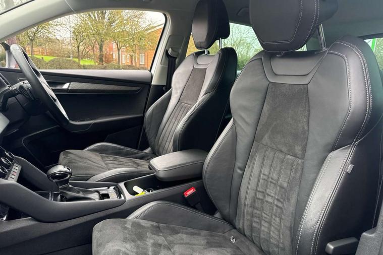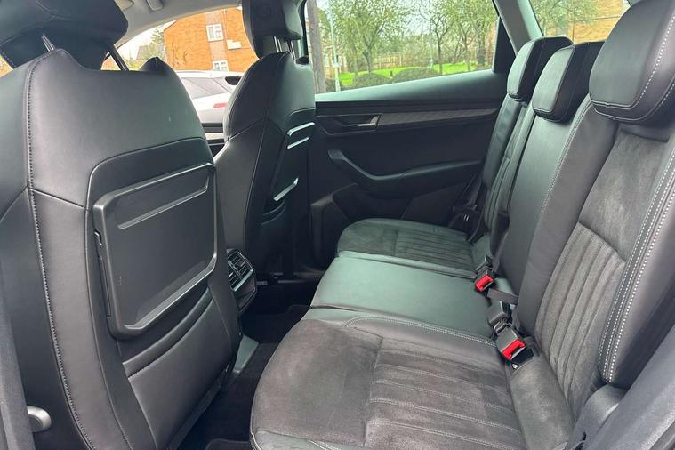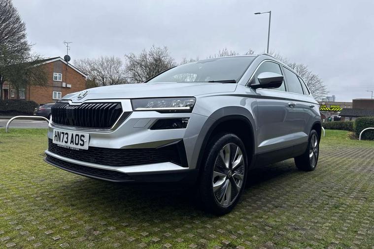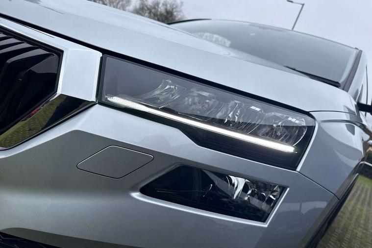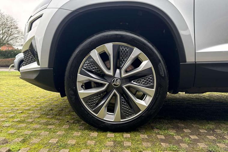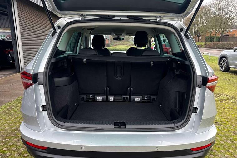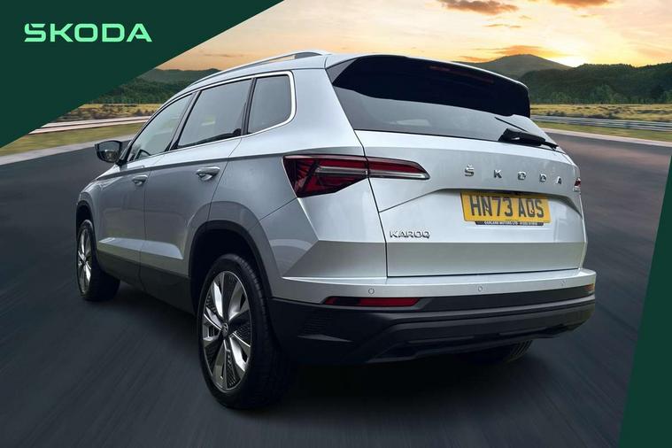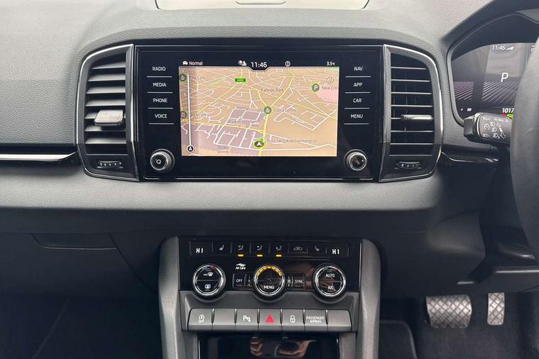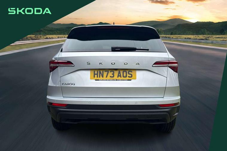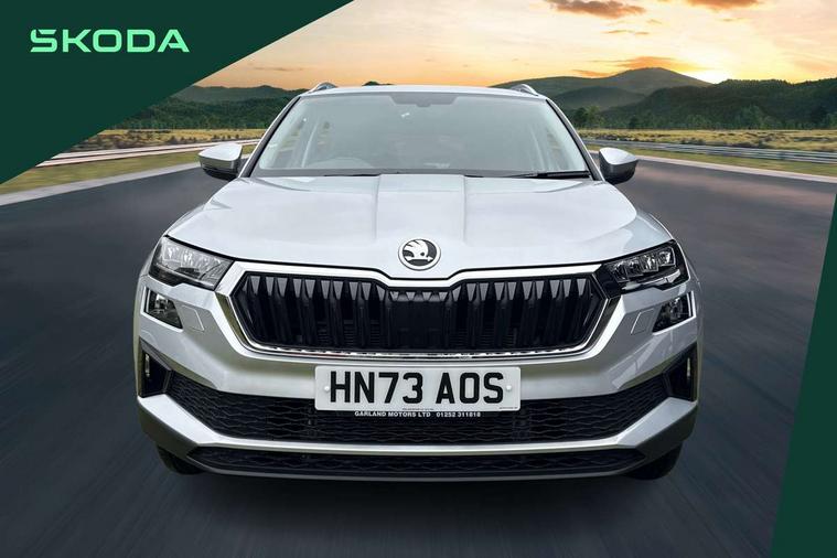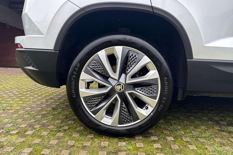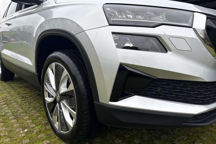 8" Digital display, Care connect, Driver fatigue sensor, Emergency services call system, Outside temperature gauge, Service interval indicator, SmartLink wireless for Apple and wired for Android, Start/stop system with regenerative braking, USB C Port x 2 in front centre console, 8 Speakers, DAB radio with Bluetooth, USB connection, Acoustic glass, Aero front windscreen wipers with intermittent function, Auto dimming rear view mirror with light and rain sensors, Black electric window control buttons, Body colour door mirrors and handles, Dynamic headlight range control with cornering light function, Electric front and rear windows with child proof lock, Heated rear windscreen, LED daytime running lights, LED rear lights with high functionality welcome effect and dynamic indicators, Light assistant (coming/leaving home/tunnel light), Plastic scuff plates, Privacy glass, Rear side wing doors, Rear spoiler, Rear window wiper with washer system and intermittent control, Safety reflectors on front doors, 1.5 litre bottle holders in driver and front passenger door panels, 12V socket in boot, 12v socket in front centre armrest with storage compartment and rear air vents, 2 spoke leather heated multifunction steering wheel with DSG paddles, 2 x Tablet holder, 3 rear height adjustable headrests, 3 seat bench in 2nd row, 4 foldable roof handles with rear coat hooks, Black floor carpet, Chrome inner door handles, Double sided boot floor, Foldable hooks in the boot, Front head restraints, Height adjustable front three point seats belts with tensioners, Height/reach adjust steering wheel, Ice scraper, Illuminated glovebox, Illuminated luggage compartment, Isofix child seat preparation for front passenger seat, Isofix child seat preparation outer rear, Manual lumbar support for front seats, Pen holder, Pollen filter, Rear boot cover, Rear reading lights, Rubbish bin door, Safety vest holder, Single front passenger seat, Storage box in upper central dashboard closed, Sunvisors with illuminated vanity mirrors, Textile floor mats, Ticket holder, VarioFlex seats with standard rear seat release, Boot pack - Karoq, Design Pack - Karoq, Parking pack - Karoq, Automatic door unlocking in case of crash, Automatic fuel cut off in case of crash, Child locks on rear doors, Driver airbag, Electronic parking brake with auto hold function, Emergency rear braking signal, ESC including ABS, MSR, ASR, EDS, HBA, DSR, RBS, MKB and traction control, Front side airbags, Hill hold control, Knee airbags, Passenger airbag with switch-off function, Pedestrian monitor, Seatbelt reminder signalisation and pretensioner for all seats, Three point seatbelts rear, Two tone horn, Tyre pressure display, Tyre pressure monitor, Alarm with interior monitoring, back up horn and tilt sensor with safe function, Electronic engine immobiliser, Keyless entry and start/stop, Remote central locking with 2 remote folding keys, Chrome framed air vents, 18" Miran alloy wheels in black, Anti-theft wheel bolts protection, Tool kit,