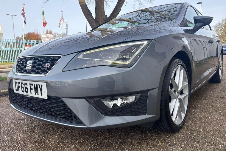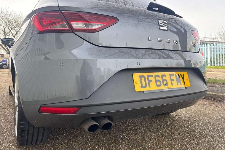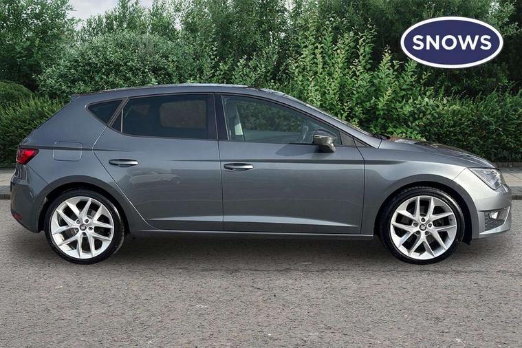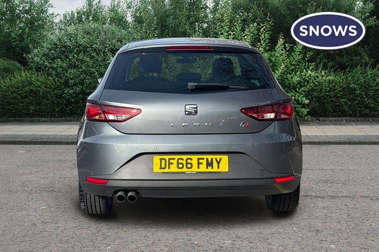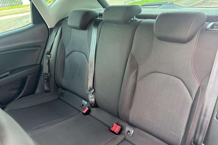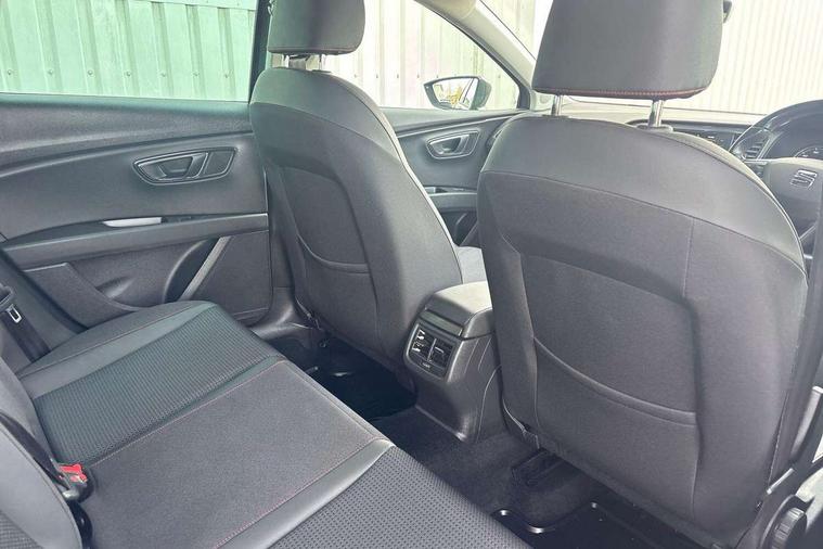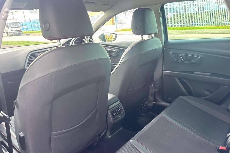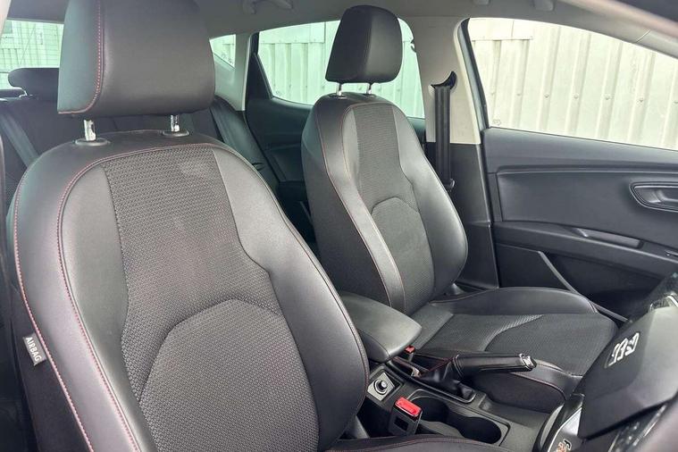 'Lights On' Reminder warning buzzer, 6.5" colour touchscreen with proximity sensor, Bluetooth Handsfree Phone Connection, Digital clock and outside temperature display, Low fuel warning light, Multi function display, Rear parking sensor, Remote fuel flap release, SEAT Drive profile, SEAT logo boot release, Service interval indicator, Touch screen display, Trip computer, Sports suspension, XDS electronic differential lock, Auxiliary input socket, Bluetooth audio streaming, DAB Digital radio, iPod connection, Radio/CD + MP3, SD card slot, Steering wheel mounted audio/phone controls, USB port, Aluminium front door sills, Body colour door handles, Body coloured bumpers, Chromed centre radiator grille surround, Cornering front fog lights, Dark tinted rear windows, Electric adjustable/heated/folding door mirrors, Electric front/rear windows with one touch/auto up/down, Electric headlamp adjustment, LED indicators in door mirrors, Rear wash/wipe, Reverse activated kerb-view adjustment on passenger's door mirror, 12v power point in centre console, 3 height adjustable rear headrests, Active head restraints, Additional heating and ventilation outlet in rear of centre console, Ambient lighting, Driver seat height/lumbar adjust, Driver/passenger sunvisors with illuminated vanity mirrors, Dual zone climate control, Dust/pollen filter, Front adjustable head restraints, Front armrest with storage box, Front cupholders x 2, Front map reading lights, Front seat and rear pockets, Front sports seats, Front/rear floor mats, Height/reach adjust steering wheel, Illuminated glovebox, Leather handbrake, Luggage tie-down hooks, Passenger seat height adjuster, Passenger seat lumbar adjust, Perforated leather steering wheel with red stitching + gear knob, Rear reading lights, Rear top tether child seat ISOFIX attachment, Split folding rear seat, Steering wheel gearshift paddles, Full LED headlight pack - Leon, 3 point seatbelts on all rear seats, ABS + traction control, Child proof door locks, Collision mitigation braking system, Curtain airbags, Driver/Front Passenger airbags, Drivers knee airbag, ESP+EBA, Front seatbelt pretensioners, Front Seatbelt warning, Front side airbags, Hill hold control, Manual passenger airbag deactivation function, Tyre pressure monitoring system, Engine immobiliser, Locking wheel bolts, Remote central locking + deadlocks, Second remote key, Volumetric alarm with back up horn, Chrome interior trim,