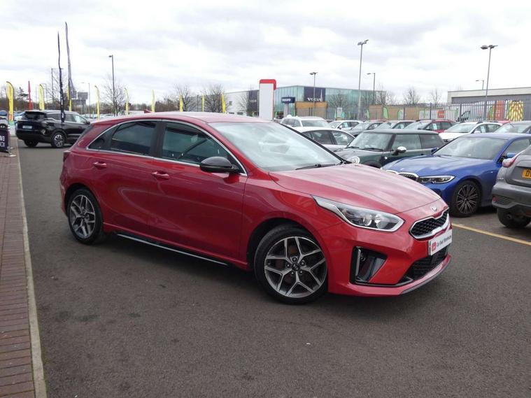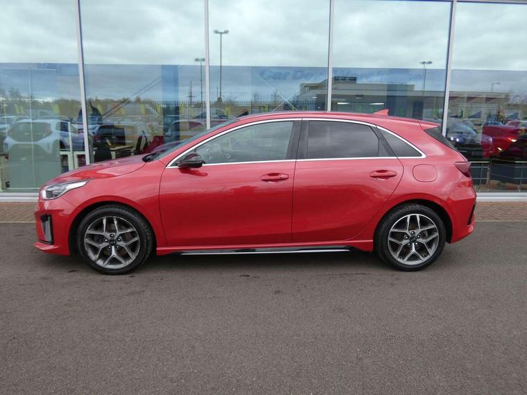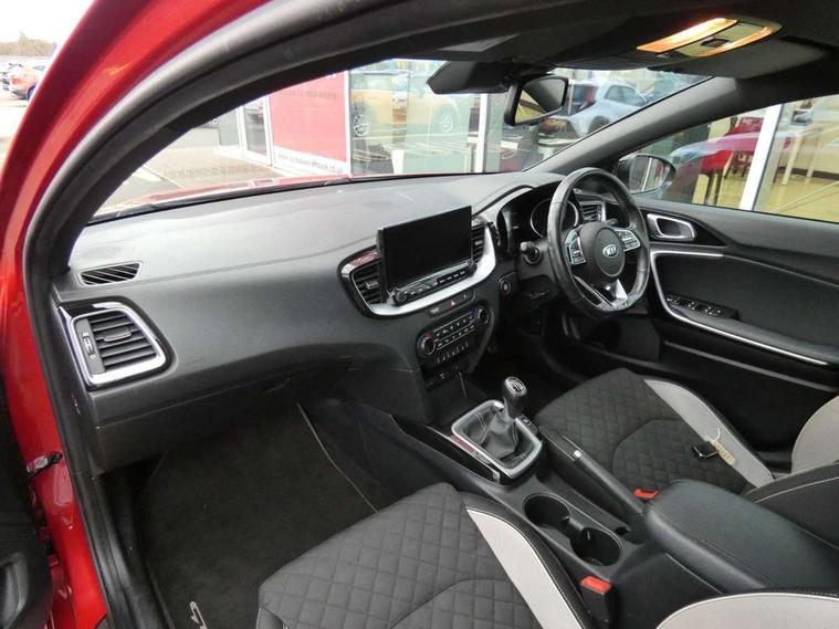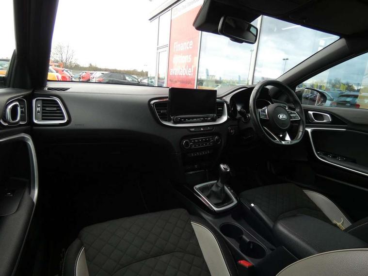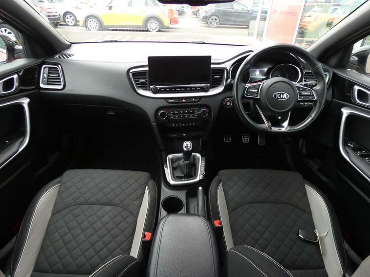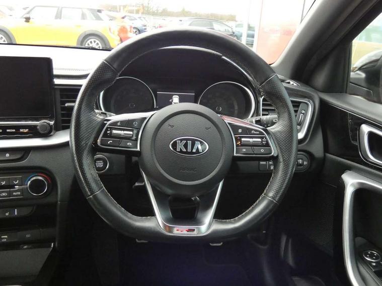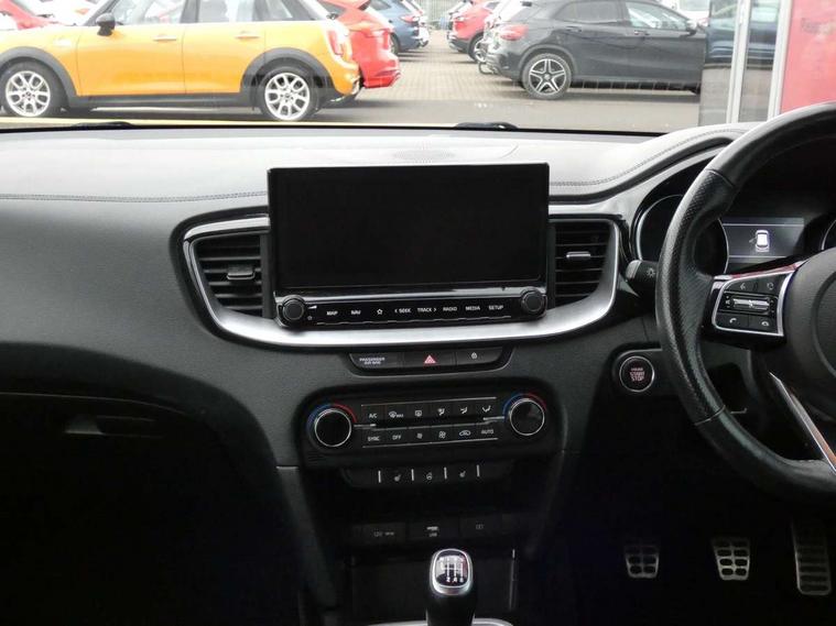 10.25" touchscreen satellite navigation including telematics, 4.2" supervision colour cluster display, Apple car play/Android Auto with voice control, Bluetooth with Voice Recognition & Music Streaming, Cruise control + speed limiter, Driver attention warning, Emergency stop signalling system, Forward Collision-Avoidance Assist (FCA) - City/Pedestrian, Kia connected services featuring TomTom live, Lane keep assist, Motor driven power steering, Outside temperature gauge, Rear parking sensor, Reversing camera with dynamic guide lines, Service interval indicator, Trip computer, Intelligent Stop and Go, 6 speaker audio system, DAB Radio with MP3, Illuminated USB & aux ports, Steering wheel mounted controls, USB & AUX Ports for Connection of a Media Device, USB Fast Charger in Front Centre Console, Air intake with black accent lower lip, All-round Electric Windows with Front Auto Up & Down Function, Auto dimming rear view mirror, Automatic defog system, Automatic headlights, Body colour bumpers, Body colour exterior door handles, Body coloured rear roof spoiler with high gloss black trim, Chrome window surround, Electric adjustable/heated/folding door mirrors with LED Indicators and Kerbside Lights, Front fog lights, Front wiper de-icer, Heated rear window with timer, High beam assist, High Gloss Black and Satin Chrome Radiator Grille, High gloss black door mirrors, High gloss black side sill mouldings, Illuminated front door handles, LED daytime running lights, LED High-mounted Brake Light, LED rear fog light, LED rear lights, Privacy glass (rear side windows and rear screen), Projection headlights, Rain sensing front wipers, Rear bumper with dual exhaust, Rear wash/wipe, Tinted glass, Wide view drivers door mirror, Windscreen Washer Level Warning, 12V socket in luggage compartment, 3 x passenger assist grips, 60/40 split folding rear seat, All-round height adjustable headrests, Aluminium pedals, Black headlining, Centre console storage box/armrest, Cloth/faux leather upholstery, Cupholders in centre console, Cupholders in rear armrest, Dash illumination dimmer switch, Driver & Front Passenger Sunvisors with Vanity Mirror Illumination & Ticket Holder, Driver + front passenger electric lumbar support, Driver's seat height adjuster, Dual Height Luggage Area Floor, Dual zone automatic air conditioning, Faux leather door trim, Front and rear door storage, Front map light with sunglasses case, Front Passenger Seat Height Adjuster, Front seat and rear pockets, Gear shift indicator, Heated front seats, Heated steering wheel, Interior door lock/unlock function, ISOFIX Child seat top tethers and anchor fixings, Leather D-Cut steering wheel with grey stitching, Leather handbrake, Leather steering wheel and gearshift, Luggage area light, Luggage area parcel shelf, Luggage hooks, Rear centre armrest, Rear coat hooks, Satin chrome interior door handles, Tilt/telescopic adjustable steering wheel, ABS with Electronic Brakeforce Distribution (EBD) and Brake Assist System (BAS), All round 3-point seatbelts, Dual front side airbags, Dual horn, Electronic stability control (ESC) and vehicle stability management (VSM), Front passenger airbag deactivation, Height adjustable front seatbelts, Hill start assist control (HAC), Impact sensing auto door unlocking, Rear door child safety locks, Seatbelt reminder warning, Traction control, Twin curtain airbags, Twin front airbags, Tyre pressure monitoring system, Alarm system, Engine Immobiliser & Deadlocks, Engine Start/Stop Button with Smart Entry System, Locking wheel nuts, Speed sensitive auto door locking, Black high gloss front console tray garnish & door trim, Satin Chrome Fascia Trim, 17" GT-Line alloy wheels, Tyre mobility kit,