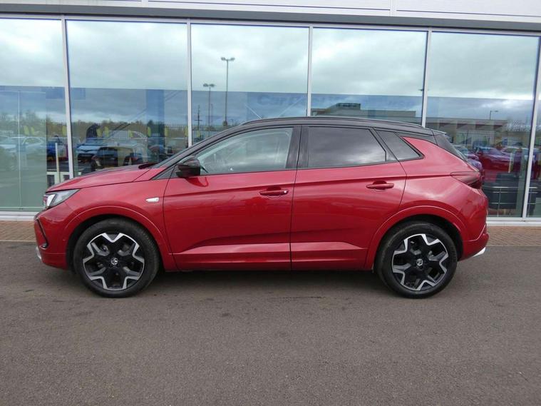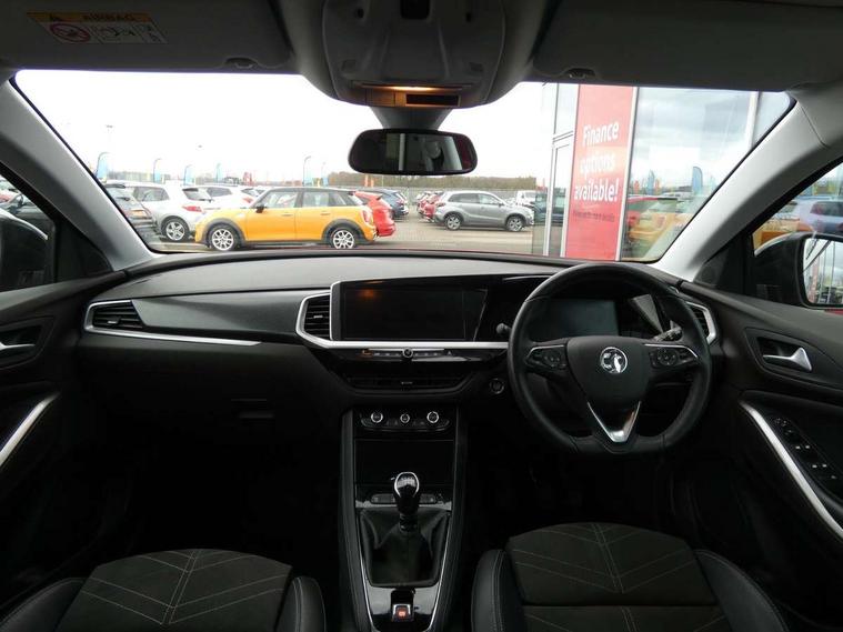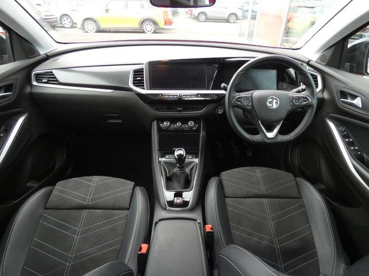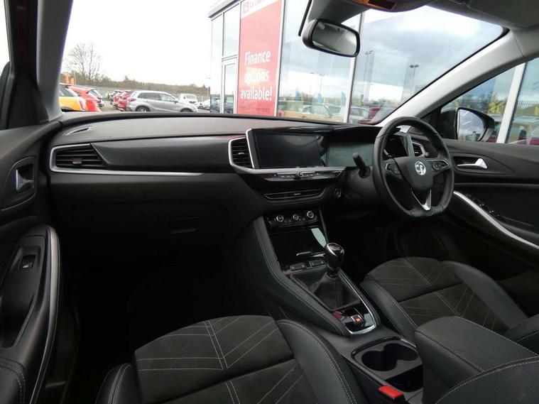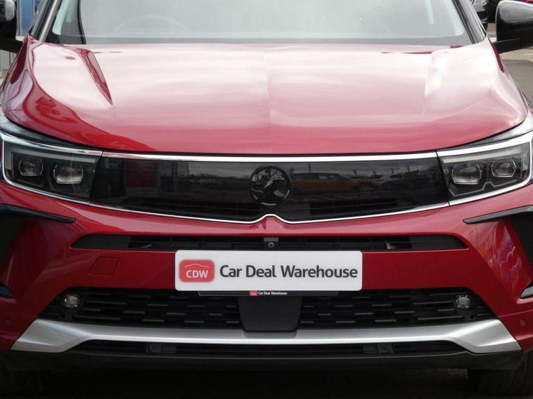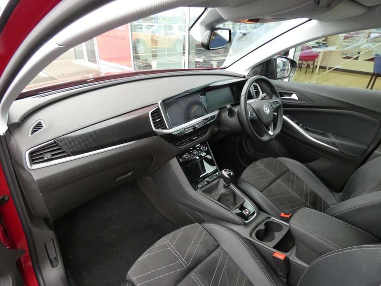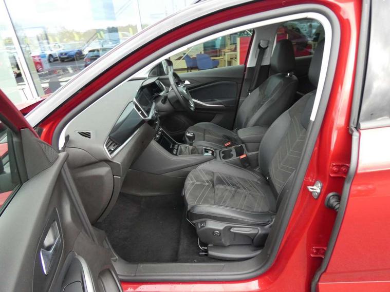 12" colour digital cluster, Central facia display with digital clock, outside air temperature and audio information, Cruise control with speed limiter, Digital fuel gauge with low fuel level warning light, Digital rev counter, Digital speedometer, Digital water temperature gauge with warning light, Driver drowsiness alert system, Driver information - Total mileage, service indicator, oil life, Front and rear parking distance sensors with 360 degree rear view camera and advanced park assist, Gearshift up/down indication light, Lane departure warning system, Lane keep assist, Lights on audible warning, Multi function trip computer - Trip odometer, vehicle range, average speed and fuel economy, instantaneous fuel economy and driving time, Multimedia navi pro with 10" colour touch+ sat nav+AM/FM/DAB radio, bluetooth audio streaming/mobile phone portal, Apple carplay/Android auto, USB, Power operated tailgate with foot sensor, Side blind spot alert, Speed sensitive electric power assisted steering, Speed sign recognition, Vauxhall connect including Emergency call (SOS e-call) and Breakdown call (b-call), Wireless charger for mobile devices, Anti-roll bars, Compound crank rear suspension with coil springs and gas pressure dampers, Independent decoupled MacPherson strut front suspension with gas pressure dampers and coil springs, anti-roll bar, Six speaker - four front + two rear, Steering wheel mounted audio/phone/cruise controls, Alloy effect front and rear skid plates, Automatic lighting control, Automatically dimming anti dazzle rear view mirror, Black door mirrors, Black roof, Black side window trim, Body colour door handles, Body colour lower front and rear bumpers, protective wheel arches and lower door cladding, Body colour upper front bumper, Collapsible windscreen wipers, Dark tinted rear side and tailgate windows, Door to door illumination, Electrically operated front and rear windows with safety auto reverse and one touch up/down facility, Front wiper system spraying directly from wipers, Hazard warning lights, Heated rear screen with timed cut off, Heated windscreen, High beam assist, High gloss black Griffin for Vizor and tailgate with high gloss black Grandland tailgate lettering, High gloss black roof rails, High level centre rear brake light, IntelliLux adaptive LED pixel headlights and LED tail lights, Intermittent rear window wash/wipe, LED daytime running lights, LED front fog lights, Magic wash, Manual headlight beam levelling, Rain sensor windscreen wipers, Rear side wing doors, Rear spoiler, Reversing light, Shark fin aerial, Silver effect protective front and rear skid plate, Soundproof insulated windscreen, Tinted windows, Twin electrically adjustable and heated power door mirrors (wide-angle on drivers side) with automatic timed cut-off, Two speed windscreen wipers with variable intermittent wipe, Upper and lower bumper design, Vizor front grille, Welcome lighting, 12v plug in front console and 12v plug in boot, 3 bench rear seats in 2nd row, 3 spoke flat bottom leather steering wheel with satin chrome effect bezel, 4 way electric driver lumbar support, 4 way passenger electric lumbar support, 60/40 split folding rear seat with centre rear seat armrest and load though facility, Advanced predictive logic control system using a sun sensor, Alcantara upholstery, Ambient centre console downlighter, Automatic air direction and fan speed with manual override, Charcoal filter, Chrome effect interior door handles, Covered storage compartment in centre console and in driver armrest, Driver's centre armrest, Drivers and front passengers seat with height, reach, tilt, backrest adjustment and seat cushion extension, Dual zone electronic climate control, Ergonomic active drivers sports style seat, Ergonomic active front passenger sports style seat, Front door pockets with 2.6 litre capacity, Front seat back storage pockets, Fully carpeted luggage area, Height adjustable headrests, Illuminated driver/passenger sunvisors with vanity mirror, Illuminated luggage area, ISOFIX on front passenger and rear outer seats, Luggage compartment cover, Reach + rake adjustable steering column, Rear centre seat head restraint, Rear door pockets with 1.8 litre capacity, Rear passenger compartment heating ducts, Rear reading lights, Two drinks holders in centre console, Winter pack - Grandland, Anti-lock braking system (ABS), Automatic emergency braking with pedestrian detection, Child proof locks on rear doors, CSC - Cornering stability control, Deactivation switch for front passenger front and side impact airbags, Deflation detection system, Driver airbag, Dual seatbelt pretensioners on front seats, EBD - Electronic brakeforce distribution, Electronic parking brake, Electronic stability program (ESP) including traction control, Front brake ventilated disc 304mm diameter, Front passenger airbag, Front seat side impact airbags, Full size curtain airbags for driver, front seat passenger and outer rear seat passengers, Hill start assist, Hydraulic Brake Assist (HBA), Inertia reel lap and diagonal seatbelts for all seats, Load limiters on outer rear seatbelt retractors, Pretensioners on outer rear seatbelt retractors, Rear brake ventilated disc 268mm diameter, Smart seatbelt reminder for front and rear seats, Tyre pressure monitoring system, Deadlocking system, Electronically protected audio equipment, Engine deadlock immobiliser, Keyless entry and start, Locking wheel nuts, Remote control central locking activation switch on driver door, Remote security alarm system, Black door panels with black premium leather effect inserts, Dax decor facia panel with palladium medium finish, 19" diamond cut bi-colour alloy wheel, Tyre inflation kit,