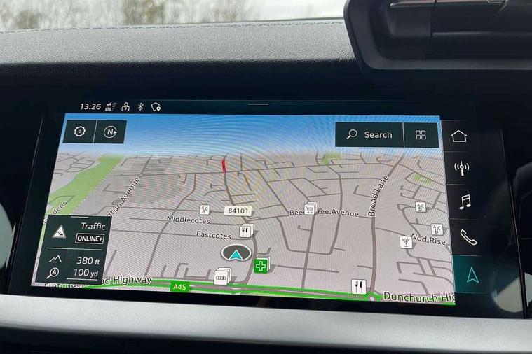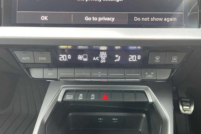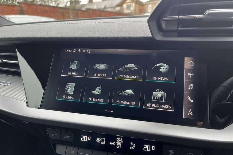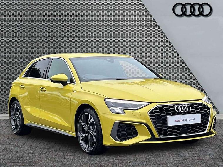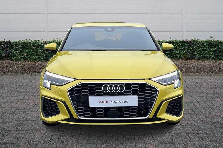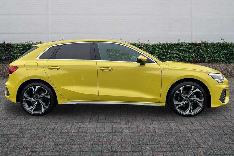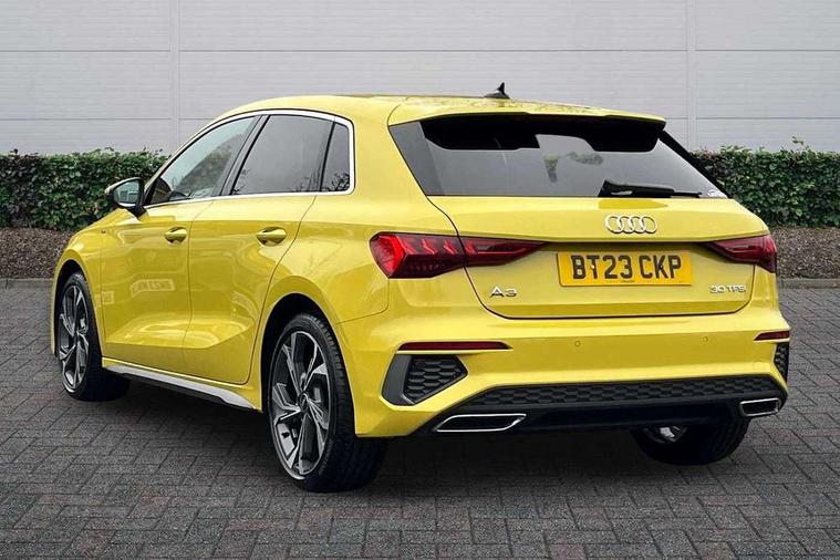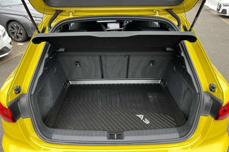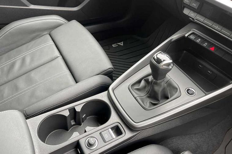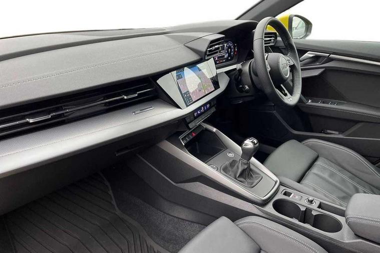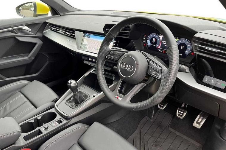 Audi drive select (Auto, Comfort, Dynamic and Individual), Audi smartphone interface, Audi Virtual Cockpit - 10.25" digital and colour instrument cluster, Automatic start/stop system with recuperation, Bluetooth interface, Camera based traffic sign recognition, Collision avoidance assistant, Cruise control, e-Call (emergency call), Electromechanical power speed sensitive steering, Lane departure warning system, MMI Navigation Plus with high resolution 10.1" colour touch screen display, Rear parking sensors, Service indicator, Trip computer, Voice control system with natural language interaction, Sports suspension, 2xUSB-C connection with data and charging functions, 6 passive loudspeakers, DAB Digital radio, 3rd brake light, Acoustic glass windscreen, Aluminium window trim, Auto dimming frameless rear view mirror, Body colour exterior mirrors, Electrically adjustable/heated/folding/dimming door mirrors with kerb view includes integrated LED indications + kerb view function for passenger side, Front electric windows, Illuminated aluminium inserts front door sills with S logo, LED daytime running lights, LED headlights with LED rear lights and dynamic rear indicators, Light and rain sensors, Privacy glass - dark tinted rear window, rear door and side windows, Rear electric windows, Rear side air outlets in grained matt black, Rear side wing doors, Rear wiper, S line bumpers, S roof spoiler, 12V socket and storage compartment in front centre console, 3 seat bench in 2nd row, 3 spoke leather multifunction steering wheel, 4 way electrically adjustable lumbar support for driver and front passenger, 60/40 split folding rear seat bench, Black cloth headlining, Dual zone electronic climate control, Front and rear centre armrest in leather, Front and rear headrests, Front/rear floor mats, Height and reach adjustable steering wheel, Interior lighting - glove compartment light and right hand side, Luggage compartment floor covering, Manual boot compartment lid, Manually adjustable front seats, Seat side bolsters, Single front passenger seat, Stainless steel pedals and front footrest in black, Twin leather upholstery with front sports seats S embossed logo, Aluminium interior elements pack - A3 Sportback, LED interior lighting pack - A3 Sportback, S line styling pack - A3 Sportback, 3x3 point rear seat belts, Driver and front passenger airbag with passenger airbag deactivation, Electronic Stabilisation Control (ESC) including ABS, ASR and EDL, First aid kit with warning triangle and 2 safety vests, Front side airbags with head airbags and interaction airbag, Pre-sense front with pedestrian and cyclist detection, Seatbelt monitoring, Tyre pressure loss indicator, Anti theft alarm, Anti-theft wheel bolts, Electronically operated child lock, Immobiliser, Remote control central locking, Dark spectrum aluminium inlays, accent surfaces in the dashboard and centre console in platinum grey silk effect paint finish,