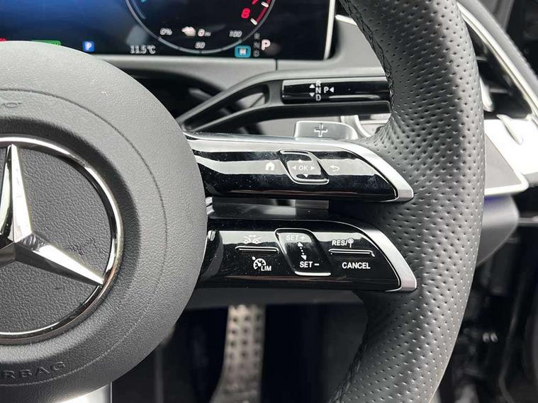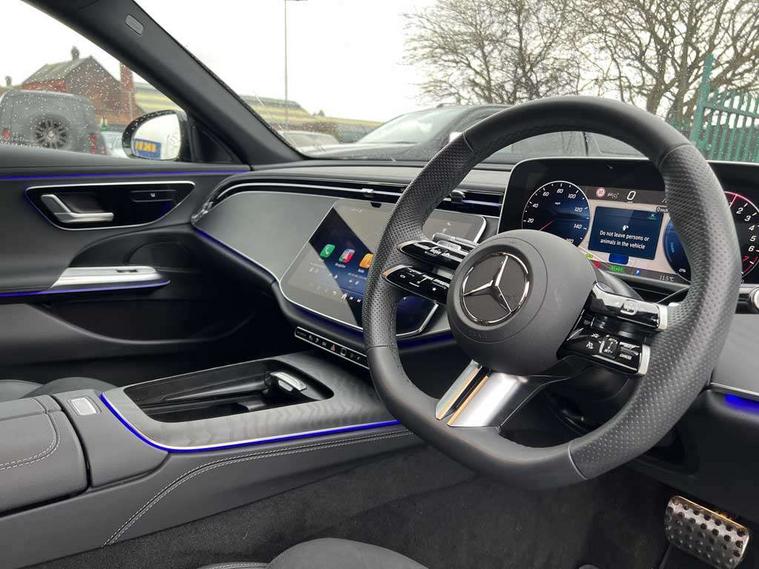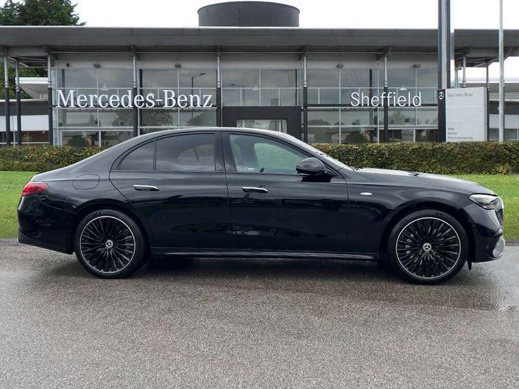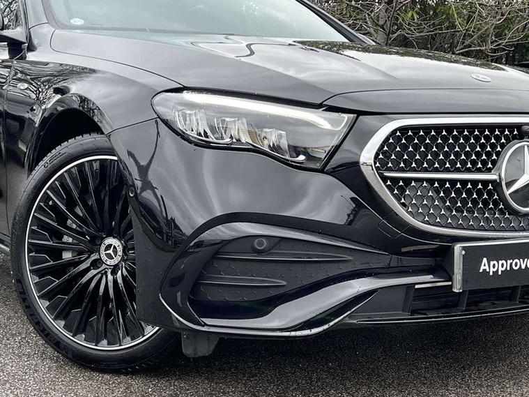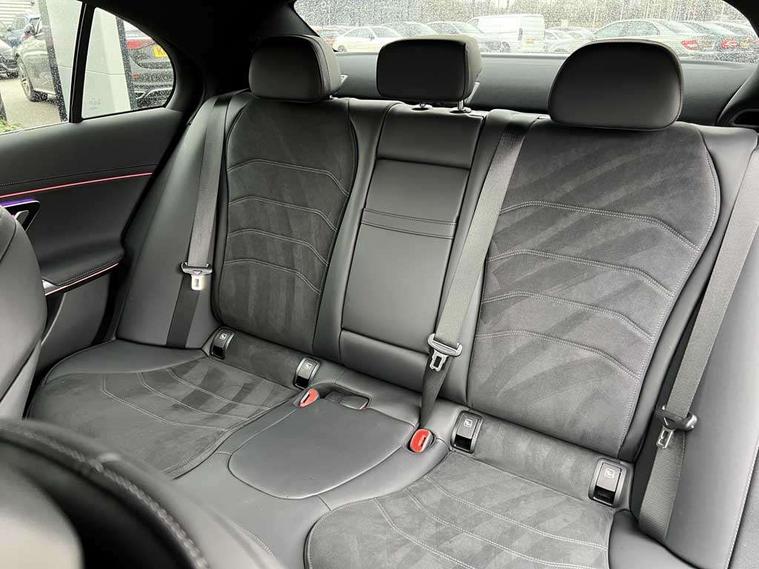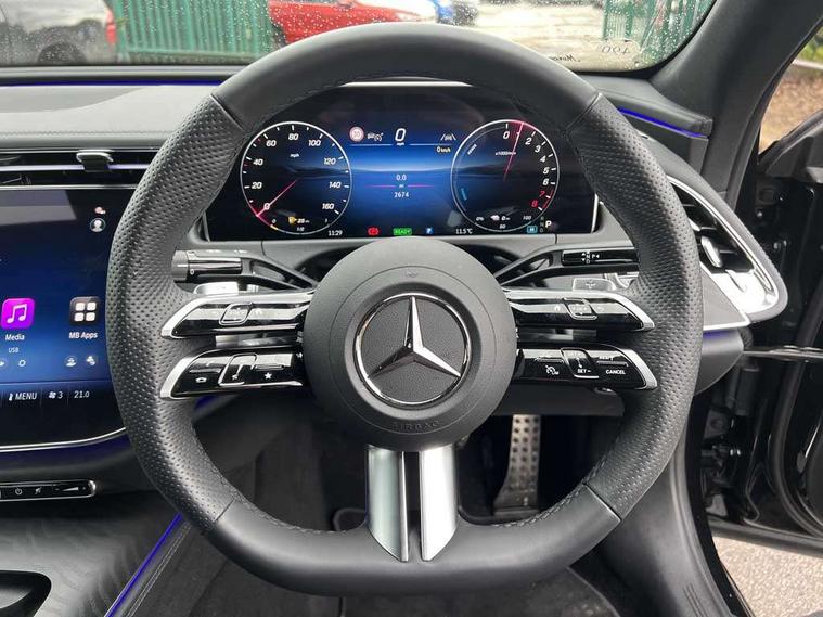 12.3" high resolution cockpit display, 14.4" high resolution central media display with latest MBUX generation, 5G Communications module, Acoustic presence indicator, Active lane keeping assist, Attention assist, Blind spot assist, Bluetooth, Brake wear warning display, Direct steer speed sensitive steering, ECO start/stop function, Evasive manoeuvre support, Fingerprint scanner, Fluorescent jacket for driver, Hard disc navigation, MBUX navigation premium, MBUX voice control, Mercedes me connect including emergency call system, accident recovery, breakdown and maintenance management, Outside temperature display, Preinstallation for live traffic, Remote and charging services plus, Remote Services Premium, Service indicator (ASSYST), Status display for rear seat belts in instrument cluster, Traffic sign assist, Trip computer in multifunction display showing current fuel consumption, Wireless charging, Wireless smartphone integration with Apple CarPlay and Android auto, 50 litre fuel tank, 9G TRONIC automatic transmission, AC charging, Agility control suspension with selective damping system, Charging cable for household socket, DC charging, Mode 3 charging cable for public charging and domestic charging stations, Sporty engine sound system, DAB Digital radio, Preinstallation for MBUX Entertainment Plus, 3rd brake light, Adaptive brake lights, Aerial integrated in rear window, AMG Line exterior, Auto dimming driver's door mirror, Auto dimming rear view mirror, Digital air vent control, Electric folding door mirrors, Electric windows with one touch opening/closing and obstruction sensors, Electrically adjustable and heated door mirrors, EQ badging, Heat insulating privacy glass, LED daytime running lights, LED high performance headlights with adaptive highbeam assist, Pre-installation for roof rail systems, Rear boot, Rear side wing doors, Surround lighting with logo projection, 3 seat bench in 2nd row, 4 way lumbar support, Ambient lighting, AMG brushed stainless steel sports pedals with rubber studs, AMG floor mats, AMG line interior, Artico/Microcut microfibre upholstery, Automatic child seat recognition sensor, Central stowage compartment with USB socket for use with Android Auto and Apple CarPlay, Courtesy lights in rear grab handles with reading light functionality, Folding rear seat backrest, Front centre armrest with stowage compartment, Gearshift paddles in galvanised silver, Glove compartment - lockable, air conditioned and illuminated, Head restraints for driver and front passenger (four-way adjustability) and in rear (two-way), Heated front seats, Instrument panel and door beltlines in artico nappa look leather, Multifunction sports steering wheel in nappa leather, Roof liner in black fabric, Seat occupancy sensor for front passenger seat, Single front passenger seat, Sports seats, Steering wheel touch control buttons for audio and onboard settings, Sunvisors with illuminated vanity mirrors, THERMATIC 2 zone automatic climate control, Night pack - E class, Parking package with 180 degree camera - E Class, USB plus package - E Class, 3x3 point rear seatbelts, Active bonnet pedestrian safety measure which detects an impact and raises bonnet, Adaptive brake system with HOLD function and brake drying in the wet, Anti-lock braking system (ABS), Automatic front passenger airbag deactivation, Central airbag, Childproof locks manually operated for rear doors and electrically operated for rear power windows, Driver and front passenger airbags, Electronic parking brake, Electronic Stability Programme, Hill start assist, ISOFIX child seat attachment points two outer rear seats, Knee airbags, Pedestrian protection, Pre-Safe anticipatory safety system, Tyre pressure monitoring system, Warning triangle and first aid kit, Window airbags, Alarm system/interior protection/immobiliser, Central locking with interior switch, automatic locking and crash sensor with emergency opening function, Guard 360 degree vehicle protection, Increased anti theft protection, Keyless Go, Urban guard vehicle protection plus, Centre console and dash trim in silver metallic mixted fabric, 20" AMG multispoke design alloy wheels painted in black with high sheen rim flange, Summer tyres, TIREFIT with tyre inflation compressor,