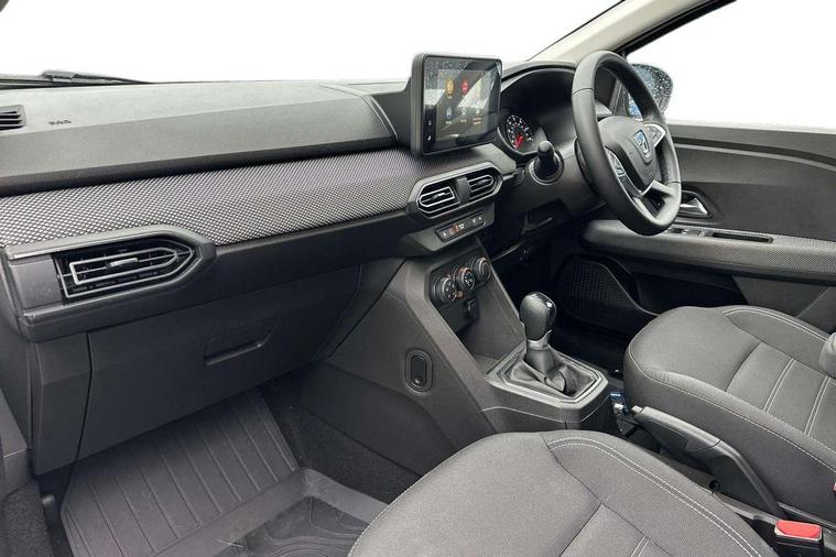 3.5" TFT instrument panel with on-board computer, Cruise control with speed limiter, eCall emergency call system, Eco mode, Electric power assisted steering, Rear parking sensors, Rev counter, Reversing camera, Stop/start system, 8" Media display - DAB radio, smartphone replication, bluetooth, 4 speakers, Apple CarPlay and Android Auto, Pre-wiring for radio and speakers, USB connection for data transfer and charging, USB socket, 3 speed windscreen wipers, Auto lighting, Automatic wipers, Black radiator grille, Body colour door handles, Body colour door mirrors, Body coloured bumpers, Electrically adjustable and heated door mirrors, Front fog lights, Heated rear window, High level third brake light, LED automatic daytime running lights, LED Y shape Dacia signature lighting, One touch electric front windows, Rain sensor, Rear electric windows, Rear side wing doors, Rear wash/wipe, Tinted windows, 1/3 to 2/3 split folding rear seats, 12 volt front socket, 12 volt rear socket, 3 height adjustable rear headrests, 3 seat rear bench, Double satin chrome air vents, Driver + passenger vanity mirrors, Fabric upholstery, Fixed smartphone holder on dashboard, Front armrest, Height adjustable driver seat, Height adjustable front headrests, Height/depth adjustable steering wheel, Isofix points for child seats in both outer rear seats, Manual air conditioning, Satin chrome interior door handles, Single front passenger seat, Soft feel steering wheel, Steering wheel controls, 3x3 point rear seatbelts, ABS and Emergency brake assist, Automatic emergency braking system, Child locks on rear doors, Door open warning, Driver airbag, ESC (Electronic Stability Control), ESP (Electronic Stability Program) + Hill Start Assist, Front curtain airbags, Front seatbelt pretensioners, Front side airbags, Height adjustable front seatbelts, Passenger airbag, Seatbelt reminder for driver and front passenger, Tyre pressure monitor, Automatic central locking, Immobiliser, Keyless entry, Remote central locking, Decopart on instrument panel and door with textile, 15" Flex wheels with full wheel cap,