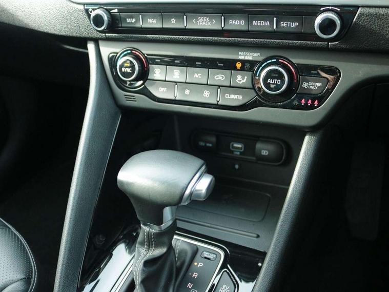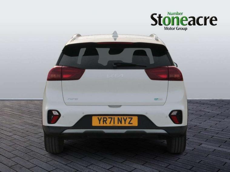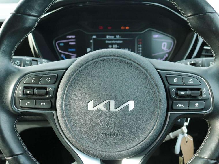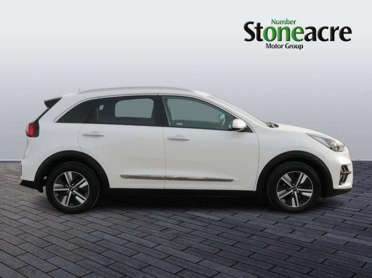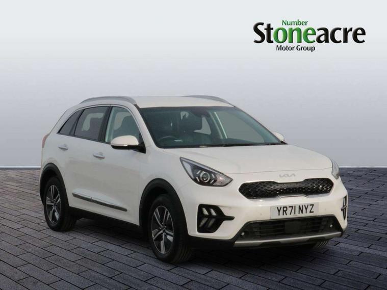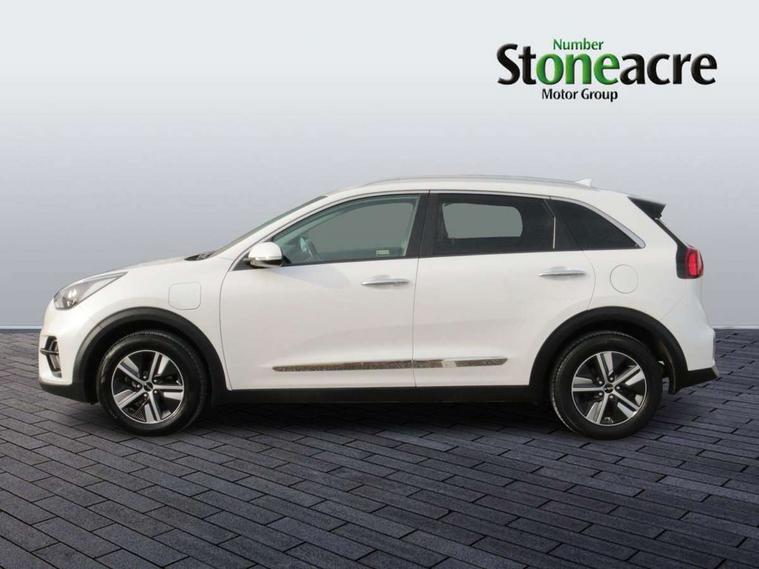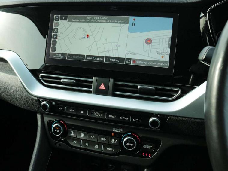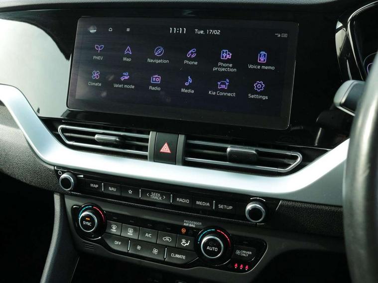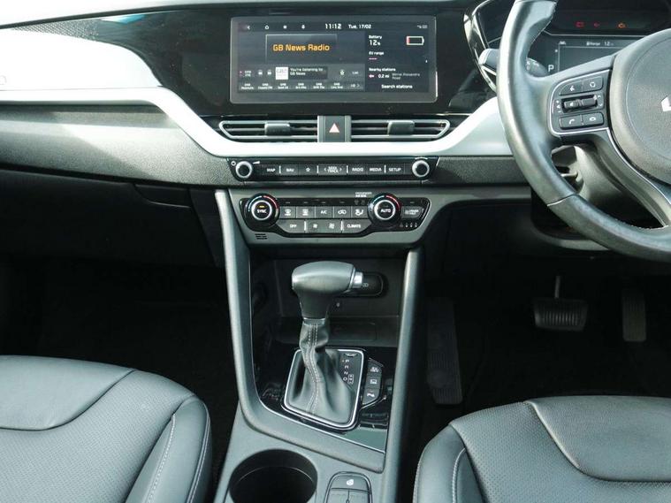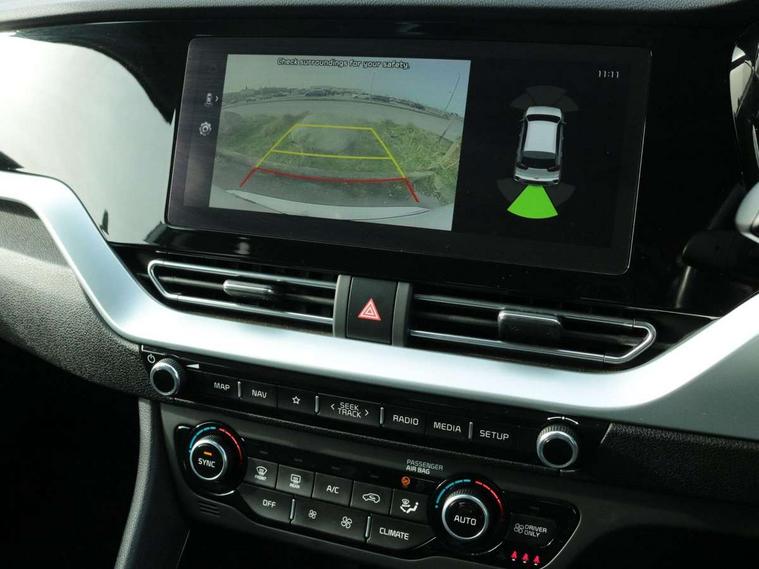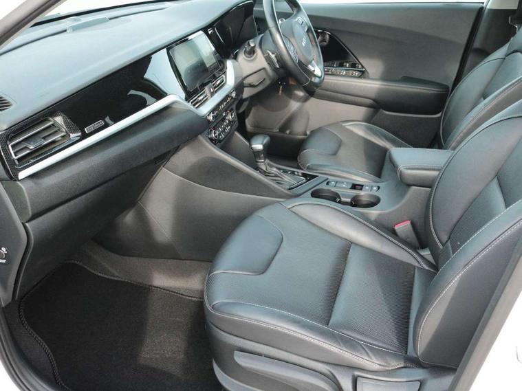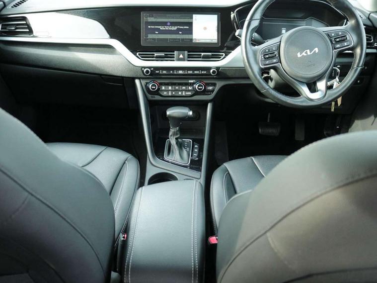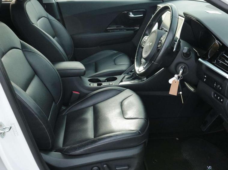 10.25" Touch screen satellite navigation with european mapping and traffic messaging channel, 7" full supervision cluster with TFT colour display, Adaptive smart cruise control function (SCC) with stop and go, Apple car play/Android Auto with voice control, Digital clock, Drive mode selector, Driver attention warning, Emergency stop signalling system, Forward collision avoidance assist, Front parking sensors, Kia connected services featuring TomTom live, Lane Following Assist (LFA), Lane keep assist, Motor driven power steering, Rear parking sensors, Reversing camera, Speed limiter, Trip computer with distance/fuel consumption/average speed, UVO connect, Wireless Smartphone charger, 'Shark fin' mobile antenna, 6 speakers, Bluetooth with music streaming, DAB Radio with MP3, Steering wheel mounted controls, USB connection located in centre console, USB port, All round electric windows with drivers and front passenger auto up/down function, Auto dimming rear view mirror, Automatic defog system, Automatic headlight control system, Black beltline mouldings, Black side sills, Black wheel arch mouldings, Body colour bumpers, Body coloured/high gloss door mirrors, Chrome door handles, Driver's side wide angle mirror, Electrically folding/adjustable/heated door mirrors with LED indicators, LED daytime running lights, LED fog lights, LED rear combination lights, Manual headlight levelling, Matt black radiator grille, Privacy glass - Rear windows and tailgate, Projector headlamps, Rain sensing front wipers, Rear spoiler, Rear wiper, Roof rails, Solar glass, Waistline chrome coating, Welcome and follow-me home light functionality, 3 x passenger assist grips, 60/40 split/folding 2nd row of seats, 8 way electric adjustable drivers seat, All-round height adjustable headrests, Aluminium door scuff plates, Bulb type overhead console lamp with sunglasses case, Centre console storage box, Centre room lamp, Cupholders in rear armrest, Driver/passenger sunvisors with illuminated vanity mirrors, Drivers seat power lumbar support, Dual zone automatic air conditioning, Front and rear door storage, Front/rear centre armrests, Headlining in Light grey, Heated front seats, Heated steering wheel, High gloss black lower console trim, High gloss black steering wheel trim, Illuminated ignition key hole, Interior door lock/unlock function, ISOFIX Child seat top tethers and anchor fixings, Leather trimmed door armrests, Leather trimmed steering wheel, Leather trimmed steering wheel and gearshift, Leather upholstery, Luggage area lamp, Luggage area load cover, Luggage net with hooks, Paddle shifts, Passenger seat height adjuster, Satin finish inner door handles, Seatback pocket - driver, Seatback pocket - front passenger, Tilt/telescopic adjustable steering wheel, Under floor storage box, Ventiliation ducts to rear compartment, Towing pack - Niro, 3 point seatbelts on all seats, ABS, Automatic unlocking of doors in case of impact, Drivers knee airbag, Electric parking brake with auto hold function, Electronic stability control, Front passenger airbag cut-off switch, Height adjustable front seatbelts, Hill start assist control (HAC), Traction control, Twin curtain airbags with roll over sensor, Twin front and side airbags, Tyre pressure monitoring system, Alarm system and engine immobiliser, Deadlocks, Locking wheel nuts, Remote central door locking with fold away key, Speed sensitive auto door locking, Visible vehicle identification number, High gloss black centre fascia, High gloss black door inserts, 16" alloy wheels, Tyre mobility kit,