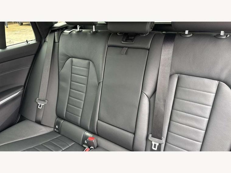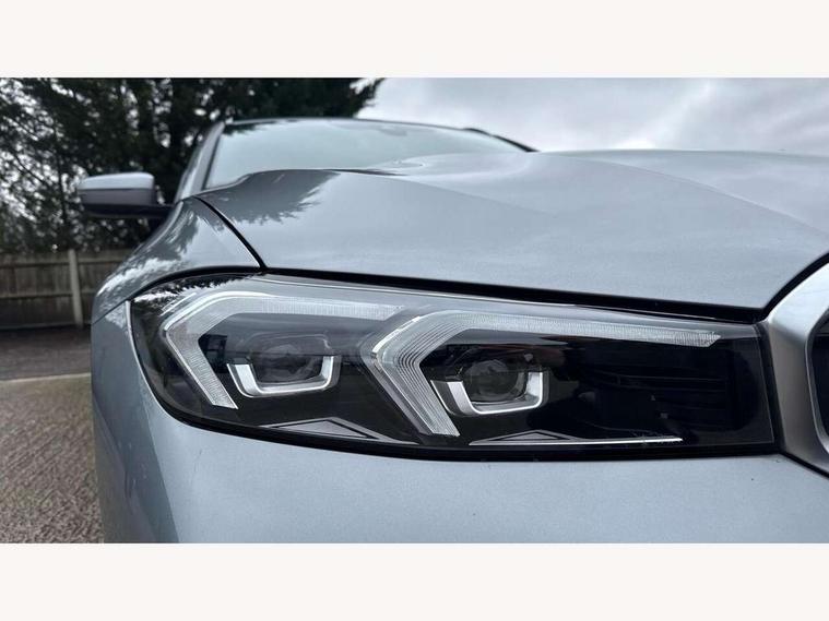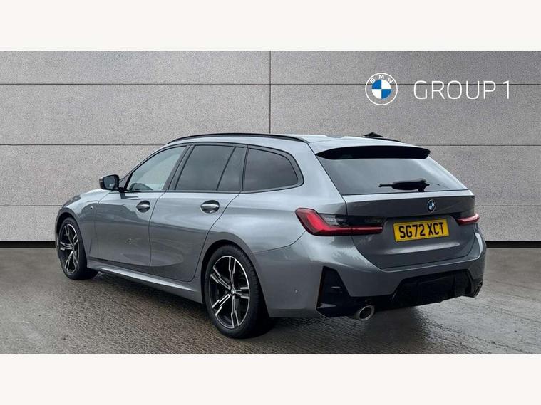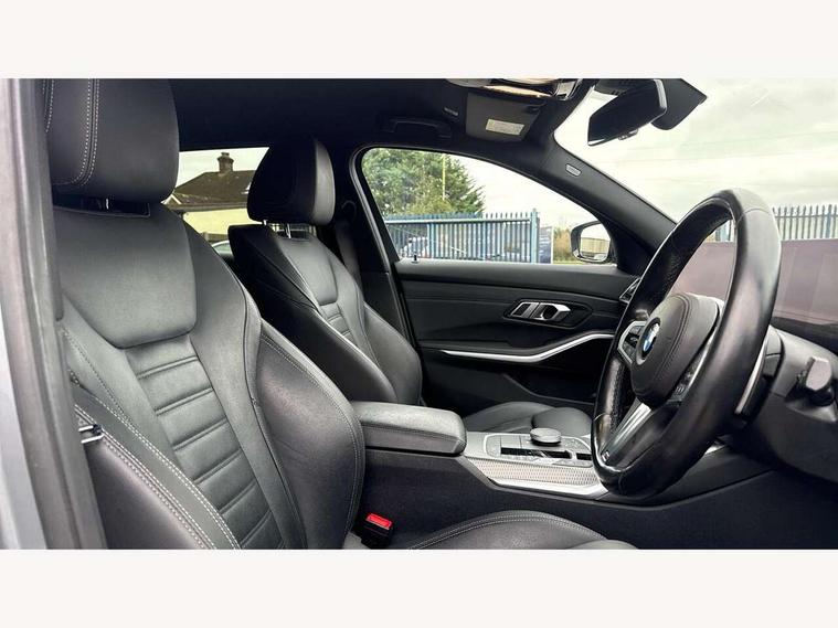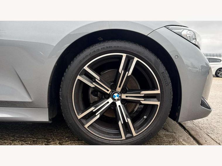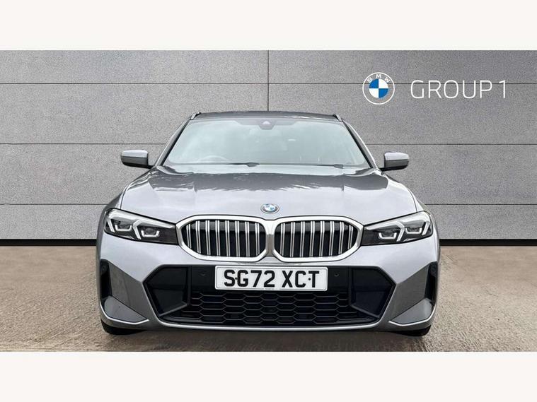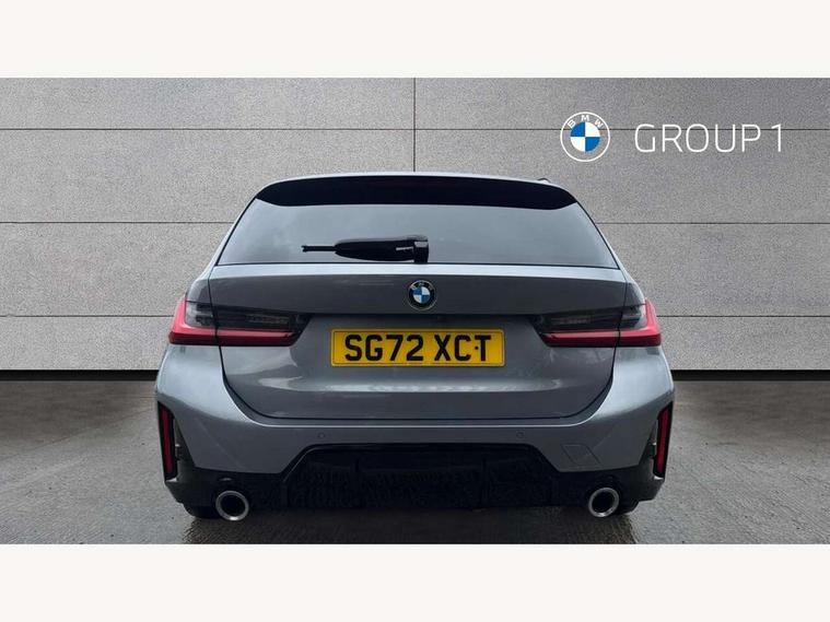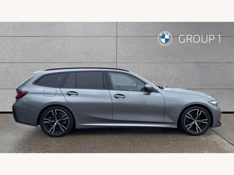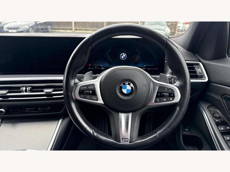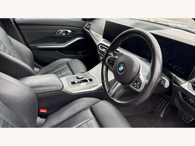 Active guard plus, Attentiveness assist, Automatic Start/stop button, BMW iDrive, BMW Teleservices, Condition based service, ConnectedDrive Services, Cruise control with brake function + speed limiter, Driving experience switch, Live cockpit plus with Navigation + 12.3" instrument display + 14.9" display, Intelligent voice assist, 2 USB, 4G LTE connect, Oil sensor for level and grade, Preparation for driver assistance, Shifting point display, Smartphone integration, Variable sport steering, Double joint spring strut front axle, Electronic differential lock control (EDLC), Fuel tank breather system, M sport suspension, Sport automatic transmission with steering-wheel mounted gearshift paddles and launch control, DAB tuner, 3rd brake light, Acoustic glazing, Automatic headlight beam throw control with load dependent regulating reaction, dynamic compensation of braking dive and acceleration squat, BMW emblem, engine compartment lid and tailgate, Body colour roof fin, Door sill strips, Electric windows - front and rear, with open/close fingertip control, anti-trap facility and comfort closing, Follow me home headlight function, Front and rear bumper system with replaceable deformation elements, Front apron plastic in body colour, Fuel filler flap - right rear in body colour, Heated washer jets, Illuminated bow type door handles in body colour drivers side with door lock, Interior rear view electrochromatic mirror with automatic anti dazzle function, LED headlights with LED daytime running lights and LED turn indicator, LED rear lights, Licence plate panel integrated into front bumper and tailgate, Matt black B-pillar finsher, Matt black window recess cover, Model designation on right side of tailgate, One piece front bumper cover including towing eye cover in body colour, Rain sensor with automatic headlight activation, Rear side wing doors, Rear wiper, Reversing lights, Side frame decorative moulding black matt, Visible exhaust tailpipe finisher, Welcome lights in interior and door handle area, 12V power socket in front storage compartment, 2 front cupholder in centre console with clamping elements and matt black inlay, 3 seat bench in 2nd row, 3 zone automatic air conditioning, 40:20:40 split folding rear seat with loading system, Anthracite headlining, Armrest integrated in front and rear door trim + front centre console armrest, BMW ID, Driver backrest width adjustment, Folding rear centre armrest with 2 cupholders, Front and rear door exit lighting (left / right), Front and rear footwell lighting, Front and rear headrests, Front and rear reading lights, Front and rear velour floor mats, Front sport seats, Heated front seats, Height adjustable mechanically and infinitely variable steering column, Illuminated armrest storage compartment, Illuminated glove compartment, Illuminated luggage compartment, Lashing eyelets in luggage compartment, LED ambient lighting with welcome carpet light, M Sport multifunction leather steering wheel, Make-up mirror lights, Single front passenger seat, Standard seat for driver and passenger with manual adjustment, Sunvisors with vanity mirrors and ticket pocket, Toolkit located in luggage compartment, Connected pack professional - 3 Series Saloon/Touring, Interior and exterior mirror pack - 3 Series Touring/Saloon, M Aerodynamics package - 3 Series Saloon/Touring, M sport exterior styling pack - 3 Series Saloon/Touring, Parking assistant pack - 3 Series, Storage compartment pack - 3 Series Saloon/Touring, 3x3 point rear seatbelts, BMW emergency call, Child locks on rear doors, Crash sensor activating of airbags, Unlocking doors, hazard warning lights, interior light, safety battery terminal, Driver and front passenger with seat occupancy detection for driver's and passenger side, Driver and passenger side airbags, body protection at side and airbags deploy from seat backrests, Dynamic brake control, Dynamic stability control + (DSC+) - Anti-lock Braking System (ABS) with brake assist and cornering brake control + Automatic Stability Control (ASC), Dynamic Traction Control - DTC, Electric parking brake including automatic hold function and automatic release of the parking brake when driving off, Head airbags in 1st and 2nd row, head protection at side, curtain airbags open from headliner above 1st and 2nd row, Plastic fuel tank, Side impact protection, Tyre pressure monitoring with three level warning strategy, Ventilated front and rear disc brakes, Warning triangle and first aid kit, Alarm system, Centre lock switch, Closing system with central locking, Electronic vehicle immobiliser,