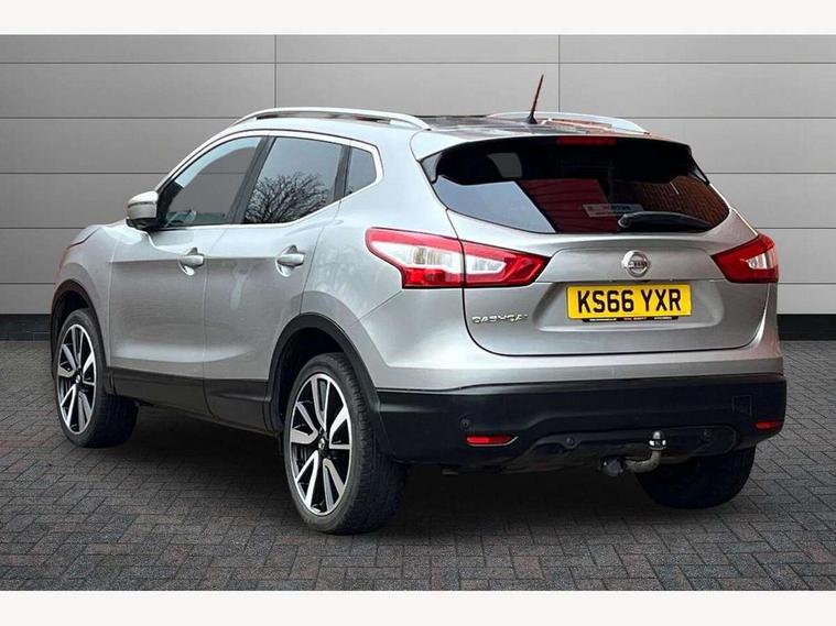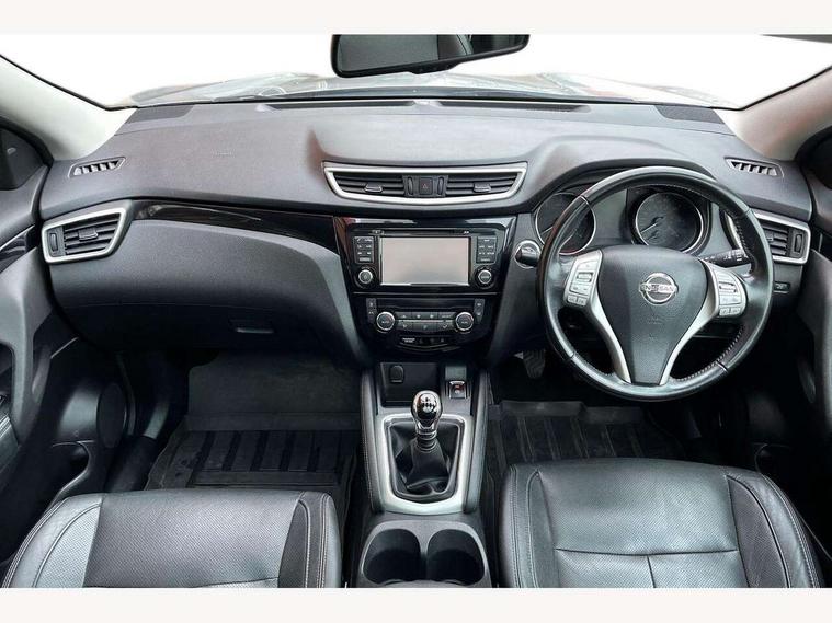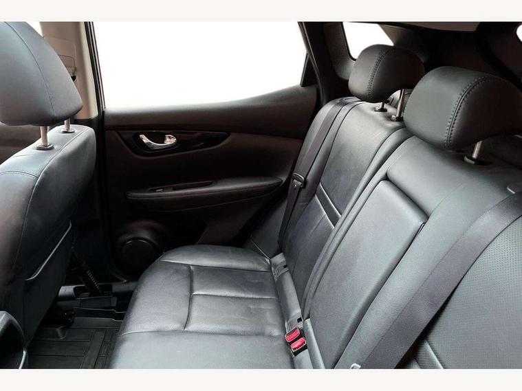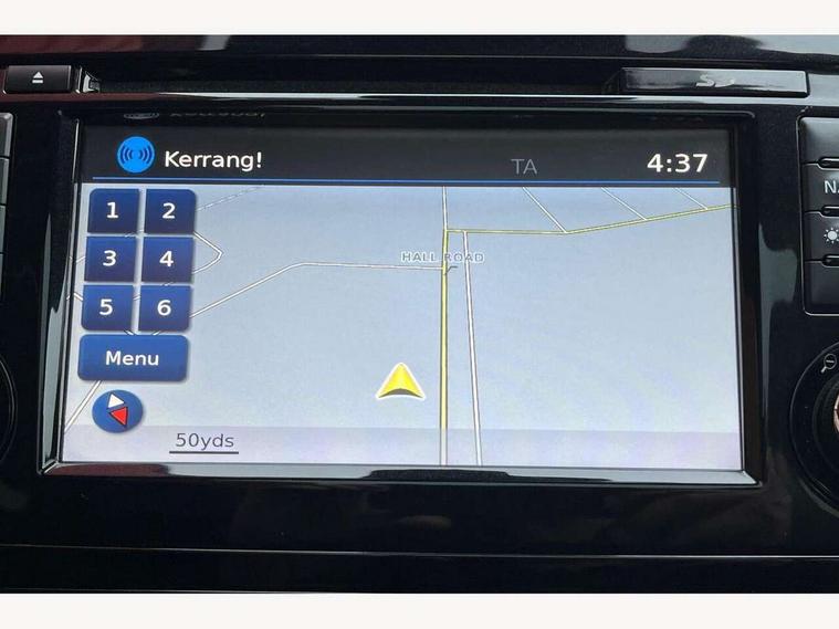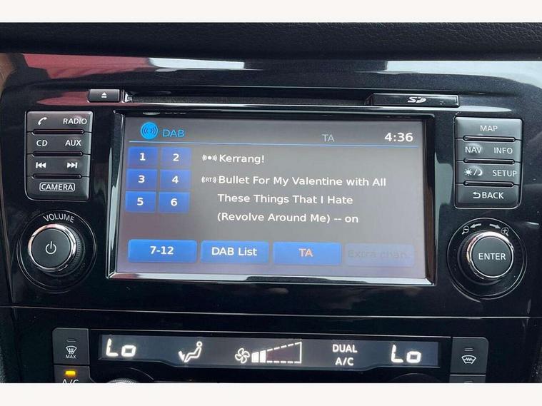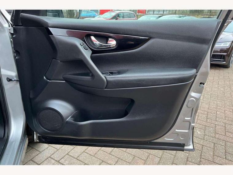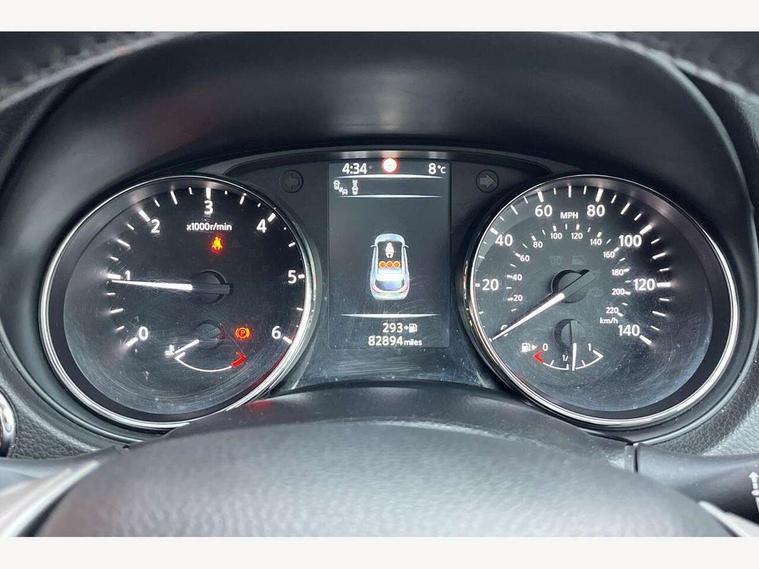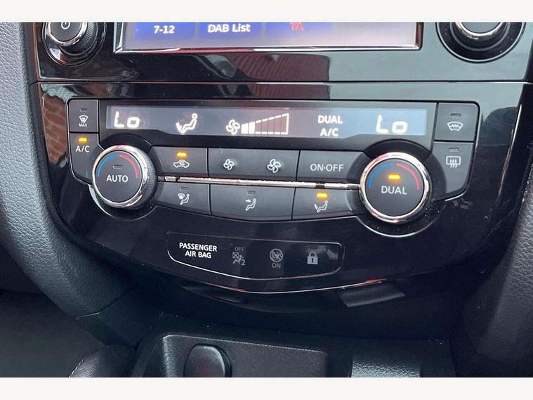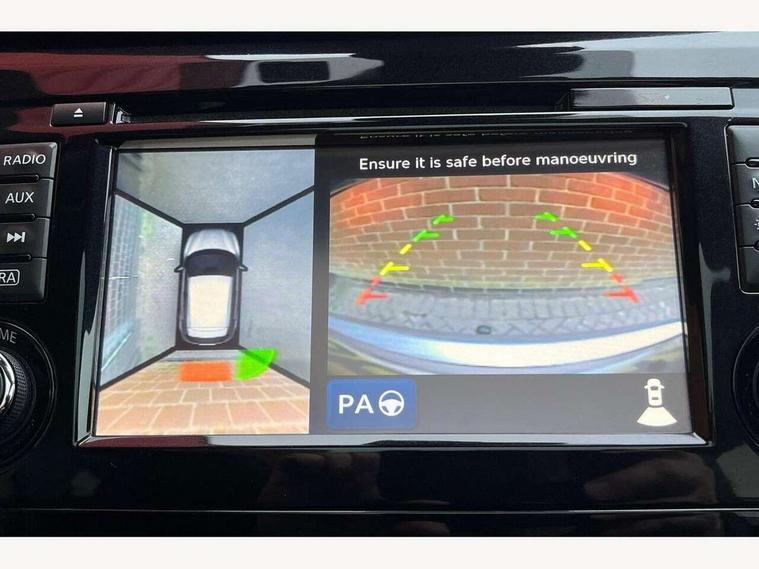 5" TFT driver information centre, Around View Monitor, Blind spot monitoring, Bluetooth phone integration system, Cruise control, Fatigue detection system, Front and rear parking sensors, Intelligent parking assist, Lane departure warning system, Moving object detection, Nissan connect sat nav system, PAS, Push button starter, Service interval indicator, Speed limiter, Traffic sign recognition, Trip computer, Diesel particulate filter, 6 speakers, DAB radio/CD player, Steering wheel mounted audio controls, USB/aux input socket, 2 speed wipers+variable intermittent wipe, Automatic headlamp activation, Bi LED headlights with auto levelling, Black honeycomb front grille, Body colour bumpers, Body colour door mirrors and handles, Chrome window surround, Electric folding and heated door mirrors, Electric front/rear windows, Front fog lights with chrome surrounds, Heated windscreen, High beam assist, Interior mirror with auto anti dazzle, LED daytime running lights, Privacy glass, Rain sensor windscreen wipers, Rear privacy glass, Rear wiper, Satin silver roof rails, 12V socket, 60/40 split folding rear seat, Ambient interior lighting, Driver/passenger front seatback pockets, Dual zone climate control, Electric front seats for height/ manual lumbar adj, Footwell ambient lighting, Front armrest, Front cupholders x 2, Front headrests, Front seat belt pre-tensioners with load limiters, Heated front seats, Illuminated glovebox, Isofix child seat preparation, Leather gearknob, Leather steering wheel, Luggage area divider, Map reading lamp, Pollen filter, Rake/reach adjustable steering wheel, Rear armrest with 2 cupholders, Rear headrests, ABS, brake assist and EBD, Child locks on rear doors, Curtain airbags, Driver/front passenger airbag, Electronic parking brake, ESP + traction control, Forward emergency braking, Height adjustable front seatbelts, Hill start assist, Side airbags, Three 3 point rear seatbelts, Tyre pressure monitoring system, Alarm, Immobiliser, Intelligent Key, Remote central locking, Tyre puncture repair kit,