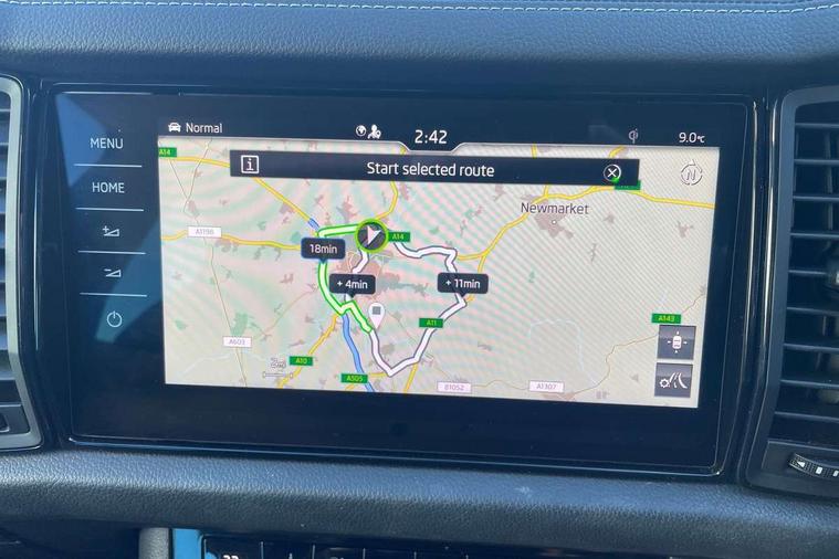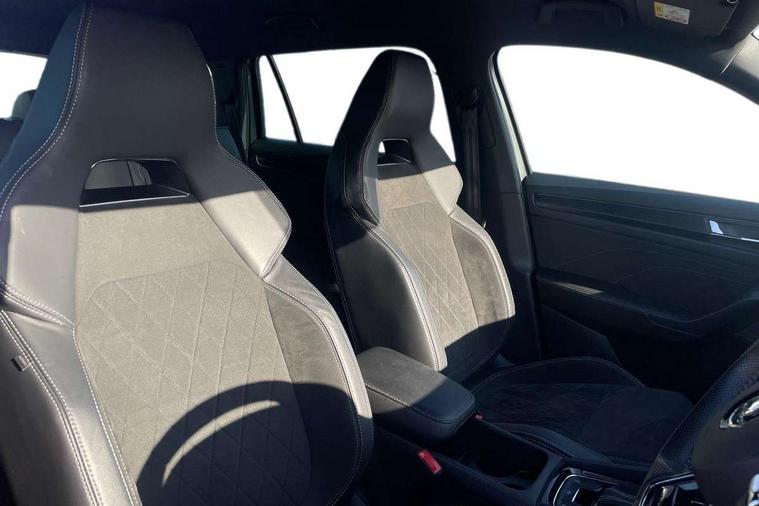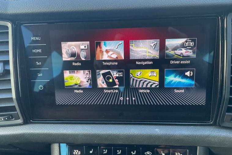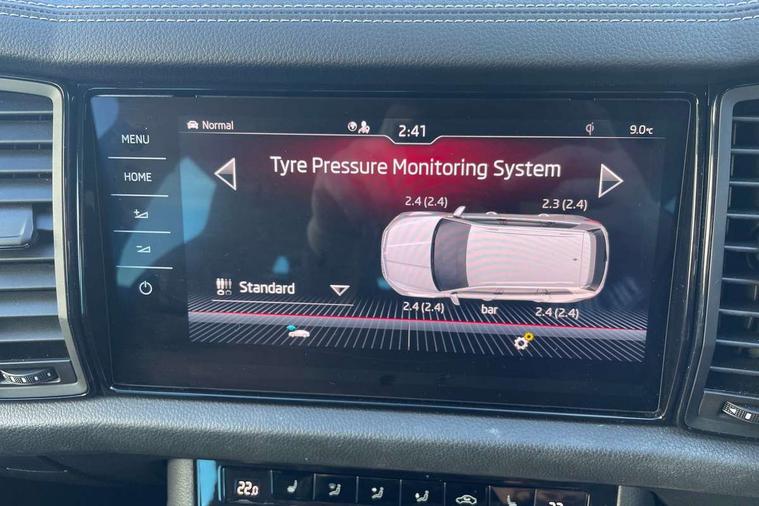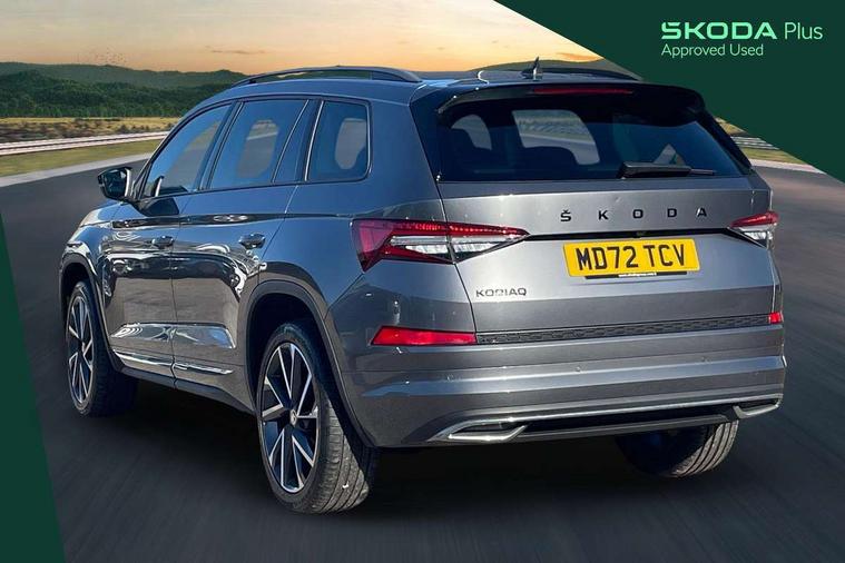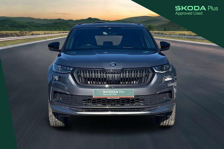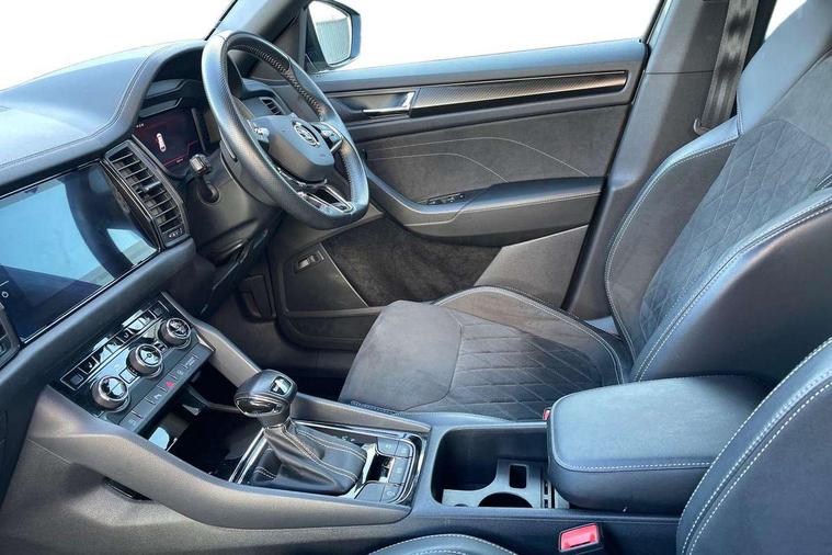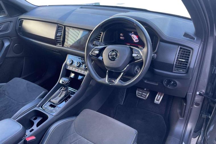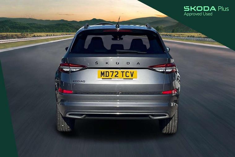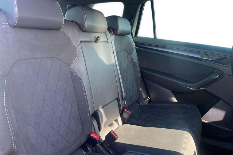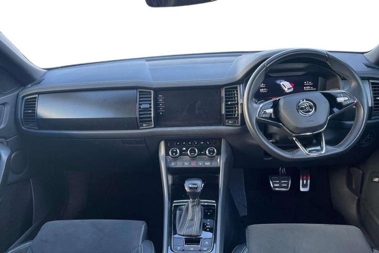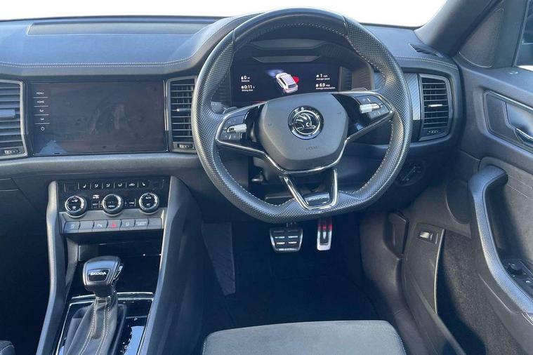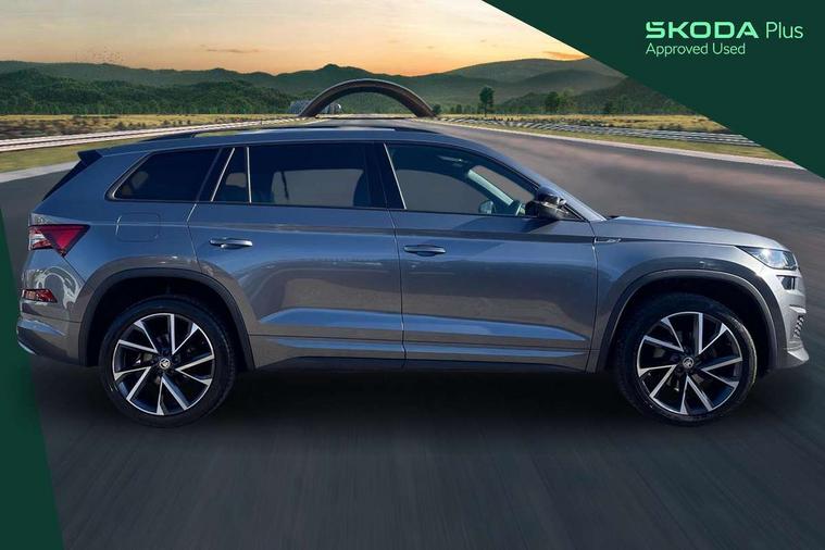 Bluetooth system, Columbus satellite navigation with 9.2" touchscreen, integrated Wi-Fi, web radio, Digital voice enhancement, e call+, ECO Stop/start function, Exterior temperature indicator, Progressive steering, Rear view camera, Smartlink wireless for apple carplay and wired for android auto, Speed limiter, Tailgate unlocking from outside, USB C Port x 2 in front centre console, Wireless charging, 8 Speakers, DAB Digital radio, Aero front windscreen wipers with intermittent function, Aero rear window wiper, Auto dimming rear view mirror, Black roof rails, Black sports styling including front grille and window surrounds, Black wheel arch surrounds, Body colour bumpers, Body colour door handles, Electric adjustable/heated/folding door mirrors, driver side auto dimming with boarding sports and memory function, Electric front and rear windows, Extended rear spoiler with finlets in gloss black, Front fog lights, Full LED matrix headlights with AFS (adaptive front light system), cornering function and AWL (all weather lighting system), Gloss black door mirrors, Headlight washers, Heated rear window, Invisible tailpipe, LED daytime running lights, LED rear fog light, LED third brake light in rear spoiler, Light assistant (coming/leaving home/tunnel light), Off-road style lower front bumper element, Privacy glass, Rain and light sensors, Rear diffuser, Rear LED lights (high functionality) with welcome effect and dynamic indicators, Rear side wing doors, Safety reflectors on front and rear doors, Sportline badge on front fender, Sports front and rear bumpers including lower rear chrome strip, Tailgate lettering in Black, Window control switches with black trim, 12V socket in boot, 2 rails with 2 hooks, 2 seat bench in 3rd row, 3 seat bench in 2nd row, 4 foldable roof handles with rear coat hooks, 60:40 foldable rear seat with sliding adjustment and backrest angle adjustment, Aluminium pedals, Black roof headlining, Bottle holders in door panel in the 1.5 litre front and 1 litre rear, Cargo storage compartments, Chrome headlight control button, Chrome interior door handles, Coat hooks on B pillar, Covered storage compartment on driver side, Decorative door sill covers, Front centre armrest with storage compartment, cup holder and 12V socket, Front courtesy lights, Gear shift lever with chrome frame and black gloss insert, Grey stitching in front and rear armrests and door armrests + door inserts, Height adjustable front headrests, Illuminated and cooled glovebox, Illuminated luggage compartment, Isofix child seat fittings in outer rear seats with top tether, Manually adjustable steering column, Microsuede door panels, Net programme in boot (1x horizontal Net, 2x vertical Nets), Overhead glasses storage compartment, Pollen filter, Rear centre armrest with cupholders, Single front passenger seat, Sliding trunk cover, Small Bags on the inner sides of the front backrests, Sports seats, Sunvisors with illuminated vanity mirrors, Three rear height adjustable headrests, Ticket holder on A Pillar, Umbrella in door panel, Variable boot floor, LED Interior light pack - Kodiaq, Auto door release and activation of warning lights in the event of an accident, Child locks on rear doors, Driver and front passenger airbag with knee airbag and front passenger airbag deactivation, Electronic parking brake with hill start assist, Emergency rear braking signal, ESC (incl. ABS+MSR+ASR+EDS+HBA+DSR+RBS+MKB), Front assist with autonomous emergency braking, Front side airbags with curtain airbags, Fuel cut off safety device, Height adjustable front 3 point seatbelts + pretensioners, Hill hold control, Rear disc brakes, Safety vest holder in door, Seat belt reminder for all seats, Three point rear seat belts, Two tone horn, Tyre pressure monitor, Alarm with interior monitoring and tilt sensor with safe function, Anti-theft wheel bolts, Immobiliser, Keyless entry and start system (KESSY), Remote central locking with 2 keys, Black air vent surround, Carbon finish dashboard and door inserts, Grey stitching in dashboard, 20" Vega Anthracite alloy wheels, Temporary spare wheel (space saver),