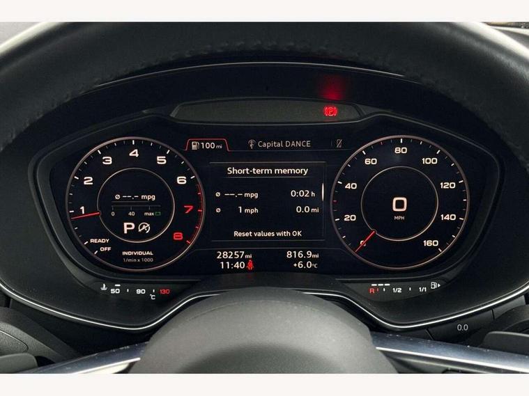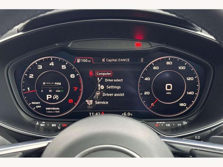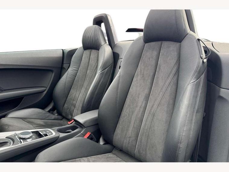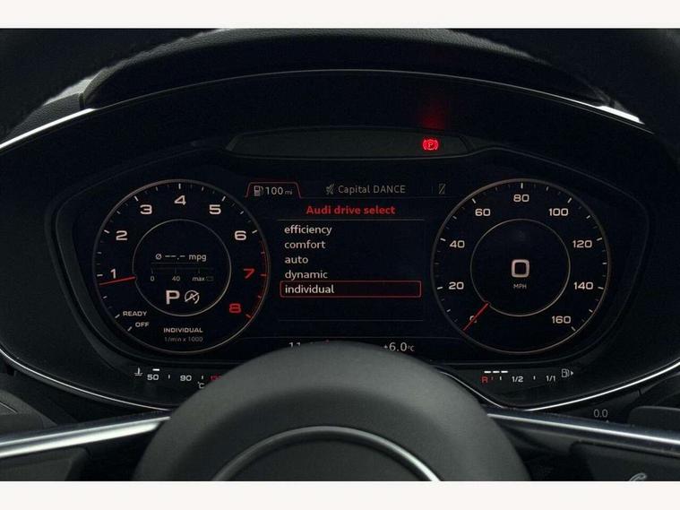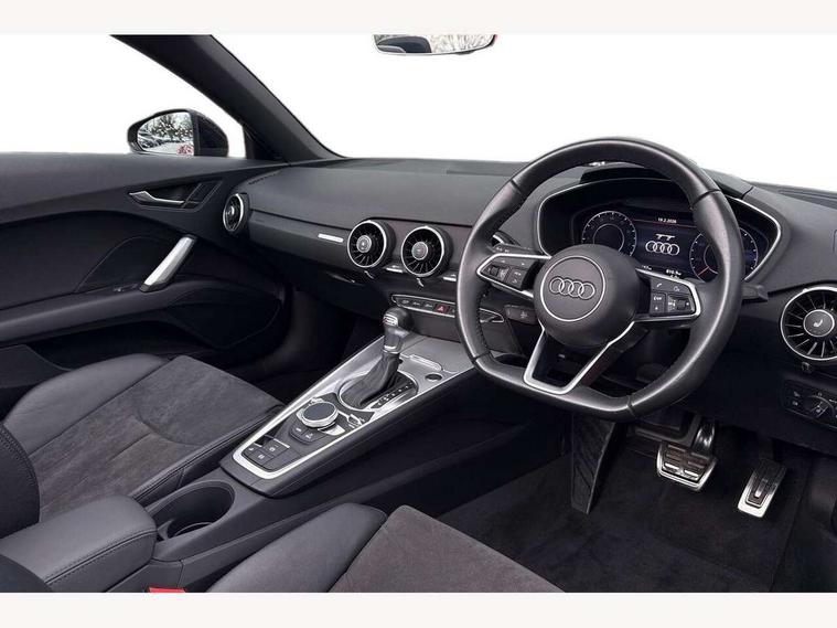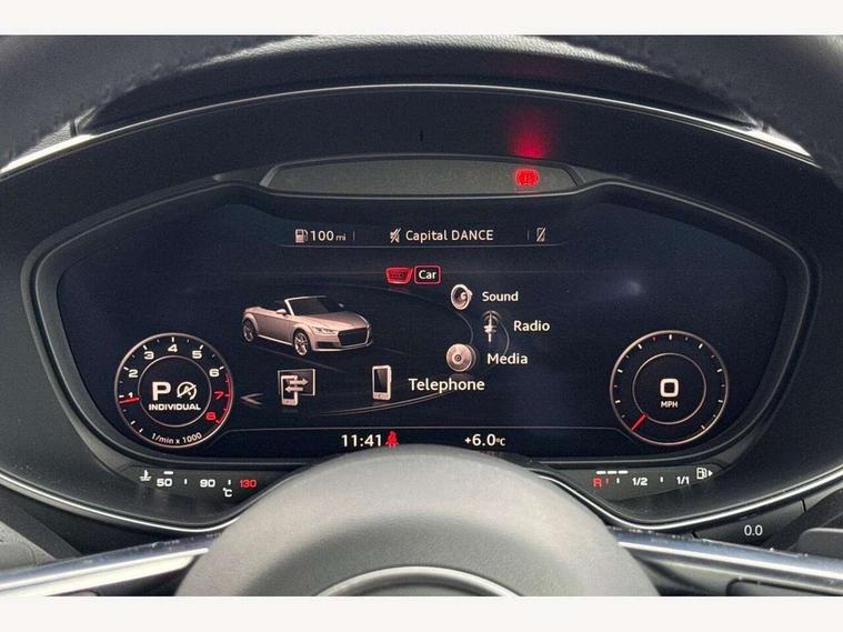 Audi drive select with 4 Pre configured modes, Audi smartphone interface, Audi virtual cockpit - 12.3" high-resolution LCD display with fully customisable instrument cluster, Cruise control + speed limiter, Emergency call service, MMI touch panel, Mobile phone preparation with bluetooth interface, Progressive power assisted steering, Seat belt microphone, Service interval indicator, Start/Stop system with energy recuperation, TP memo, Sports suspension, AM/FM radio, Bluetooth audio streaming, DAB Digital radio, MMI Radio with CD player and SD/XC card slot, Auto dimming rear view mirror, Electric folding door mirrors, Electric front windows, Electrically adjustable and heated door mirrors with integrated LED side indicators, Front fog lights, Fully automatic acoustic hood, Green tinted heat insulating glass, LED 3rd brake light, Light and rain sensors, Rear boot, Retractable rear boot spoiler, Sunband for windscreen, Xenon headlights with LED daytime running lights with automatic headline range control + LED rear lights, brake lights and rear indicators, 12V socket, 3 spoke flat bottomed high multi-function leather sport steering wheel with gearshift paddles, Alcantara/Leather upholstery includes seat centre panels, door trim inserts in black Alcantara with side bolsters, head restraints in black leather, Aluminium door sill trims, Black roll bar, Front centre armrest, Front passenger seat, Front sports seats, Heated front seats, Height/reach adjust steering wheel, Integrated head restraints, ISOFIX child seat mounting for front passenger seat with airbag deactivation, Manual adjustment of seat height, fore/aft position, seat angle, seat depth and backrest angle, Black styling pack - TT, Non smoking pack - TT/TT RS, 3 point front seat belts, ABS, ASR traction control, Curtain airbags, Driver and front passenger airbag with front passenger airbag deactivation, EDL traction control, Electromechanical parking brake, ESP, First aid kit, Front side airbags, Hill hold assist, Seatbelt warning, Tyre pressure loss indicator, Warning triangle, Anti theft alarm, Anti theft wheel bolts, Immobiliser, Keyless Go, Remote central locking, Aluminium design inlays, Tool kit, Tyre repair kit,