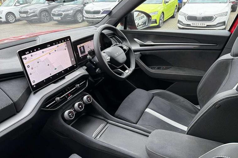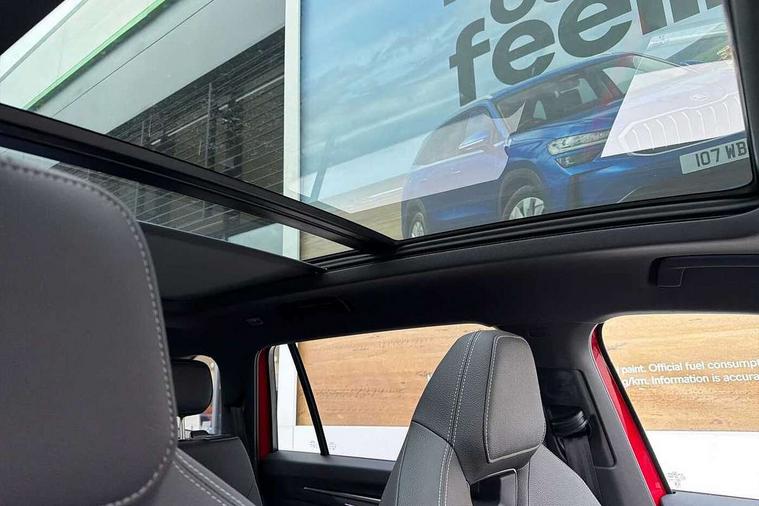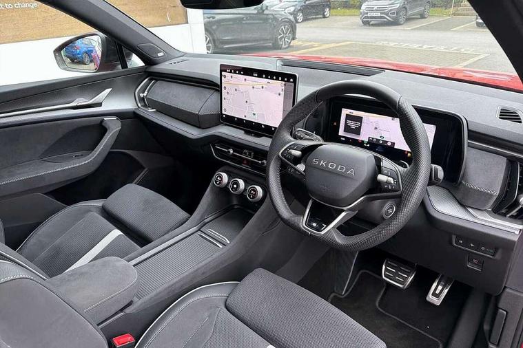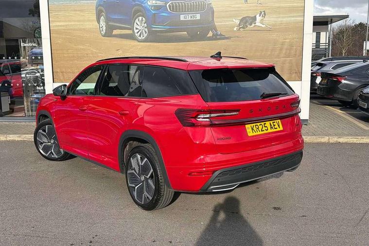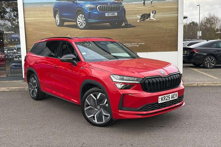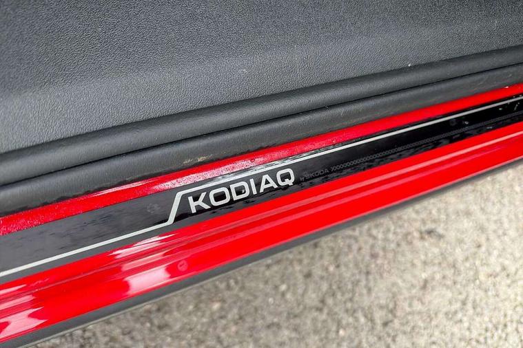 13" satellite navigation touchscreen display, Blind spot detection with door exit warning, Bluetooth system, ChatGPT functionality, Driver alert - Fatigue and drowsiness monitor, Dry display cleaner, Emergency call, Front and rear parking sensors, Front cross traffic assist, Lane assist, Off road modes, PAS, Rear traffic assist, Tailgate unlocking from outside, Traffic sign recognition, USB C Port x 2 in front centre console, Virtual Cockpit - 10.25" digital display, Voice control system, Wireless charging for two smartphones (15W) with cooling function, Wireless SmartLink for Apple CarPlay and Android Auto, Stop/start function, 2x USB-C in the rear, DAB Digital radio, Aero front windscreen wipers with intermittent function, Auto dimming rear view mirror, AWL (all weather lighting) and all weather light with cornering function, Black diffuser and decorative tailpipe with a unique dark chrome finish, Black roof rails, Black sports styling including front grille and window surrounds, Black wheel arch surrounds, Body colour door handles, Cornering light and poor weather light, Electric folding /adjustable/separted heated/folding door mirrors, auto dimming with boarding sports and memory function, Electric front and rear windows, Exterior black decorative trims, Front and rear sports bumpers including lower rear chrome strip, Gloss black door mirrors, Gloss black window frame and D pillar, Heat insulating glass in windshield, Heated rear window, Ice scraper in fuel tank cap, LED daytime running lights, LED third brake light in rear spoiler, Light assistant with automatic headlight control and coming home feature, Logo projection in door mirrors, Privacy glass, Rear roof spoiler, Rear side wing doors, Rear window wiper, Red decorative strip between rear LED lights, Safety reflectors on front and rear doors, Sportline badge on front fenders, Tailgate lettering in Black, Unique dark chrome design logo on alloy wheels, Window control switches with black trim, Windscreen wipers with rain sensor, Without engine designation, 1.5l bottle holder points in all door, 1x centre rear reading light, 2 seat bench in 3rd row, 3 configurable smart dials with 32mm coloured display, 3 seat bench in 2nd row, 4 foldable roof handles with rear coat hooks, Aluminium pedals, Ambient interior lighting - Dashboard, front-door stowage compartments, front and rear door panels and footwell lighting, Automatic gear selector on steering column, Chrome interior door handles, Driver/front passenger reading lights, Fabric headlining, Fixed bench 40:60:40 split folding backrests, Front and rear floor mats, Front centre armrest with jumbo box storage compartment, cup holder and 12V socket, Front sport seats, Height adjustable front headrests, Interior black decorative trims, Isofix child seat fittings in outer middle row rear seats and front passenger with top tether, Manually adjustable steering column, Pollen filter, Rear centre armrest with cupholders, Rear seat boot backrest release, Single front passenger seat, Skoda lettering on steering wheel, Storage pocket including mobile phone pockets on the backs of the front seats, Sunvisors with illuminated vanity mirrors, Three rear height adjustable headrests, Ticket holder on A Pillar, Tri zone climate control, Umbrella in door panel x1 made from sustainable materials, Upper and lower glovebox with card holder and coin compartment, USB C port by rear view mirror for charging only (15W), Acoustic package - Kodiaq, Performance package - Kodiaq, Sportline design selection pack - Kodiaq, Auto door release and activation of warning lights in the event of an accident, Driver and front passenger airbag with knee airbag and front passenger airbag deactivation, Electric child locks, Electronic parking brake, ESC (incl. ABS+EMD+MSR+ASR+EDL+HBA+DSR+RBS+ESBS+MCB+TSA+XDS), Front assist with braking reaction to vehicles, pedestrians and cyclists, Front disc brakes, Fuel cut off safety device, Height adjustable front 3 point seatbelts + pretensioners, Hill hold assist, Junction assist with automatic emergency braking, Rear disc brakes, Safety vest holder in door, Seat belt reminder for all seats, Three point rear seat belts, Two tone horn, Tyre pressure monitor, Alarm with interior monitoring and tilt sensor with safe function, Anti-theft wheel bolts, Immobiliser, Remote central locking with 2 keys, 20" Rila anthacite polished alloy wheel with black matte aero covers,
