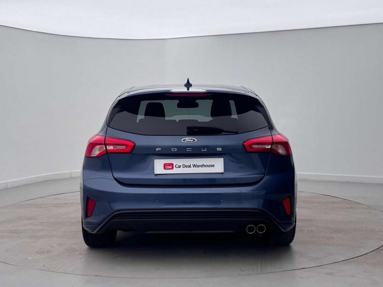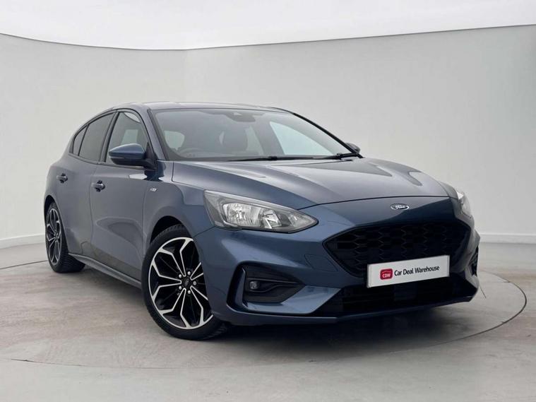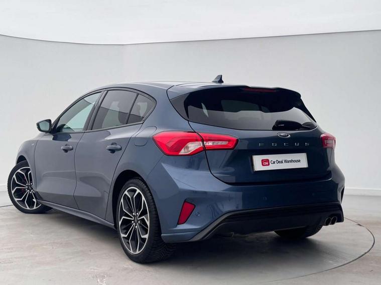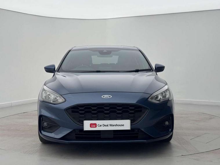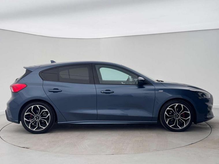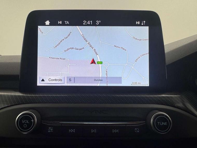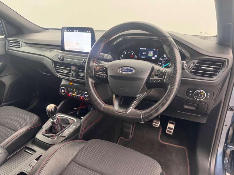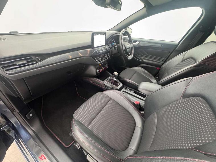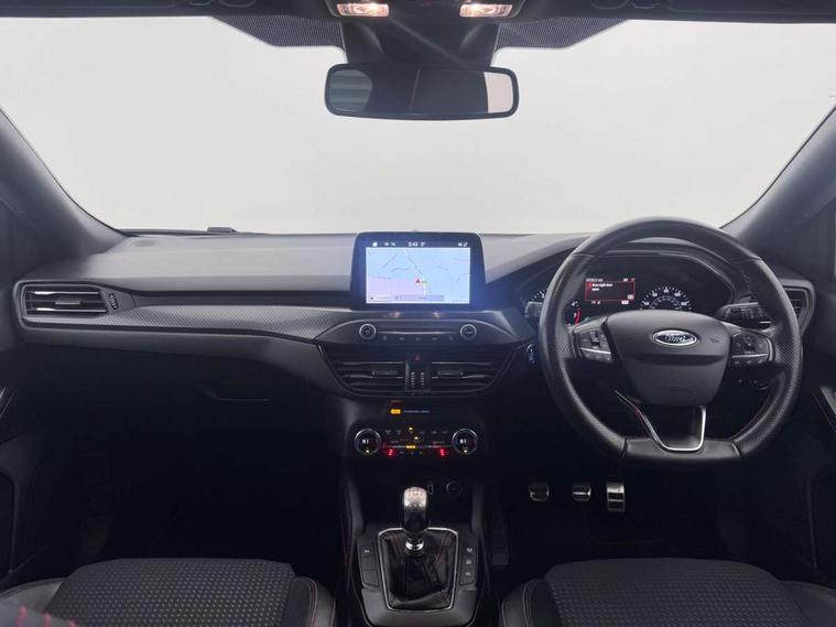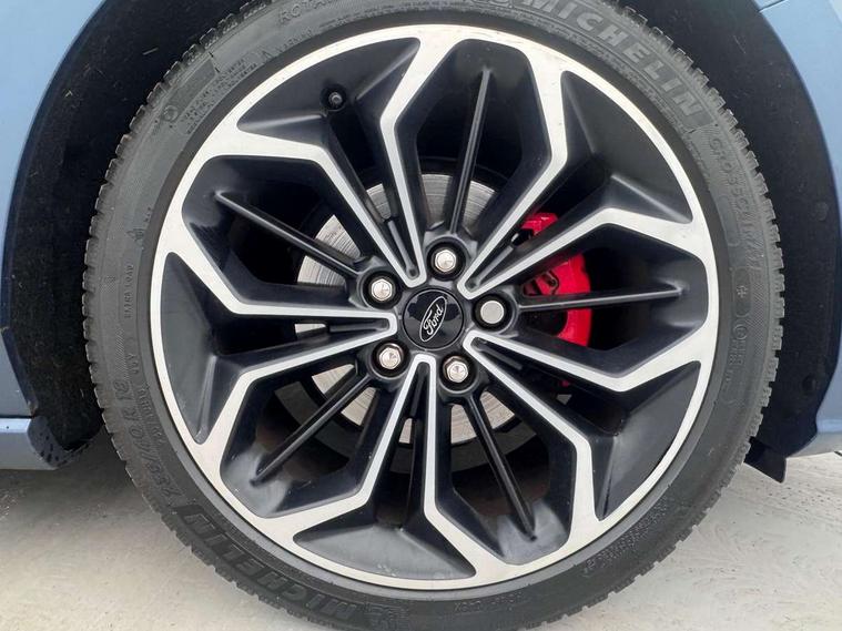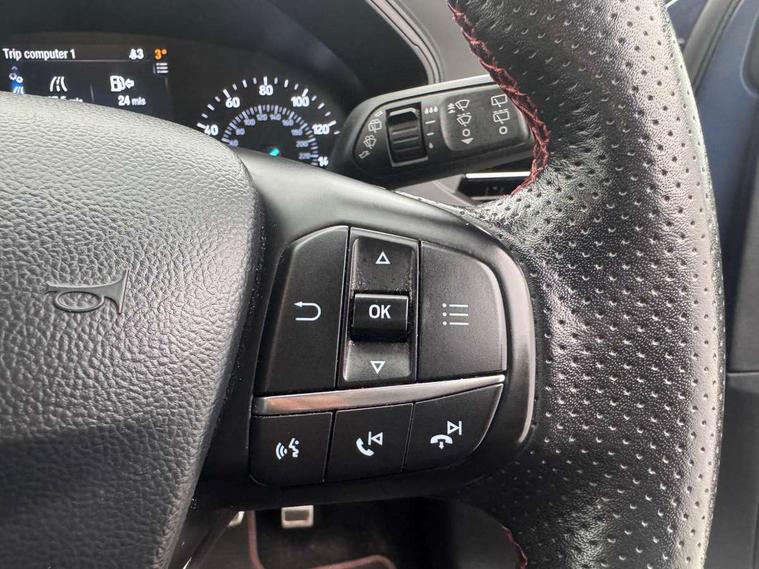 4" TFT coloured cluster screen, Bluetooth system, Digital clock, Easy fuel capless refuelling system, Eco mode, Ford pass connect, Ford SYNC 3 nav system with DAB radio, 8" colour touch screen, voice control, app link, Apple car play/Android auto and 4.2" TFT coloured cluster, Lane keeping aid with lane departure warning, PAS, Selectable drive mode, Trip computer, Sports tuned suspension, 2 USB ports, Aux input, 'Quickclear' heated windscreen/heated washer jets, Auto dimming rear view mirror, Auto headlamps (on/off), Automatic rain sensing wipers, Body colour large rear spoiler, Body colour side skirt, Body coloured bumpers, Body coloured door handles, Body coloured electrically operated and heated door mirrors with side indicators, Electrically operated front and rear windows with one touch opening and closing, Front variable intermittent wipers with electric wash, Heated rear window, LED daytime running lamp, LED front fog lamps with cornering function, Polished twin tailpipe, Power folding door mirrors with puddle lights, Rear privacy glass, ST-Line upper and lower grille with full body styling kit and wing badges, Tailgate wash/wipe, Unique door and instrument panel inserts, 3 spoke flat bottomed leather steering wheel with red stitching, 6 way power adjustable driver seat, 60/40 split back and cushion rear seats with 2 height adjustable headrests, Alloy finish pedals, Aluminium gear knob, Centre console with armrest, Dark headliner, Dual zone electronic air temperature control, Front and rear floor mats with red stitching, Front passenger seat manual height and lumbar adjust, Heated front seats, Height adjustable front headrests, Isofix child seat preparation, Part leather upholstery with red stitching, Reach + rake adjustable steering column, Rear centre headrest, Red stitching on steering wheel, Soft console knee pads with red stitching, ABS+Electronic Brake force Distribution, Auto hold function, Driver airbag, Electronic parking brake, Electronic stability control, Front and rear seatbelt reminder, Front inertia reel height adjustable seatbelts with pre-tensioners, Front passenger airbag, Front side airbags, Hill start assist, Passenger airbag deactivate switch, Post collision braking, Pre collision assist with autonomous emergency braking and pedestrian/cyclist detection, Red brake calipers, Side curtain airbags, Three rear inertia reel lap/diagonal seatbelts, Tyre pressure monitoring system, MyKey system, Remote central locking & engine immobiliser, Thatcham category 1 alarm, Contrast stitching - Red, 18" 5x2 spoke matt black machined finish alloy wheels, Mini steel spare wheel,