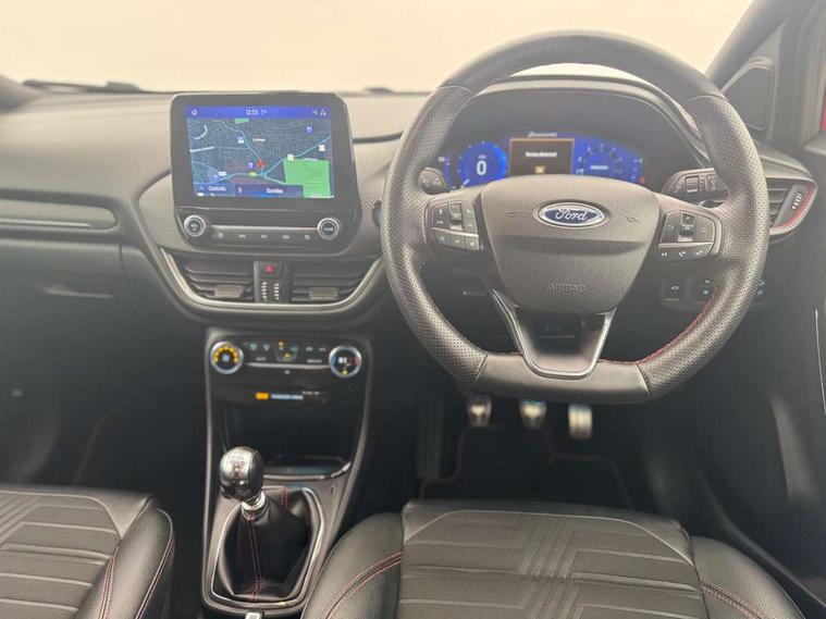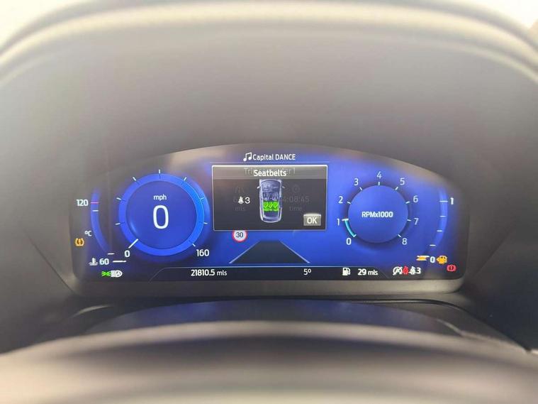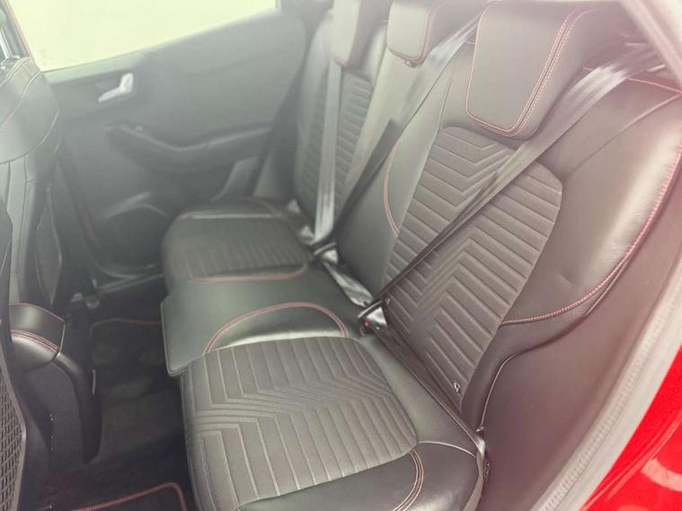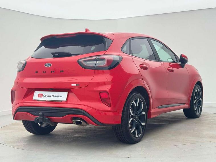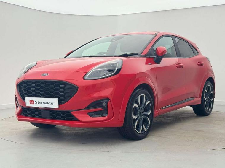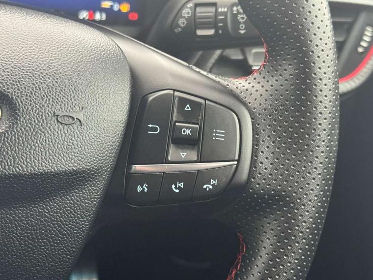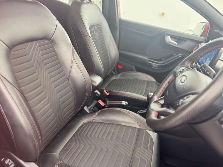 Ford easy fuel, Full digital 12.3" instrument cluster, Lane keeping aid with lane departure warning, Power liftgate hands free including keyless start + entry, motion sensing key fob, Rear parking sensor, Selectable drive modes(Normal, Eco, Sport, Slippery and Trail), Wireless charging pad, Automatic headlights with rain sensing wipers and auto high beam, Fixed LED headlamps, Front fog lights with cornering lights and LED rear lamps, Power foldable heated door mirrors with puddle lamps, Privacy glass to side rear windows and tailgate glass, Quickclear heated windscreen, ST-Line body kit with large rear spoiler wth sports suspension, Alloy sports pedals, Casual partial leather upholstery with salerno bolster, Centre console with armrest and stowage, Driver and passenger seat lumbar and height adjust, EATC - Electronic Auto Temperature control, Ford megabox extended bootspace, Front and rear floor mats, ST-Line flat bottomed leather steering wheel with leather handbrake and aluminium gear knob, B&O Premium Audio system + Ford SYNC 3 navigation pack - Puma, Driver assistance pack - Puma, 3 rear seatbelts, Electronic stability control (ESC) and hill start assist, Pre-collision assist with autonomous emergency braking, pedestrian/cyclist detection & post-collision braking, Tyre pressure monitoring system (TPMS), Thatcham alarm, Carbon look interior deco spears, 18" 5 spoke matt black machined finish alloy wheels, Tyre inflation kit,