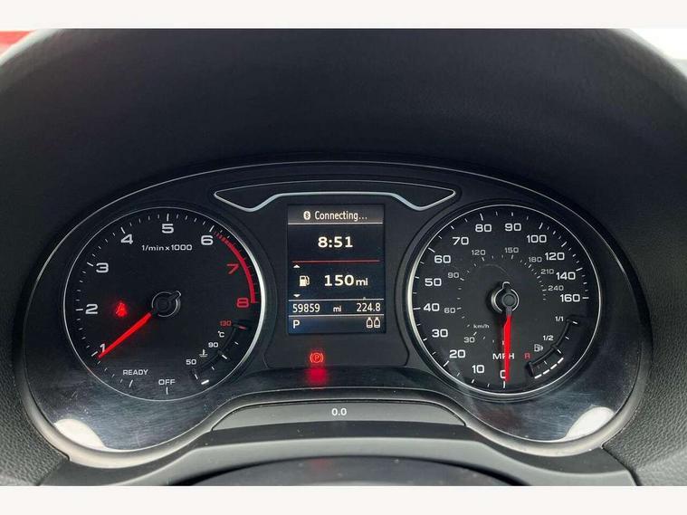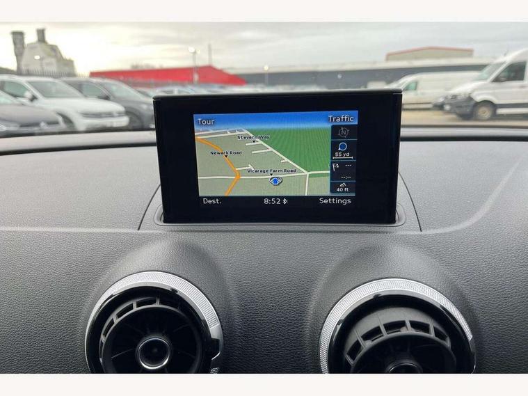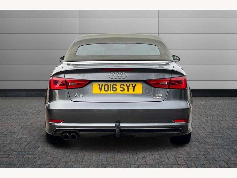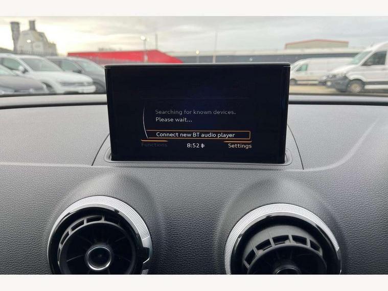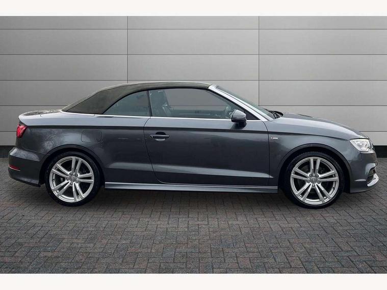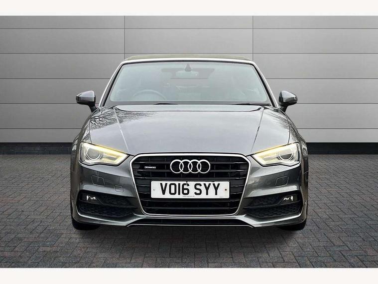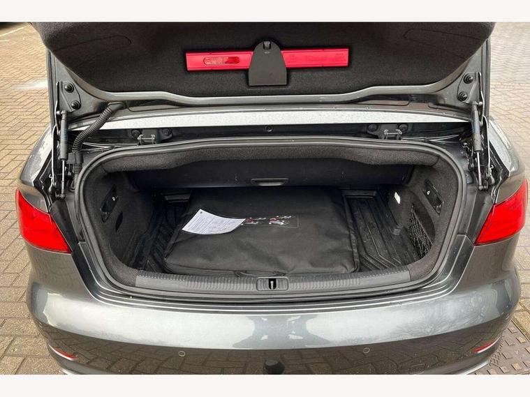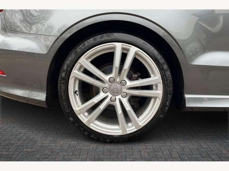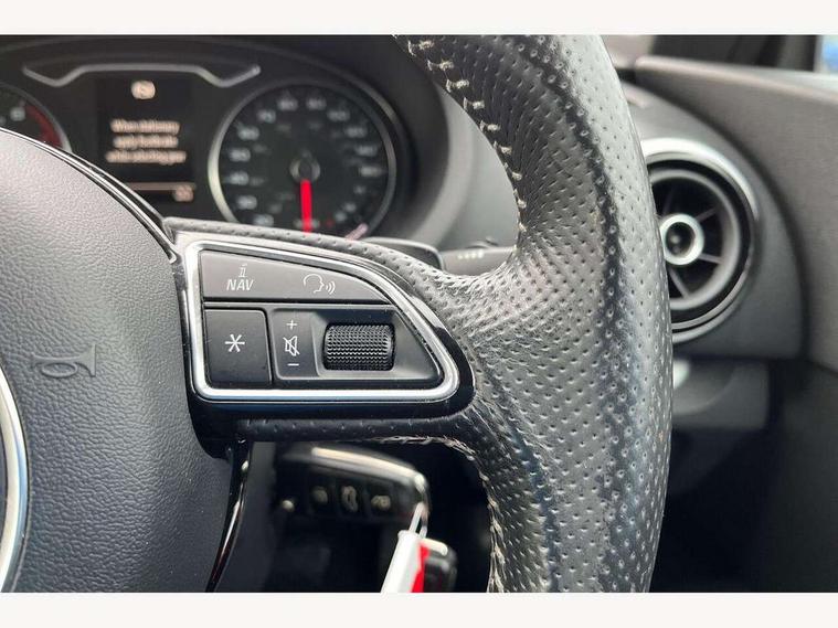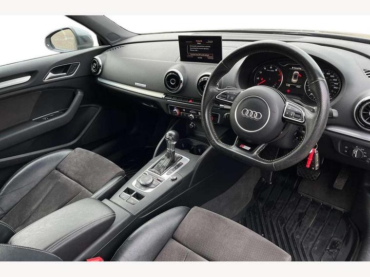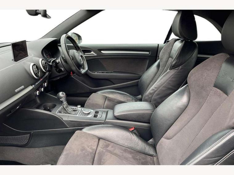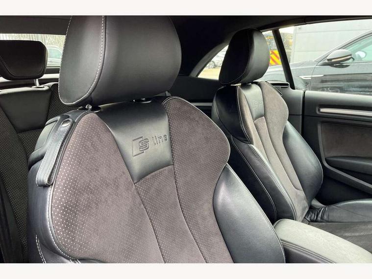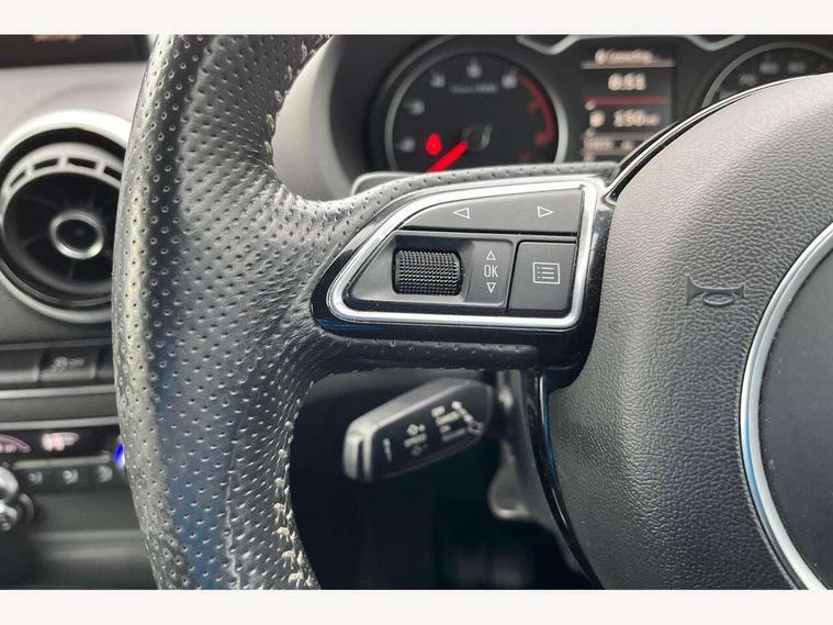 Audi drive select, Colour driver's information system display, Fatigue detection system, Low washer fluid indicator, Service interval indicator, Voice control system, Audi music interface, DAB Digital radio, Speed dependent audio volume control, Adaptive brake lights, Aluminium side window trim, Body colour bumpers, Body colour door mirrors with integral indicators, Chrome exhaust tailpipes, Electric front+rear windows, Front fog lights, Fully automatic acoustic hood, Headlight washers, Heated rear window, Heated windscreen washer jets, High gloss black fog light surround, High gloss black front grille, LED daytime running lights, S Line body styling, Twin exhaust tailpipe, 2 height adjustable rear headrests, 3 spoke flat bottomed S Line multifunction steering wheel, 4 lashing points to secure luggage, 50/50 split folding rear seat, Adjustable front armrest, Aluminium door sill trims, Black cloth headlining, Door sill trims with S line logo, Driver/passenger sunvisors, Drivers underseat storage, Dual zone electronic climate control, Front and rear interior lights with delay, Front centre armrest, Front/rear floor mats, Height adjustable front seats, Height/reach adjustable steering column, Illuminated glovebox, Illuminated vanity mirrors, ISOFIX child seat preparation+airbag deactivation, Perforated leather gearknob, Steering wheel gearshift paddles, Storage compartment in centre console, Storage compartments in doors, Light and rain sensor pack - A3 Cabriolet, Storage and luggage pack - A3 Cabriolet/ Saloon, 3 point seatbelts on all seats, ABS/EBD, Active bonnet, Active front headrests, ASR, Automatic roll over protection, Collision mitigation braking system, Driver and passenger side airbags, Driver/Front Passenger airbags, Drivers knee airbag, EDL, Electromechanical parking brake, ESC - Electronic Stability Control + traction control, Front passenger airbag deactivation, Seatbelt warning, Tyre pressure monitor, Warning triangle and first aid kit, Anti-theft wheel bolts, Folding key, Remote control central locking, Thatcham category 1 alarm + immobiliser, Aluminium air vent surrounds, Aluminium trim elements, Matt brushed aluminium inlays, Tyre repair kit,