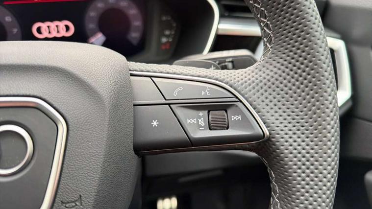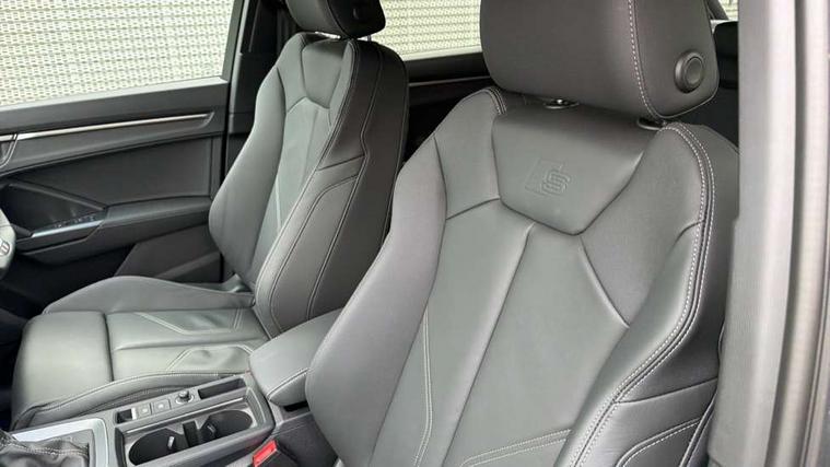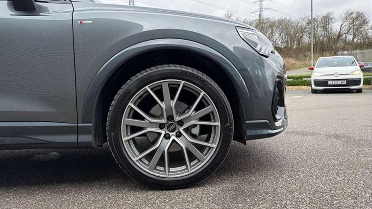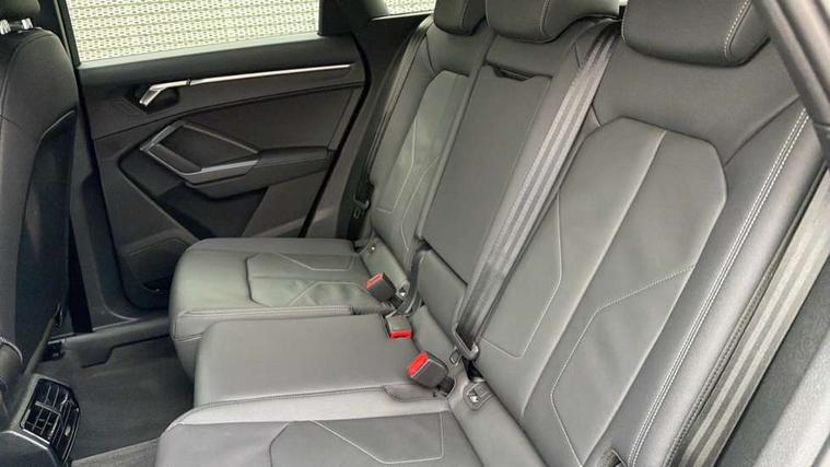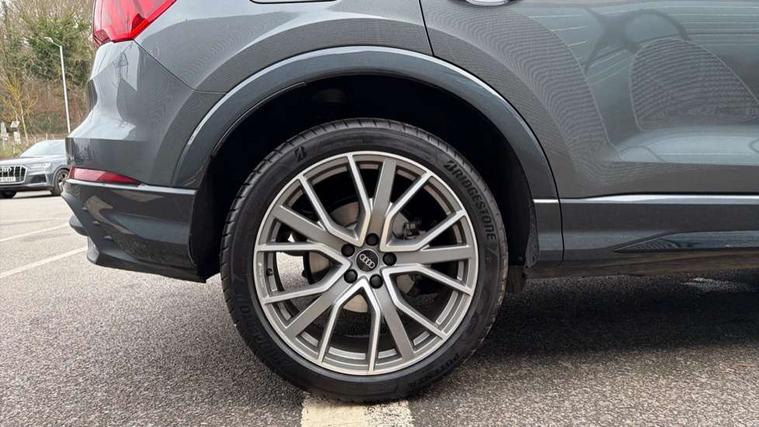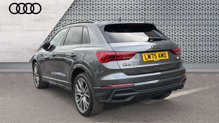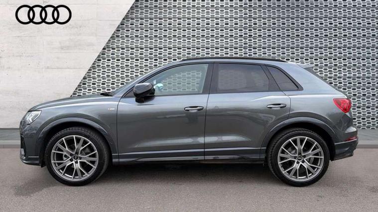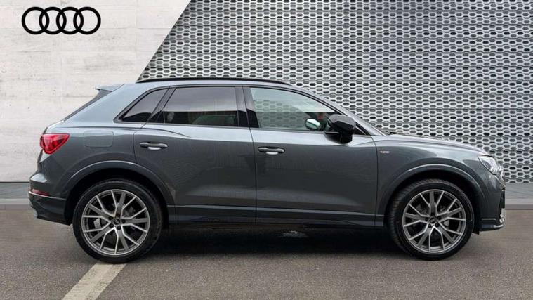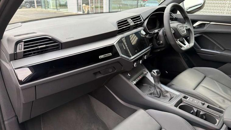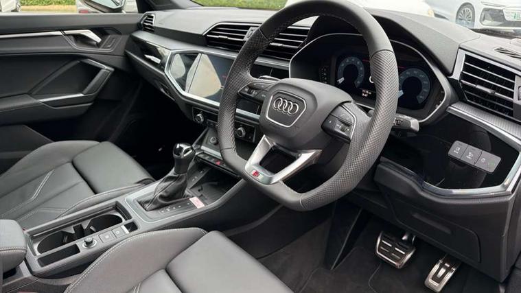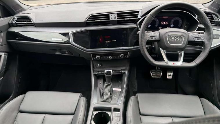 360 degree view camera, Audi connect safety and service, Audi drive select, Audi lane departure warning, Audi Virtual Cockpit - 10.25" display, Bluetooth interface, Camera based traffic sign recognition, Distraction and Fatigue warning, Legal emergency call, MMI Navigation Plus with high resolution 10.1 inch touchscreen colour display, Phonebox light with wireless charging, Power operated tailgate, Progressive steering, Service interval indicator, Smartphone interface includes wireless Apple carplay/Android Auto, Start stop system with recuperation, Voice control system with natural language interaction, Sports suspension, 2 USB-C ports with charge and data functions, DAB digital radio module, SONOS premium sound system, Acoustic windscreen, Audi Beam uses LEDs to project the Audi logo onto the ground as you exit your Q3, Auto dimming door mirrors, Auto dimming frameless rear view mirror, Electrically folding, adjustable and heated door mirrors with integrated LED side indicators and kerb view function for passenger side, Front and rear electric windows, Front fog lights, Front underbody protection in manhattan grey paint finish, High gloss black finish B and C pillars, Honeycomb design radiator grille in matt anthracite black, LED Dynamic rear indicators, LED rear lights, LED third brake light, Matrix LED headlights with LED daytime running lights, Panoramic glass sunroof, Privacy glass dark tinted rear and rear-side windows (from B-pillar backwards), Rain and light sensors, Rear diffuser grille in grained matt black, Rear diffuser strip in matt anthracite black, Rear side wing doors, Rear underbody protection in matt black, Rear wiper, S line front and rear bumpers and side skirts in contrasting Manhattan grey paint finish, Variable front intermittent wipers, 12V socket in rear centre console, 3 seat bench in 2nd row, 40:20:40 folding with manual adjustment for 60:40 forwards/backwards position and backrest angle, Adjustable rear seat bench/backrest with centre armrest and cupholder, Black carpet mats, Black cloth headlining, Dual zone electronic climate control, Electric lumbar support, Electrically adjustable front seats, Front and rear black floor mats with contrast stitching in rock grey, Front and rear headrests, Front centre armrest, Heated front seats, Height and reach adjustable steering wheel, Illuminated door sill trims with S logo, ISOFIX child seat mounting for front passenger with airbag deactivation and outer rear seat including top tether attachment point for outer rear seats, Luggage compartment sill protection in stainless steel, Perforated leather gearknob, Single front passenger seat, Stainless steel pedals, Twin leather upholstery with front sport seats + S embossing, Black styling pack - Q3, Non smoking pack - Q3, 3x3 point rear seatbelts, 6 airbags - Driver, front passenger, curtain and side windows, Audi pre-sense front with pedestrain and cyclist recognition, Electrically operated child locks on rear doors, Electromechanical parking brake, Electronic stabilisation control including ABS, ASR and EDL, Front seatbelt reminder, Hill descent control, Hill hold assist, Pre sense basic, Seatbelt monitoring, Tyre pressure warning, Warning triangle and first aid kit, Advanced key, Anti theft wheel bolts, Immobiliser, Remote central locking, Thatcham approved category 1 anti theft alarm, Aluminium look interior elements, Detail dashboard around MMI touch colour display in glass look, black with surround in aluminium look, Leatherette door armrest, Piano black inlay,