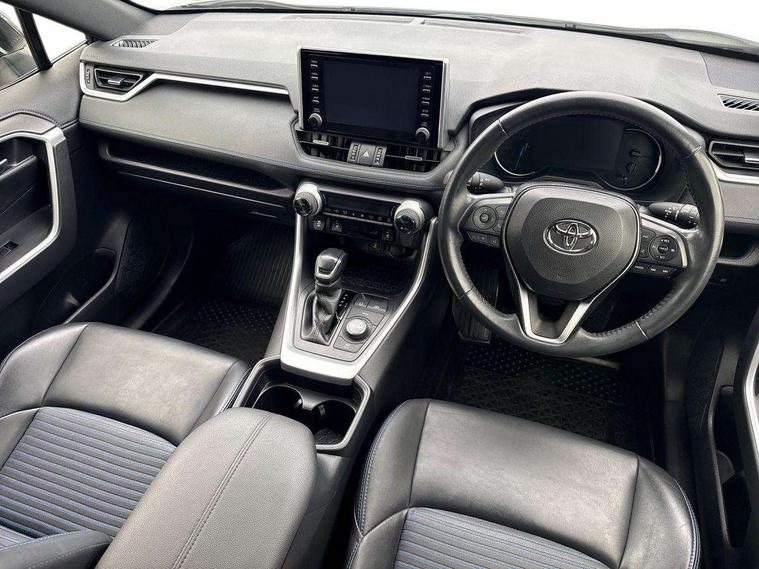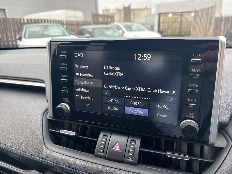 7" colour TFT display, Adaptive cruise control with lane trace assist, Adjustable speed limiter, Apple car play and Android auto, Blind spot monitoring with rear cross traffic alert, Bluetooth system, Cyclist Detection, Drive mode selector, eCall emergency call system, ECO-driving indicator, Electric power steering, EV audible alert, Hybrid system indicator, Lane departure warning system, Lights on warning, Night Time Pedestrian Detection, Pedestrial detection, Power boot opening and closing, Rear parking camera, Rear parking sensors, Remote boot door release in cabin, Tachometer, Touch 2 Go navigation system including 3D maps and voice control, Traffic sign recognition, Trip computer, Voice control system, Vehicle Stability Control (VSC), 6 speakers, 8" Multimedia display touch screen, Auxiliary socket for external MP3 player, DAB audio, Steering wheel mounted audio controls, Toyota touch media system, USB connection, Auto dimming interior mirror, Auto high beam, Automatic headlamp levelling, Automatic headlights, Automatically retractable door mirrors, Bi-tone black roof, Black door mirrors, Black rear spoiler, Black roof rails, Black Shark-fin antenna, Body colour door handles, Body coloured bumpers, Door mirror puddle lights, Electric adjustable door mirrors, Emergency brake-light signal (EBS), Follow me home headlights, Front fog lights, Gloss black front bumper insert, Gloss black rear bumper insert, Headlight cleaners, Heated door mirrors, LED daytime running lights, LED High mounted stop lamp, LED rear lights, Meshed upper front grille, Power front windows, Power rear windows, Privacy glass, Projector LED headlights, Rear screen wiper - intermittent, Rear windscreen defogger, Silver front under-run, Silver rear under-run, Trailer Sway Control, Turning signal integrated indicators in door mirrors, 3 rear headrests, 60/40 split fold rear seat back, Black roof lining, Boot light, Clean air filter, Driver and front passenger personal light, Driver and front passenger Whiplash Injury Lessening seats, Driver and passenger sunvisors with illuminated vanity mirrors, Dual sided deck board in boot, Dual zone automatic air conditioning, Floor mats, Folding rear centre armrest, Front and rear bottle holders, Front centre armrest, Front footwell lights, Front headrests, Front seat and rear pockets, Front sport seats, Front/rear roof mounted assist grips, Heated driver and front passenger seats, Isofix child seat preparation, Leather gear shift with chrome surround, Light blue ambient lighting on front cupholders and open tray, Manual telescopic and tilt 3-spoke leather steering wheel with Chrome insert, Manually reclining and sliding front passenger seat, Pollen filter, Power height-adjustable sliding reclining and lumbar support for driver seat, Rear coat hooks, Rear door armrests, Rear passenger air vents, Reclining rear seats, Satin chrome interior door handles, Sunglasses holder, Synthetic leather upholstery, 3x3 point rear seatbelts, ABS/EBD, Adjustable front driver and passenger seat belt extender, Brake assist function, Child proof door locks, Collision mitigation braking system, Driver/Front Passenger airbags, Driver/front passenger side airbags, Drivers knee airbag, Electronic parking brake, Electronic Stability Programme (ESP), Emergency brake light system (EBS), Front and rear curtain airbags, Front and rear seatbelt reminder, Hill start assist, Passenger airbag cut-off device, Seatbelt pretensioners with load limiters, Traction control, Tyre pressure warning, Alarm/immobiliser, Glass-breaking alarm sensors, Light - on and Key in reminder, Remote central locking, Smart entry + Smart start, Speed sensitive auto door locking, Tilt detection sensors, Piano black centre console with silver insert, Soft-touch black lower dashboard, Soft-touch black upper dashboard with silver insert, Full size spare wheel,
