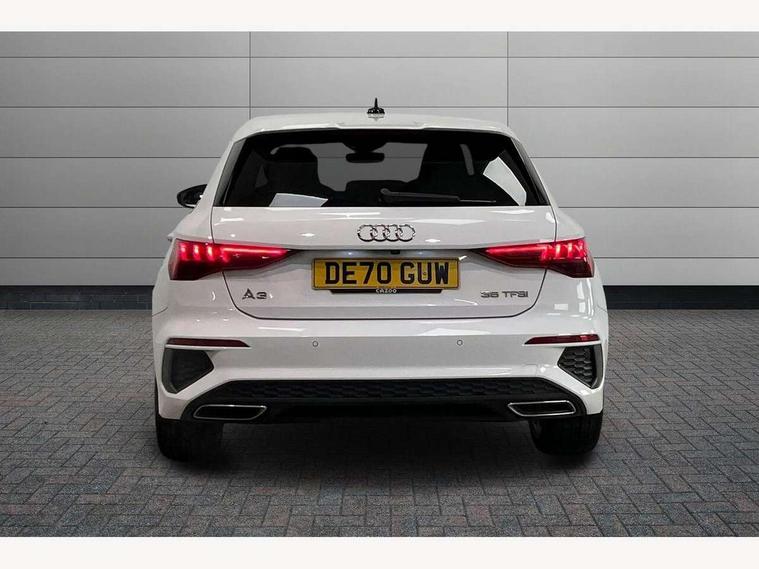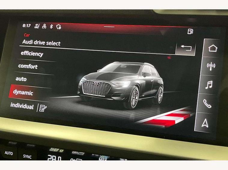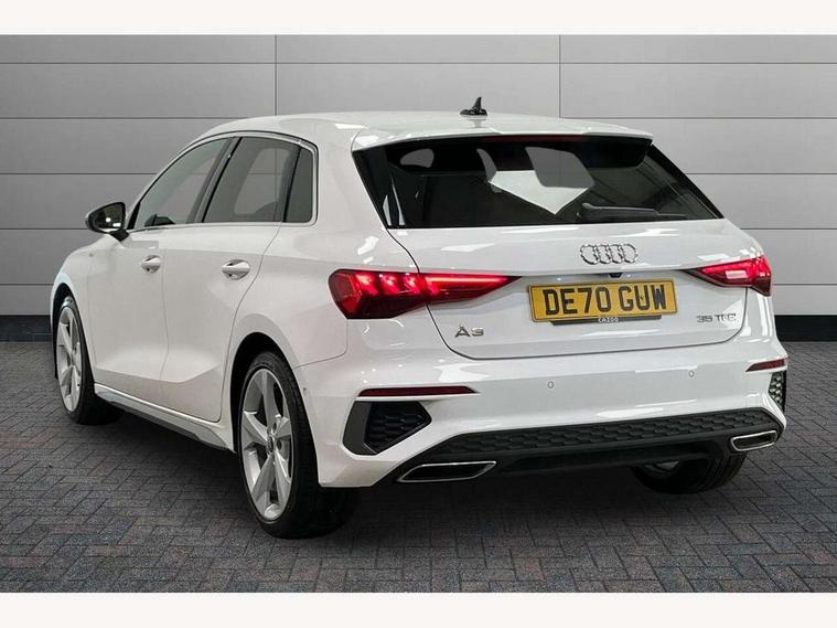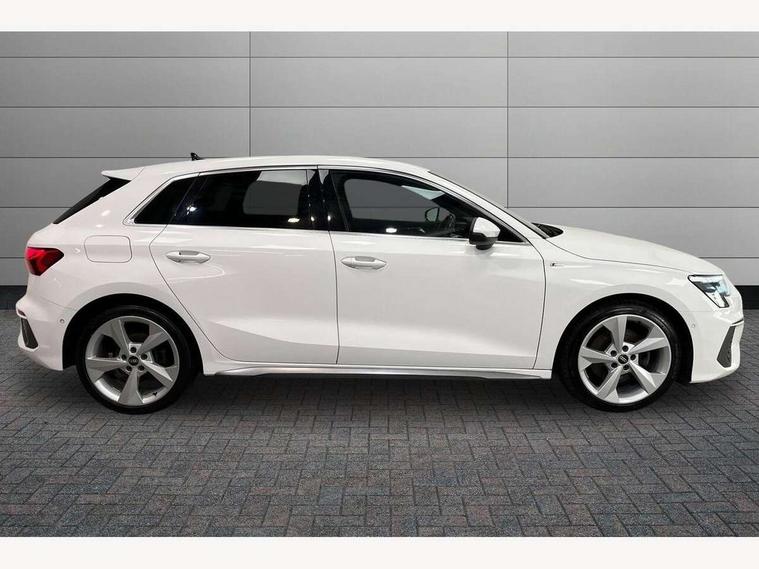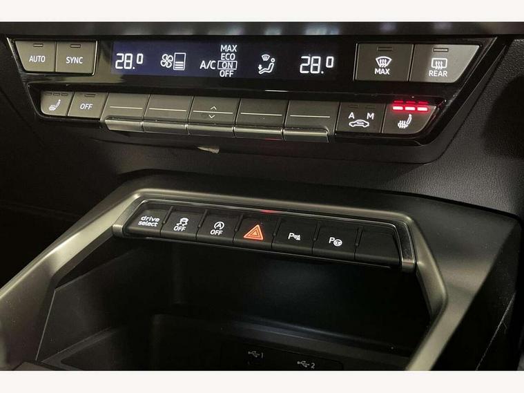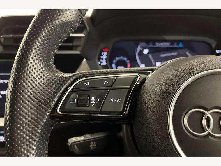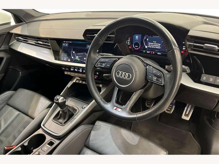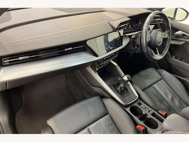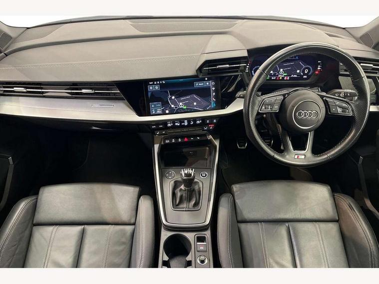Audi connect emergency call and service, Audi drive select (Auto, Comfort, Dynamic, Efficiency and Individual), Audi smartphone interface, Audi Virtual Cockpit - 10.25" digital and colour instrument cluster, Automatic start/stop system with recuperation, Bluetooth interface, Collision avoidance assistant, Cruise control, Electromechanical power speed sensitive steering, Lane departure warning system, MMI Navigation Plus with high resolution 10.1" colour touch screen display, Rear parking sensors, Service indicator, Trip computer, Voice control system with natural language interaction, 1xUSB-A and 1xUSB-C connection, 6 passive loudspeakers, DAB Digital radio, Acoustic glass windscreen, Aluminium window trim, Auto dimming frameless rear view mirror, Body colour exterior mirrors, Electrically adjustable/heated/folding/auto dimming door mirrors with integrated LED indications + kerb view function for passenger side, Front electric windows, Illuminated aluminium inserts front door sills with S logo, LED daytime running lights, Light and rain sensors, Privacy glass - dark tinted rear window, rear door and side windows, Rear electric windows, Rear side air outlets in grained matt black, Rear wiper, S line bumpers, S roof spoiler, 12V socket and storage compartment in front centre console, 40/20/40 split folding rear seat bench with cupholder, Black cloth headlining, Dual zone electronic climate control, Front and rear centre armrest in leather, Front and rear headrests, Front/rear floor mats, Height and reach adjustable steering wheel, Interior lighting - glove compartment light and right hand side, Luggage compartment floor covering, Manual boot compartment lid, Manually adjustable front seats, Seat side bolsters, Stainless steel pedals and front footrest, Twin leather upholstery with front sports seats S embossed logo, Aluminium interior elements pack - A3 Sportback, S line styling pack - A3 Sportback, 3x3 point rear seat belts, Driver and front passenger airbag with passenger airbag deactivation, Electronic Stabilisation Control (ESC) including ABS, ASR and EDL, First aid kit with warning triangle and 2 safety vests, Hill hold assist, Pre-sense front with pedestrian and cyclist detection, Seatbelt monitoring, Tyre pressure loss indicator, Anti theft alarm, Anti-theft wheel bolts, Electronically operated child lock, Immobiliser, Remote control central locking, Accent surfaces in the dashboard and centre console in platinum grey silk effect paint finish, Dark spectrum aluminium inlays,