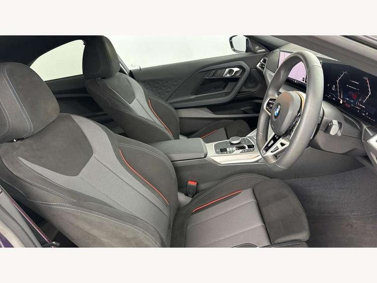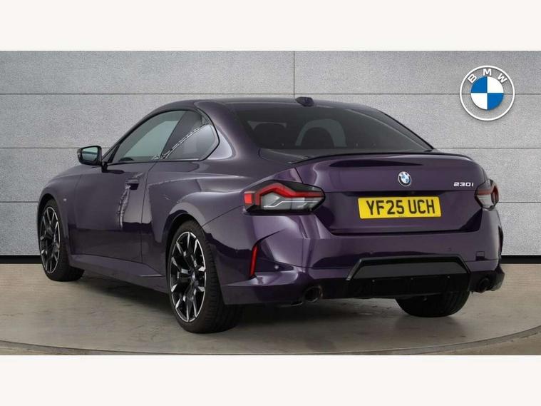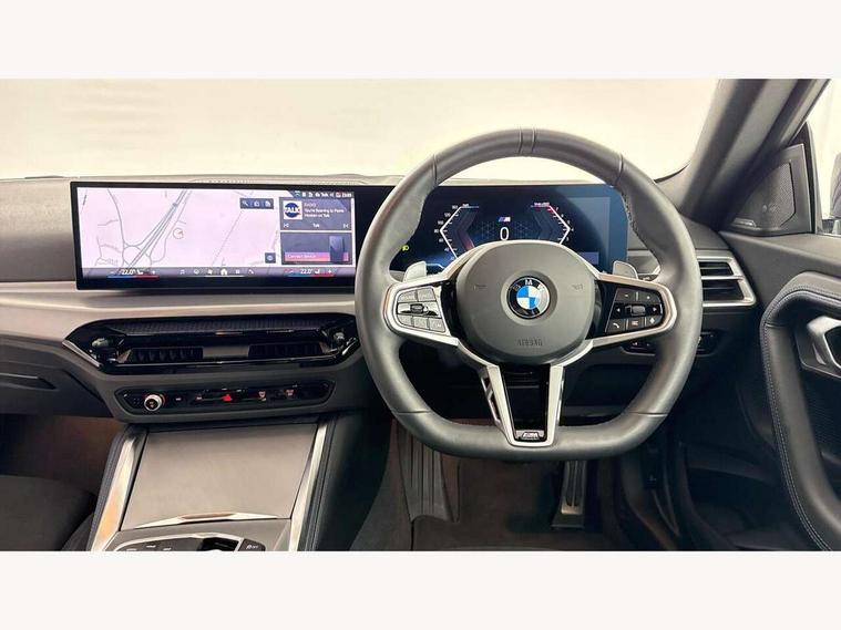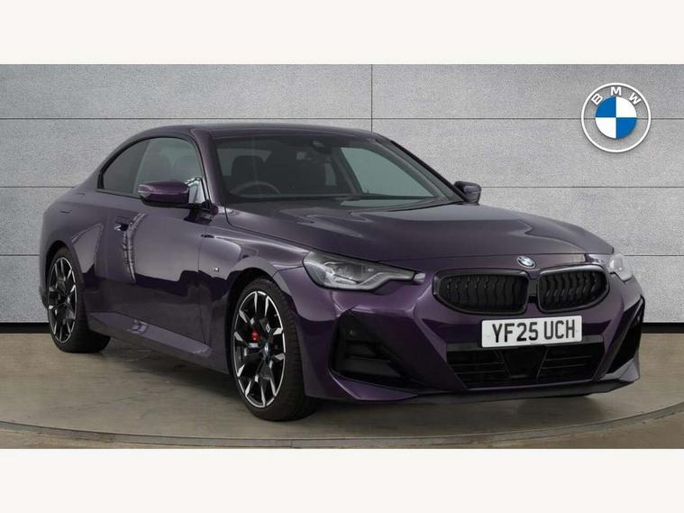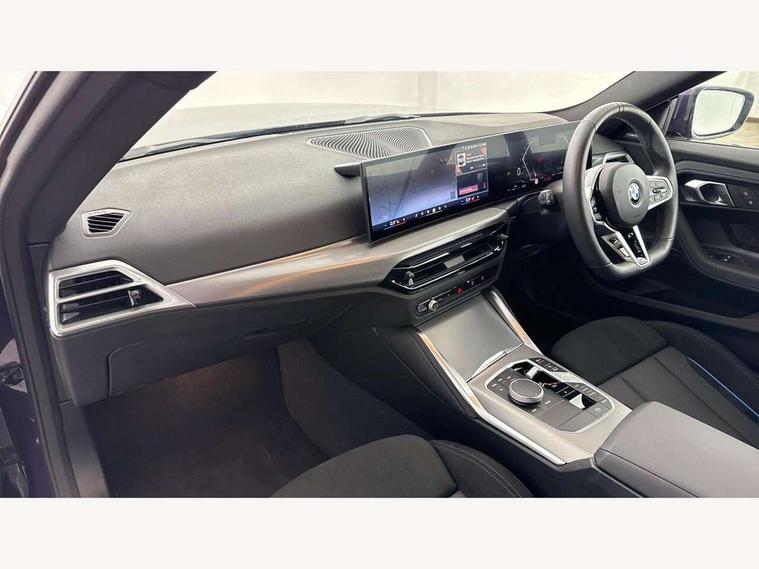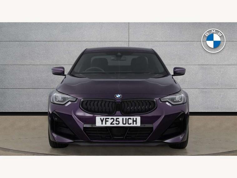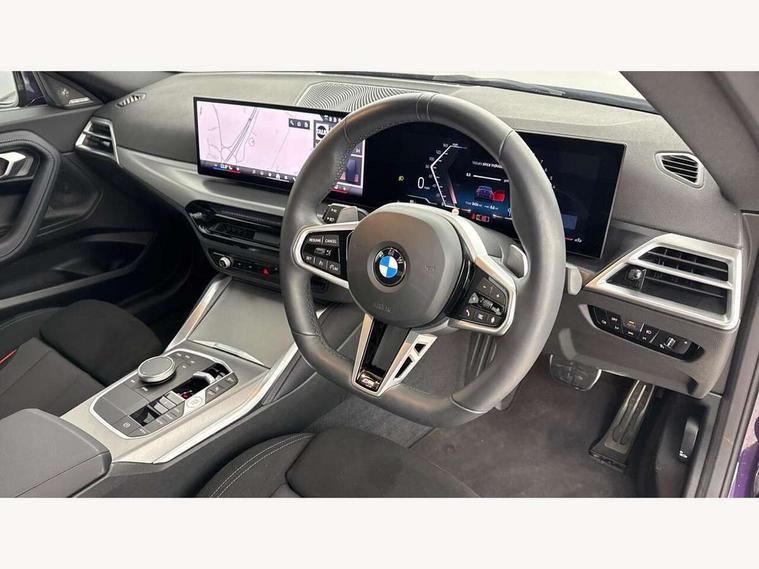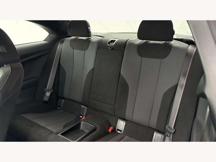 2 USB connections for charging and transferring data, Active guard plus, Attentiveness assist, Bluetooth with USB, BMW ConnectedDrive online services, BMW Intelligent Personal Assistant, BMW Live cockpit plus, BMW operating system 8 with variable, configurable widgets display information in real time, BMW Teleservices, Check Control warning system for monitoring of lights and door/luggage compartment open warning, Control Infotainment, Direct selection buttons, Drive off assistant, Eco pro mode, Electric power steering, eSim with 5G connectivity, Front and rear parking sensors, iDrive controller with turn and press function, Integrated owners handbook, Intelligent functions, Oil sensor for level and grade, Optimum shift indicator, Personal Profile, Smartphone integration, Touch operation on control display, Variable sport steering, Widescreen multi-media display, WiFi interface for wireless connection of mobile terminal devices, Aluminium lightweight construction, Balancer shaft, BMW TwinPower Turbo four-cylinder petrol engine, Double VANOS, Drive performance control with ECO PRO comfort + sport mode, Electronic differential lock, High precision injection, M sport suspension, Petrol Particulate Filter, Steptronic transmission with gearshift paddles, Twin scroll turbocharger with Valvetronic, DAB tuner, Acoustic windscreen wipers for reduced driving noise, Automatic windscreen wipers and automatic headlight, Body colour door handles flush with door surface, Body colour door mirrors, Body colour front and rear bumpers, Daytime running lights, Electric windows - front and rear, with open/close fingertip control and trap release, Exhaust tailpipes x2 - 90mm in left and right, Fading support, Front and rear bumper system with replaceable deformation elements, Front door sill finishers in black plastic with BMW designation, Front windscreen wipers with integrated washer jets, Green tinted heat protection glazing, High beam assistant, High gloss black sill, bumper trim sides and diffuser insert, High level third brake light, Indicators integrated int mirror housing, Interior rear-view mirror with automatic anti-dazzle function, LED registration plate light, LED technology rear tail lights, brake lights and turn indicators, Lightweight engineering, M high gloss shadowline, One piece kidney grille with hight gloss chrome surround, Rear boot, Rear fog lights, Reversing light in rear light cluster, Shark fin antenna, Single part LED rear lights with smoked glass components, Trailer stabilisation logic, Visible VIN plate, 12V power socket in front centre console with blanking plug, 2 cupholders in front centre console, 2 zone automatic air conditioning, Ambient lighting, Compartment in front of cupholder, Conditioned based service, English handbook, Folding rear seat head rests, Front and rear side armrests integrated into door trim, Front armrest, Front door pockets, Front head restraints, Heated front seats, Illuminated glove compartment with separate small compartment, M headliner Anthracite, M sport leather steering wheel, Manually adjustment steering wheel column, Rear seat backrest with manual 40:20:40 split folding, Rear seat centre foldable armrest with integrated cup holder, Single front passenger seat, Storage compartment between rear seats, Storage tray and compartment with cover in centre console, Sun visors with vanity mirrors and insert tab, Through loading system with 40/20/40 split folding 2 rear seat in 2nd row, Velour floor mats, Additional storage compartment pack without USB - 2 Series Coupe, Connected pack professional - 2 Series Coupe, 2 tone horn, Anti lock braking system (ABS) with cornering brake control, Automatic Stability Control (ASC), BMW emergency call, Brake drying, Child seat ISOFIX attachment for the two outer rear seats, Crash sensor activating of airbags, Unlocking doors, hazard warning lights, interior light, safety battery terminal, Deactivation of fuel pump in the event of a crash, Driver and front passenger airbags, Driver and front passenger side airbags, integrated in the door side seat backrest bolsters for all seat variants, Dynamic brake control, Dynamic stability control + (DSC+), Dynamic Traction Control - DTC, Electrically operated hand brake including automatic hold function and automatic release when driving off, Front and rear disc brakes, Front centre airbag between driver and front passenger seats, Front passenger airbag deactivation, Head airbags for all 4 outer seats, PC iBrake (Post crash approach control warning with light braking function), Seat belt security check for driver and front passenger, Seatbelt warning, Side impact protection, Three point seat belts on 4 seats including front belt stopper, pyrotechnic belt tensioners and belt force limiters, Tyre pressure monitoring system, Warning triangle and first aid kit, Alarm system (Thatcham 1) with remote control and electronic engine immobiliser, Central locking switch for all doors, fuel filler cap and luggage compartment, Deadlocking function system to all doors, Drive away locking system on all doors and luggage compartment, Locking wheel bolts, Start/Stop button (illuminated) in centre console with keyless engine start and Auto Start-Stop deactivation button, Two remote control key with integrated key - one button for open and close doors/fuel flap/tailgate and separate button for unlock luggage compartment, Electrically powered 12V compressor, Reduced rolling resistance tyres, Tyre repair kit,