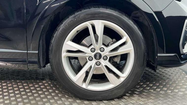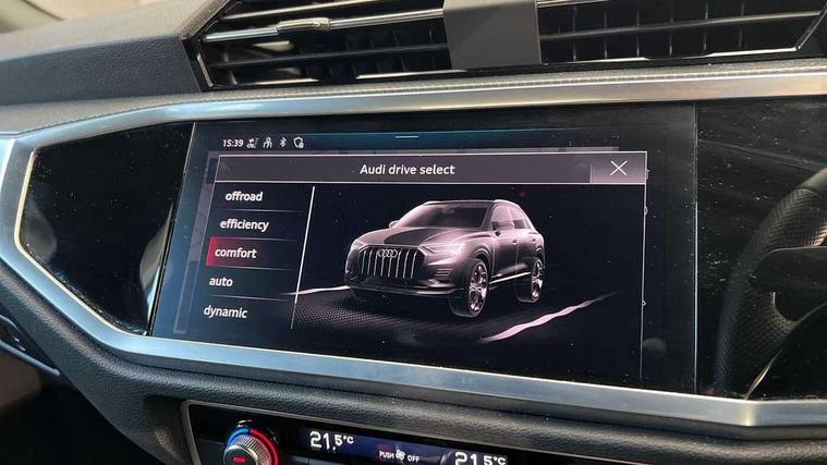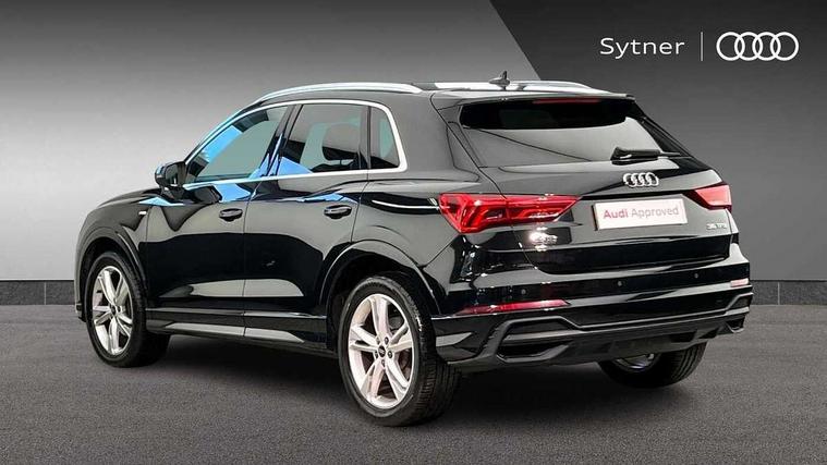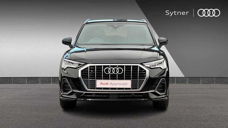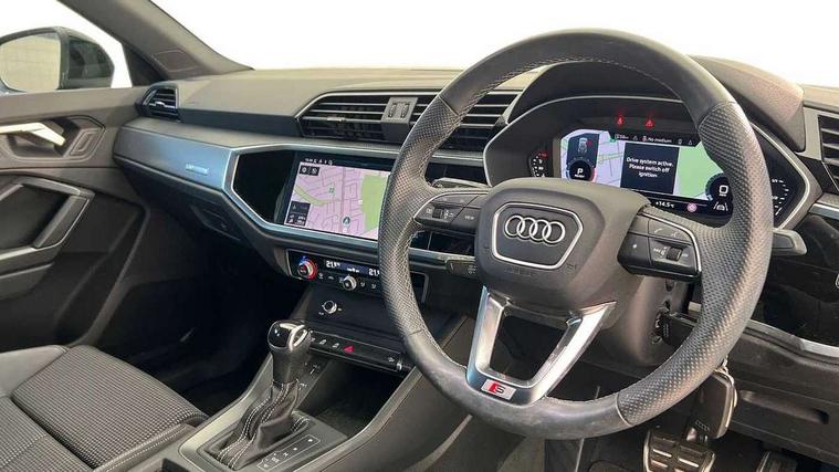 Amazon alexa Integration, Audi drive select, Audi lane departure warning, Audi Virtual Cockpit - 10.25" display, Bluetooth interface, Camera based traffic sign recognition, Legal emergency call, MMI Navigation Plus with high resolution 10.1 inch touchscreen colour display, Power operated tailgate, Progressive steering, Service interval indicator, Smartphone interface includes wireless Apple carplay/Android Auto, Start stop system with recuperation, Voice control system with natural language interaction, Sports suspension, 2 USB-C ports with charge and data functions, 6 passive loudspeakers, DAB digital radio module, Acoustic windscreen, Aluminium roof rails, Aluminium window trim, Auto dimming frameless rear view mirror, Body colour front spoiler blade, Body coloured bumpers, Electrically folding, adjustable and heated door mirrors with integrated LED side indicators and kerb view function for passenger side, Front and rear electric windows, Front fog lights, Front side air inlets in matt platinum grey, Grille vertical bars in aluminium silver/Matt, High gloss black finish B and C pillars, LED Dynamic rear indicators, LED headlights with LED daytime running lights, LED rear lights, LED third brake light, Privacy glass dark tinted rear and rear-side windows (from B-pillar backwards), Rain and light sensors, Rear diffuser grille in grained matt black, Rear diffuser strip in matt titanium black, Rear side wing doors, Rear wiper, S line badges on front wings, S Line front and rear bumpers, Side skirt insert in matt Platinium grey, Titanium black radiator grille, Variable front intermittent wipers, 12V socket in rear centre console, 3 seat bench in 2nd row, 40:20:40 folding with manual adjustment for 60:40 forwards/backwards position and backrest angle, Adjustable rear seat bench/backrest with centre armrest and cupholder, Black cloth headlining, Dual zone electronic climate control, Front and rear black floor mats with contrast stitching in rock grey, Front and rear headrests, Front and rear roof module including reading lights, Front centre armrest, Glove compartment lighting, Height and reach adjustable steering wheel, Illuminated door sill trims with S logo, ISOFIX child seat mounting for front passenger with airbag deactivation and outer rear seat including top tether attachment point for outer rear seats, Luggage compartment light, Manual front seats with height adjustment, Perforated leather gearknob, Single front passenger seat, Stainless steel luggage compartment sill finisher, Stainless steel pedals, Ambient lighting pack - Q3, Non smoking pack - Q3, 3x3 point rear seatbelts, 6 airbags - Driver, front passenger, curtain and side windows, Audi pre-sense front with pedestrain and cyclist recognition, Electrically operated child locks on rear doors, Electromechanical parking brake, Electronic stabilisation control including ABS, ASR and EDL, Front seatbelt reminder, Hill descent control, Hill hold assist, Pre sense basic, Seatbelt monitoring, Tyre pressure warning, Warning triangle and first aid kit, Anti theft alarm, Anti theft wheel bolts, Immobiliser, Remote central locking, Dark matt brushed aluminium inlay, Detail dashboard around MMI touch colour display in glass look, black with surround in aluminium look, Leatherette door armrest,