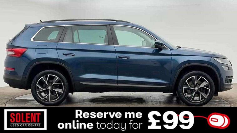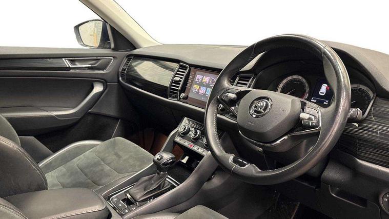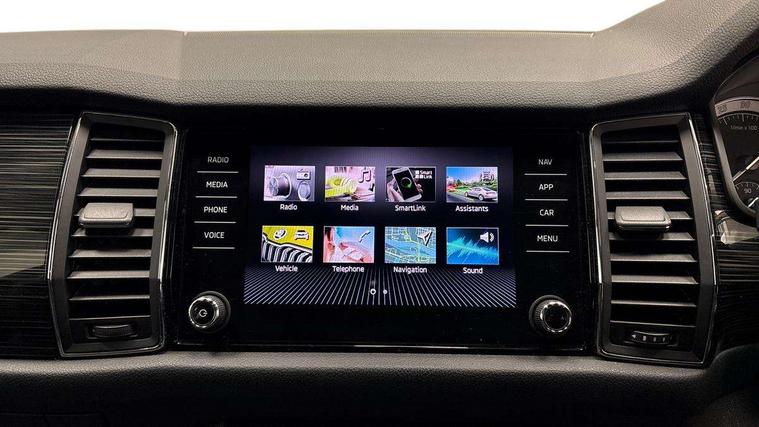 Bluetooth system, Digital voice enhancement, ECO Stop/start function, Exterior temperature indicator, Map care, Smartlink wireless for apple carplay and wired for android auto, Speed limiter, Tailgate unlocking from outside, USB C Port x 2 in front centre console, DAB Digital radio, Aero front windscreen wipers with intermittent function, Aero rear window wiper, Auto dimming rear view mirror, Automatic activation of hazard warning lights, Black electric window control buttons, Black wheel arch surrounds, Body colour bumpers, Body colour door mirrors and handles, Electric adjustable heated door mirrors with integrated indicators, Electric front and rear windows, Electrically folding and auto dimming door mirrors, Front and Rear door steps, Full LED Headlights with adaptive front light system and LED daytime running lights, Headlight washers, Heated rear window, Invisible tailpipe, LED front fog lights with static cornering light function, LED rear fog light, LED third brake light in rear spoiler, Light assistant (coming home/tunnel light), Radiator grille frame in matt black with chrome strip, Rain and light sensors, Rear spoiler, Safety reflectors on front and rear doors, Sunset privacy glass, 12V socket in boot, 2 rails with 2 hooks including 4 hooks for net programme, 4 foldable roof handles with rear coat hooks, 4 lashing points on luggage floor, 60:40 foldable rear seat with sliding adjustment and backrest angle adjustment, Bottle holders in door panel in the 1.5 litre front and 1 litre rear, Cargo storage compartments, Centre console with open storage box, cup holder and 12V socket, Chrome headlight control button, Chrome interior door handles, Coat hooks on B pillar, Covered storage compartment on driver side, Front and rear door armrest with black adductor trim, Front and rear height adjustable headrests, Front centre armrest with storage compartment, cup holder and 12V socket, Front courtesy lights, Gear shift lever with chrome frame and black gloss insert, Illuminated and cooled glovebox, Illuminated luggage compartment, Isofix child seat fittings in outer rear seats with top tether, Manually adjustable steering column, Net programme in boot (1x horizontal Net, 2x vertical Nets), Overhead glasses storage compartment, Pollen filter, Rear centre armrest with cupholders, Roll up luggage compartment cover with intermediate position, Small Bags on the inner sides of the front backrests, Storage compartment in lower middle instrument panel with closing, Three rear height adjustable headrests, Ticket holder on A Pillar, Umbrella in door panel, Chrome pack - Kodiaq, Auto door release and activation of warning lights in the event of an accident, Driver and passenger airbags, Electronic parking brake with hill hold control, Emergency rear braking signal, ESC (incl. ABS+MSR+ASR+EDS+HBA+DSR+RBS+MKB), Front and rear three point safety belt on all seats, Front assist includes AEB city/urban, Front passenger airbag deactivation switch, Front side airbags, Fuel cut off safety device, Head and knee airbags, Rear disc brakes, Safety vest holder in door, Seat belt reminder for all seats, Two tone horn, Tyre pressure monitor, Warning lights in front doors, Alarm with interior monitoring and tilt sensor with safe function, Immobiliser, Keyless entry and start system (KESSY), Remote central locking,