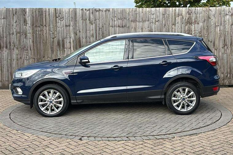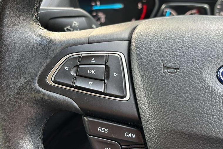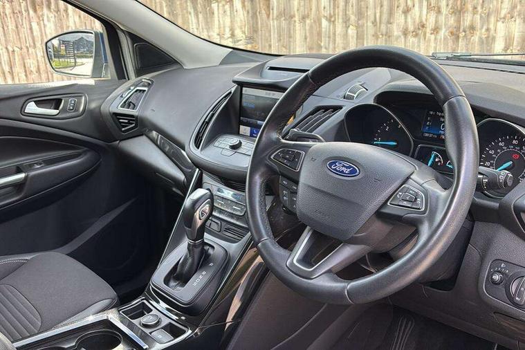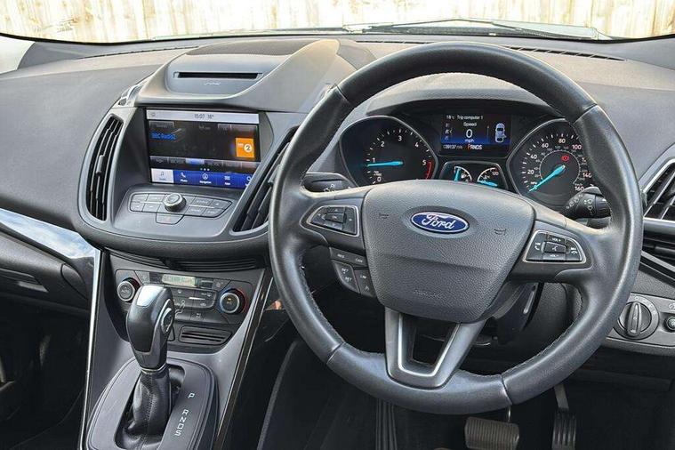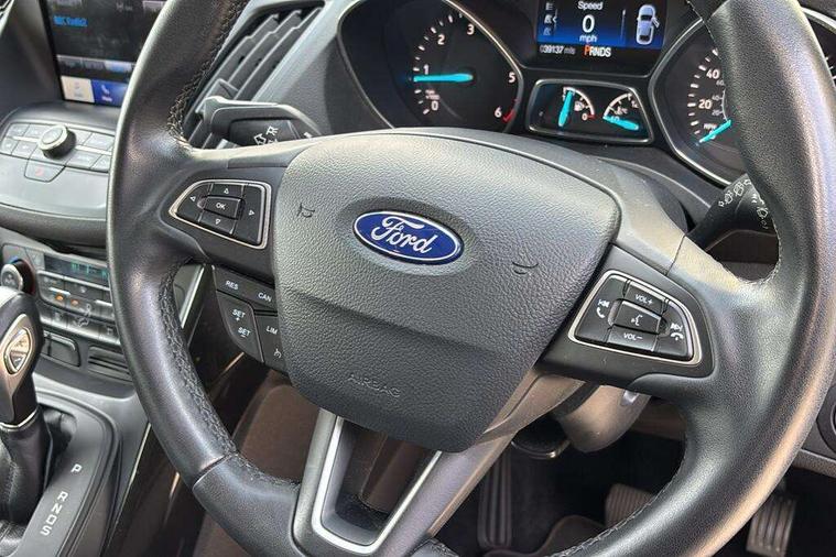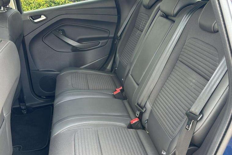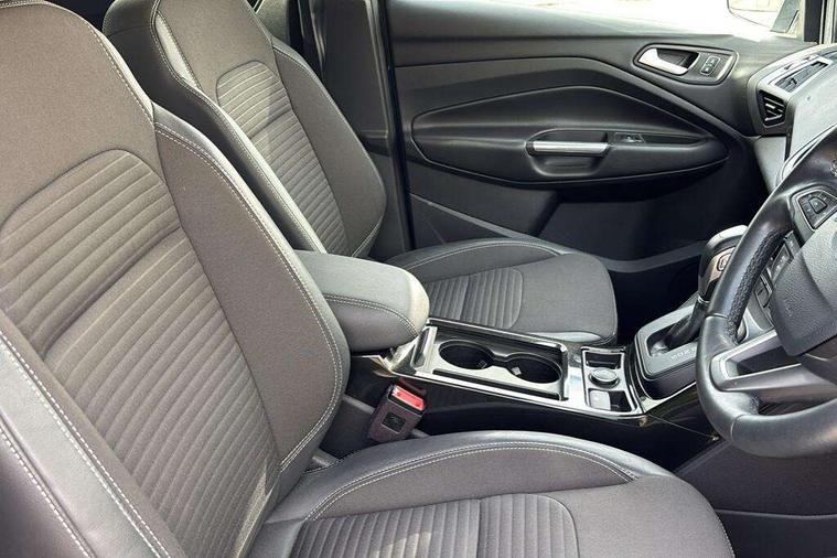 Apple car play/Android Auto, EPAS, Hands free telephone, Trip computer, Auxiliary socket for external device, Remote audio controls on steering wheel, USB connection, Auto dimming rear view mirror, Automatic halogen headlights with LED daytime running lights, Body colour bumpers, Body colour rear spoiler, Electrically operated and heated door mirrors with side indicators, Electrically operated front and rear windows with global closing, Front fog lights, Front scuff plate, Power folding door mirrors, Quickclear heated windscreen, Rain sensor windscreen wipers, Tailgate wash/wipe, Twin exhausts and rear diffuser, 6 way manually adjustable passenger seat with lumbar support, 60/40 split/folding rear back and cushion, Auxiliary power socket in luggage area, Centre console with stowage tray/bottle holder/CD stowage/front and rear 12V power point, Driver/passenger front seatback pockets, Dual electronic automatic temperature control, Folding rear centre armrest, Footwell courtesy lights front and rear, Front floor mats, Front head restraints, Front overhead courtesy lights with theatre style dimming and delay, Front/rear reading lights, Gearshift paddles, Isofix system on outer rear seats, Leather steering wheel and gear knob, Multi-colour ambient interior lighting, Part leather upholstery, Reach + rake adjustable steering column, Rear floor mats, Rear head restraints, Sports style front seats, Stowage unit in upper instrument panel, Tie down hooks, Tonneau cover, Variable intensity instrument illumination, Appearance pack - Kuga, 3 point seatbelts on all 3 rear seats, ABS/EBD, Airbags - front driver/passenger, front and rear curtain, Drivers knee airbag, EBA, Electric traction assist system, Electronic Stability Programme, Front passenger airbag deactivation switch, Hill start assist, Intelligent Protection System (IPS), Tyre pressure monitoring system, Immobiliser, Keyless entry, Keyless start with 'Ford Power' starter button, Locking wheel nuts, MyKey system, Remote central locking, Thatcham Cat.1 alarm, Mini steel spare wheel,