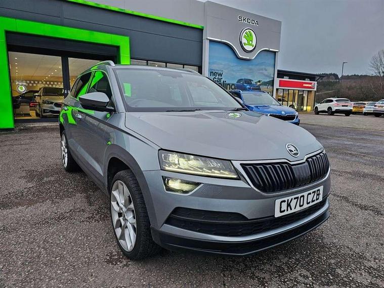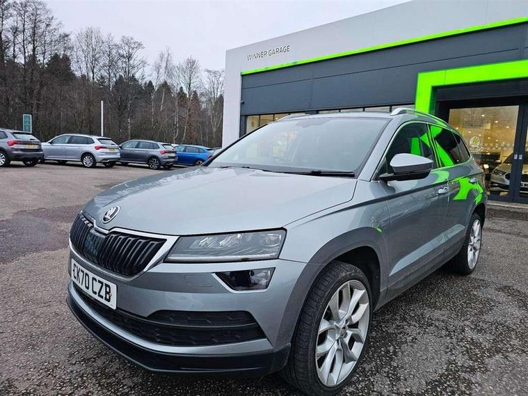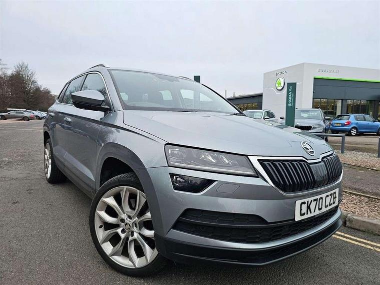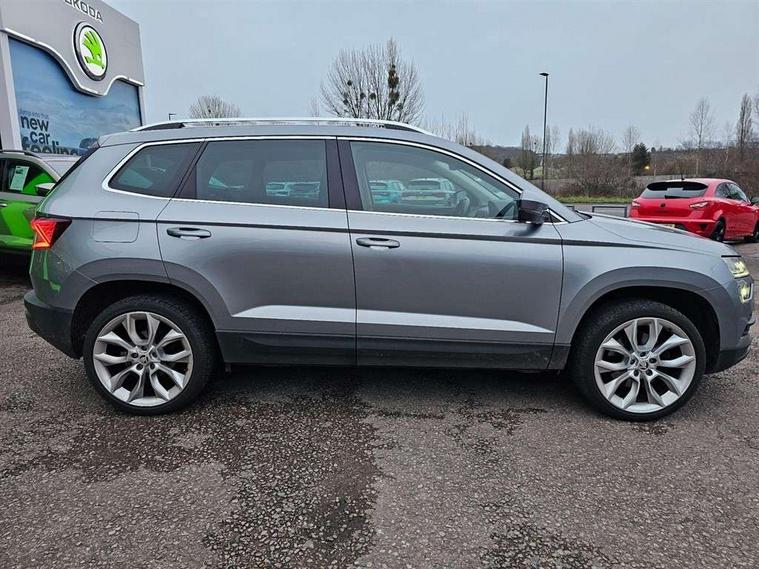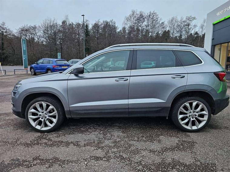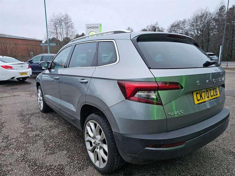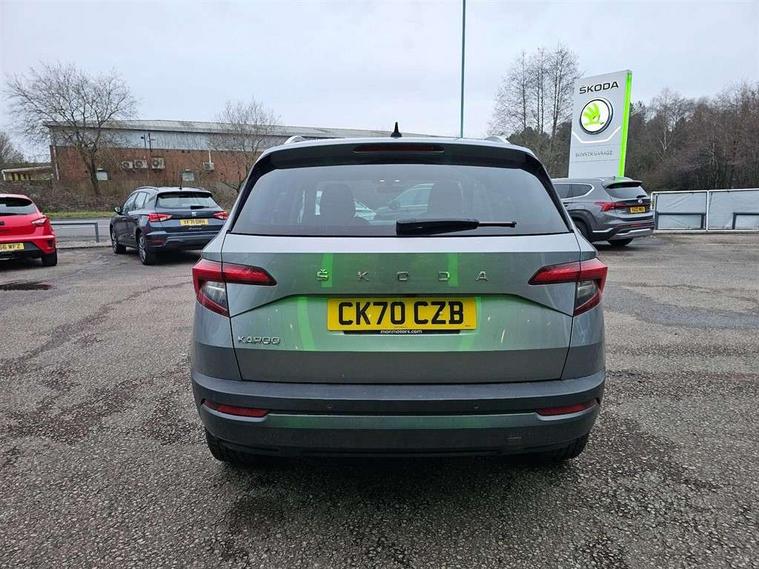 Care connect, Drive mode selector, Driver alert system, Driver fatigue sensor, Driver profile selection, Multifunction colour trip computer, Outside temperature gauge, Rear view camera, Service interval indicator, SmartLink + wireless for Apple and wired for Android, Start/stop system with regenerative braking, USB C Port x 2 in front centre console, DAB radio with Bluetooth, SD card slot, USB connection, Acoustic glass, Aero front windscreen wipers with intermittent function, Automatic headlight control system, Black electric window control buttons, Body colour door mirrors and handles, Body coloured bumpers, Electric front and rear windows with child proof lock, Full LED headlights + adaptive front light system + LED daytime running lights and front cornering fog lights, Headlight washers, Heated rear windscreen, LED rear lights with high functionality, Light assistant (coming/leaving home/tunnel light), Privacy glass, Safety reflectors on front doors, Third brake light, 1.5 litre bottle holders in driver and front passenger door panels, 12V socket in boot, 12v socket in front centre armrest with storage compartment and rear air vents, 2 Folding hooks and nets in boot, 2 Front readings lights for driver and passenger, 3 rear height adjustable headrests, 4 foldable roof handles with rear coat hooks, 4 lashing points on luggage floor, Backrest release, Cargo elements in boot, Chrome inner door handles, Folding tables on the front seat backrests, Front head restraints, Front seat and rear pockets, Height adjustable front three point seats belts with tensioners, Height adjustable passenger seat, Height/reach adjust steering wheel, Ice scraper, Illuminated and cooled glovebox, Illuminated luggage compartment, Isofix child seat preparation outer rear, Net programme in boot, Pen holder, Pollen filter, Rear boot cover, Rear reading lights, Rear seats fixed folding and divided 60:40, Retractable parcel shelf attachable to tailgate, Safety vest holder, Storage box in upper central dashboard closed, Storage compartment below the passenger seat, Sunvisors with illuminated vanity mirrors, Textile floor mats, Umbrella under passenger seat, VarioFlex seats with retractable parcel shelf, Chrome roof rails + chrome pack - Karoq, Airbags - Front side, head, knee and curtain, Automatic door unlocking in case of crash, Automatic fuel cut off in case of crash, Driver airbag, Electronic parking brake with auto hold function, Emergency rear braking signal, ESC including ABS, MSR, ASR, EDS, HBA, DSR, RBS, MKB and traction control, Front assist radar scanning of the space in front of the car with automatic braking, Hill hold control, Passenger airbag with switch-off function, Pedestrian monitor, Seatbelt reminder signalisation and pretensioner for all seats, Three point seatbelts rear, Two tone horn, Tyre pressure display, Tyre pressure monitor, Alarm with interior monitoring, back up horn and tilt sensor with safe function, Electronic engine immobiliser, Keyless entry and keyless start with safe system, Remote central locking with 2 remote folding keys, Chrome framed air vents, 19" Crater alloy wheels with anti theft wheel bolts, Storage on wheel cover,