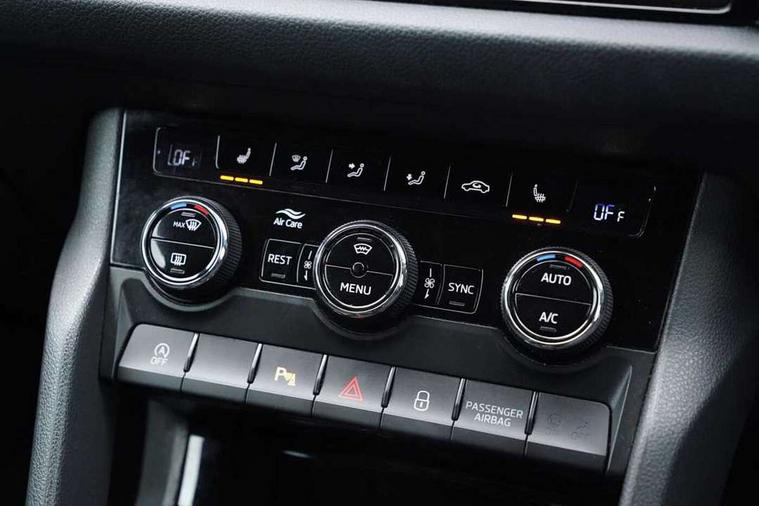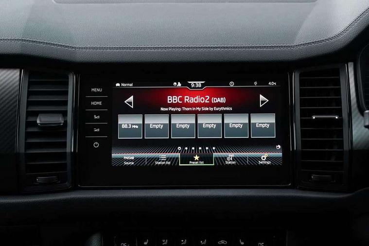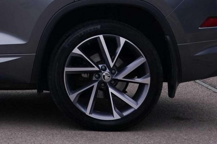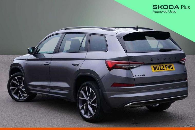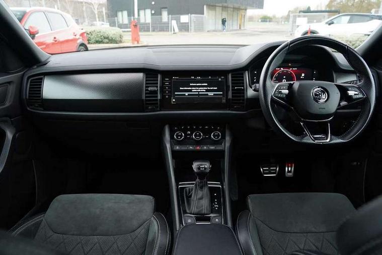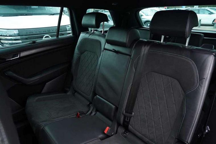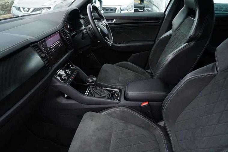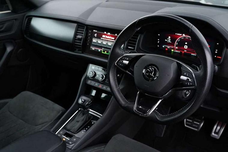 Bluetooth system, Columbus satellite navigation with 9.2" touchscreen, integrated Wi-Fi, web radio, E-call, ECO Stop/start function, Exterior temperature indicator, Progressive steering, Rear view camera, Smartlink wireless for apple carplay and wired for android auto, Speed limiter, Tailgate unlocking from outside, USB C Port x 2 in front centre console, Wireless charging, 8 Speakers, DAB Digital radio, Aero front windscreen wipers with intermittent function, Aero rear window wiper, Auto dimming rear view mirror, Black roof rails, Black sports styling including front grille and window surrounds, Black wheel arch surrounds, Body colour bumpers, Body colour door handles, Electric adjustable/heated/folding door mirrors, driver side auto dimming with boarding sports and memory function, Electric front and rear windows, Extended rear spoiler with finlets in gloss black, Front fog lights, Full LED matrix headlights with AFS (adaptive front light system), cornering function and AWL (all weather lighting system), Gloss black door mirrors, Headlight washers, Heated rear window, Invisible tailpipe, LED daytime running lights, LED rear fog light, LED third brake light in rear spoiler, Light assistant (coming/leaving home/tunnel light), Off-road style lower front bumper element, Privacy glass, Rain and light sensors, Rear diffuser, Rear LED lights (high functionality) with welcome effect and dynamic indicators, Rear side wing doors, Safety reflectors on front and rear doors, Sportline badge on front fender, Sports front and rear bumpers including lower rear chrome strip, Tailgate lettering in Black, Window control switches with black trim, Without engine designation, 12V socket in boot, 2 rails with 2 hooks, 2 seat bench in 3rd row, 3 seat bench in 2nd row, 4 foldable roof handles with rear coat hooks, 60:40 foldable rear seat with sliding adjustment and backrest angle adjustment, Aluminium pedals, Black roof headlining, Bottle holders in door panel in the 1.5 litre front and 1 litre rear, Cargo storage compartments, Chrome headlight control button, Chrome interior door handles, Coat hooks on B pillar, Covered storage compartment on driver side, Decorative door sills in the front and rear, Front centre armrest with storage compartment, cup holder and 12V socket, Front courtesy lights, Gear shift lever with chrome frame and black gloss insert, Grey stitching in front and rear armrests and door armrests + door inserts, Height adjustable front headrests, Illuminated and cooled glovebox, Illuminated luggage compartment, Isofix child seat fittings in outer rear seats with top tether, Manually adjustable steering column, Microsuede door panels, Net programme in boot (1x horizontal Net, 2x vertical Nets), Overhead glasses storage compartment, Pollen filter, Rear centre armrest with cupholders, Single front passenger seat, Sliding trunk cover, Small Bags on the inner sides of the front backrests, Sports seats, Sunvisors with illuminated vanity mirrors, Three rear height adjustable headrests, Ticket holder on A Pillar, Umbrella in door panel, Variable boot floor, LED Interior light pack - Kodiaq, Auto door release and activation of warning lights in the event of an accident, Child locks on rear doors, Driver and front passenger airbag with knee airbag and front passenger airbag deactivation, Electronic parking brake with hill start assist, Emergency rear braking signal, ESC (incl. ABS+MSR+ASR+EDS+HBA+DSR+RBS+MKB), Front assist with autonomous emergency braking, Front side airbags with curtain airbags, Fuel cut off safety device, Height adjustable front 3 point seatbelts + pretensioners, Hill hold control, Rear disc brakes, Safety vest holder in door, Seat belt reminder for all seats, Three point rear seat belts, Two tone horn, Tyre pressure monitor, Alarm with interior monitoring and tilt sensor with safe function, Anti-theft wheel bolts, Immobiliser, Keyless entry and start system (KESSY), Remote central locking with 2 keys, Black air vent surround, Carbon finish dashboard and door inserts, Grey stitching in dashboard, 20" Vega Anthracite alloy wheels, Temporary spare wheel (space saver),