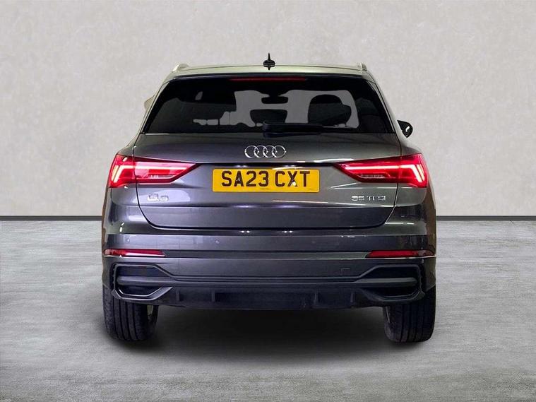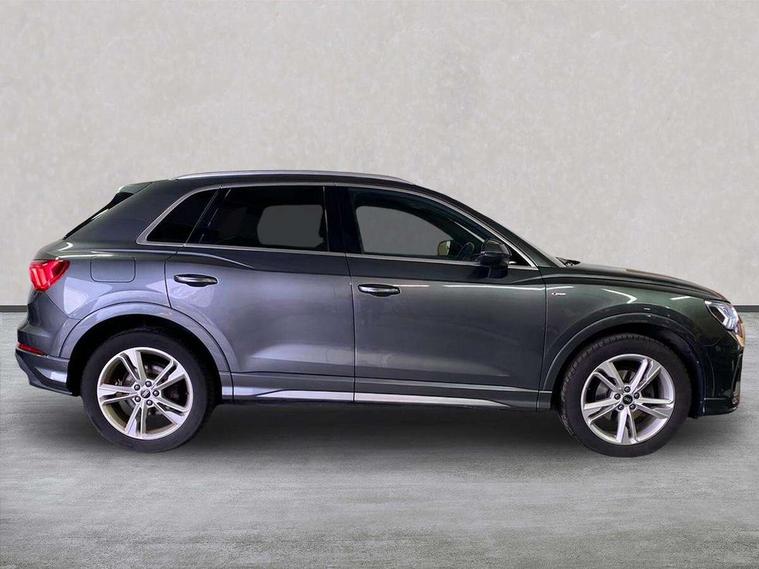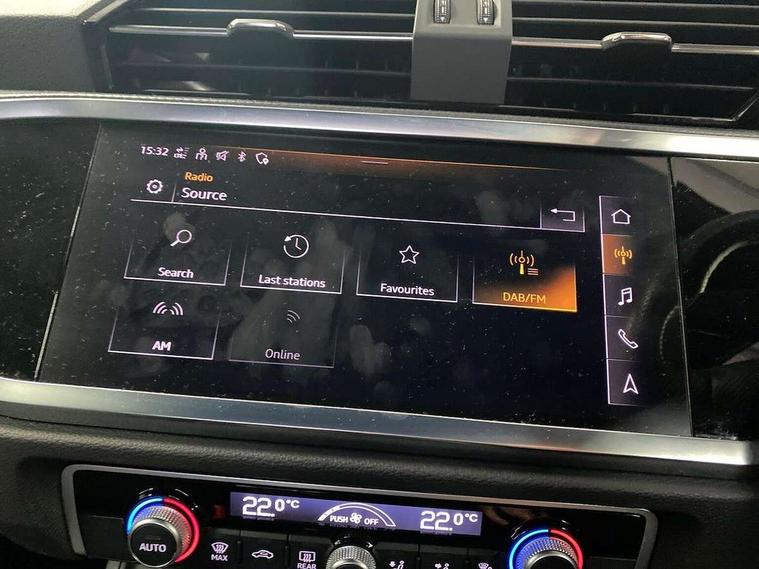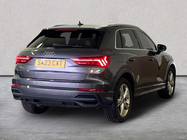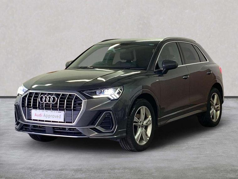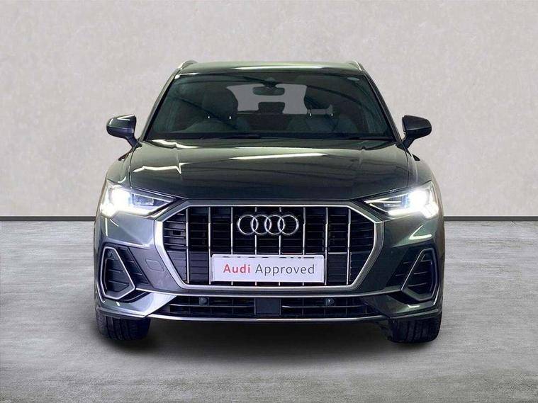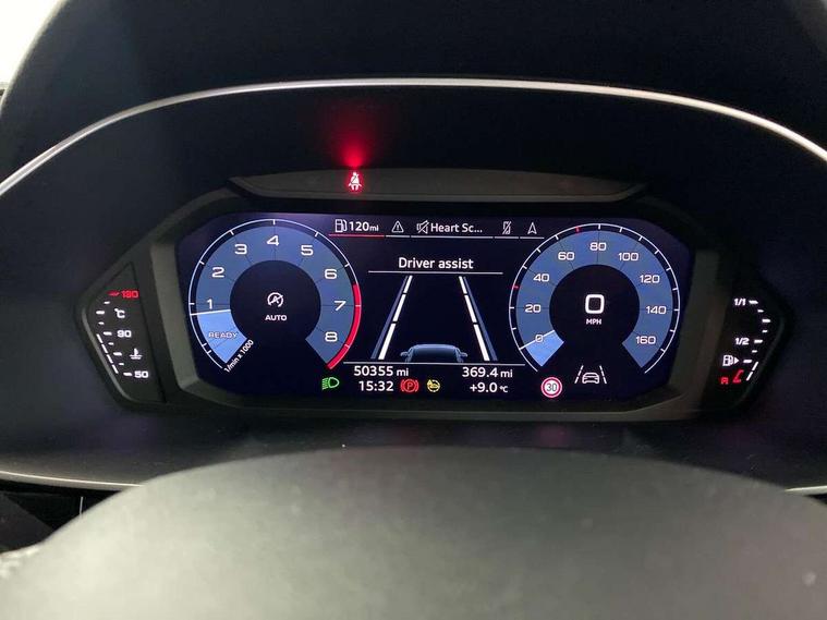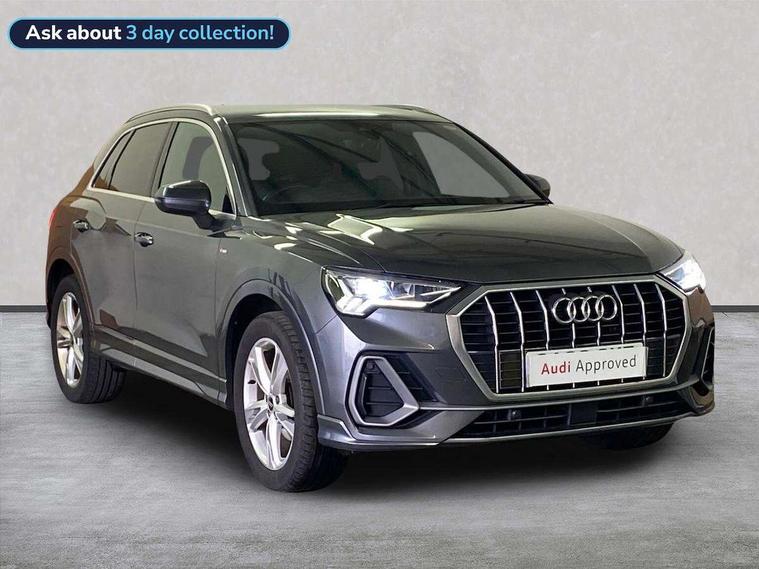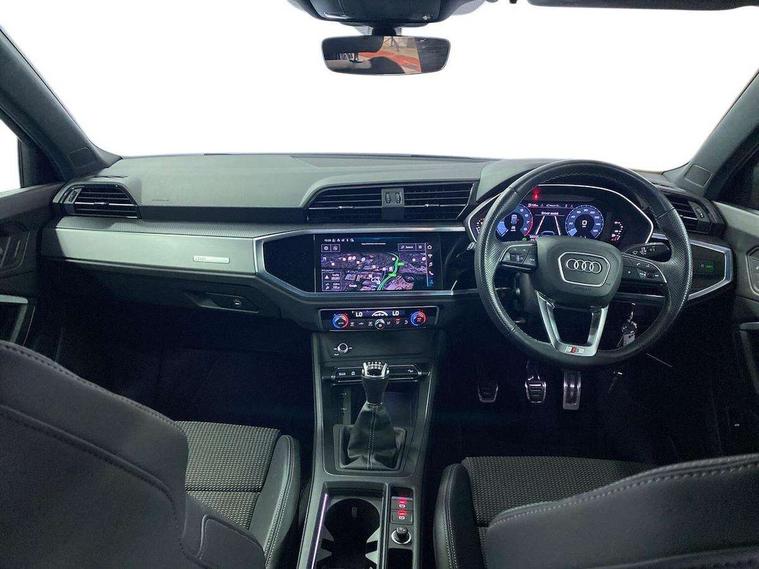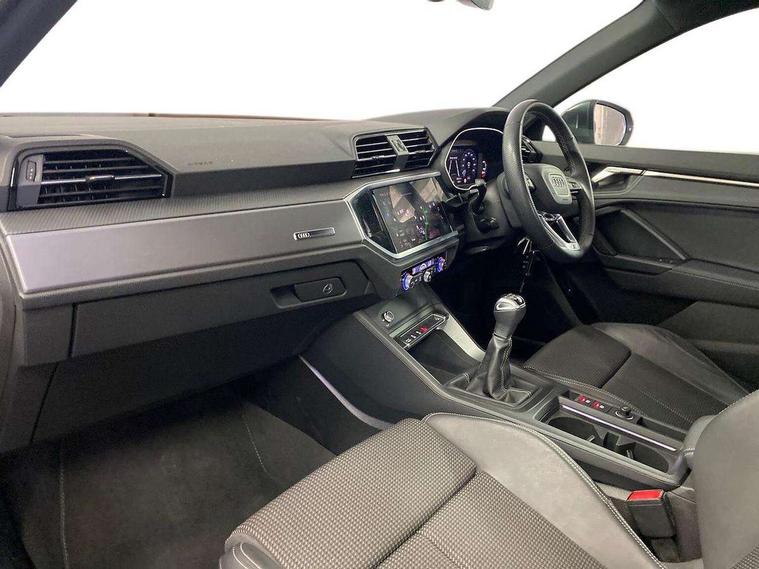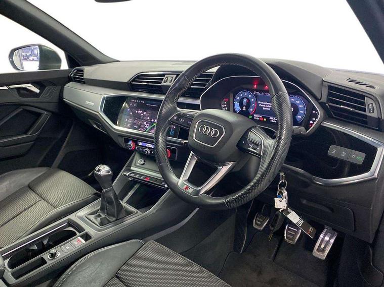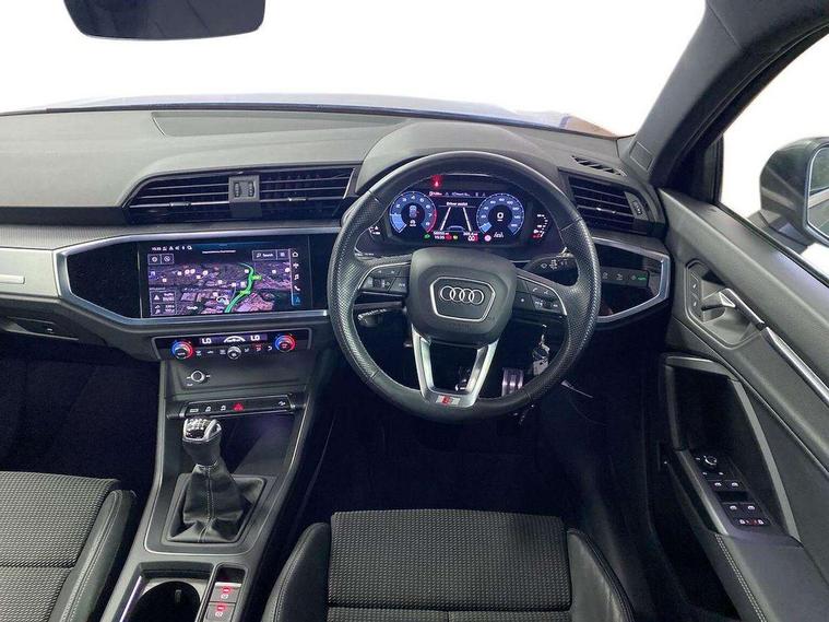 Amazon alexa Integration, Audi drive select, Audi lane departure warning, Audi Virtual Cockpit - 10.25" display, Bluetooth interface, Camera based traffic sign recognition, Cruise control + speed limiter, Legal emergency call, MMI Navigation Plus with high resolution 10.1 inch touchscreen colour display, Power operated tailgate, Progressive steering, Rear parking sensors, Service interval indicator, Smartphone interface includes wireless Apple carplay/Android Auto, Start stop system with recuperation, Voice control system with natural language interaction, Sports suspension, 2 USB-C ports with charge and data functions, 6 passive loudspeakers, DAB digital radio module, Acoustic windscreen, Aluminium roof rails, Aluminium window trim, Anthracite black radiator grille, Auto dimming frameless rear view mirror, Body colour front spoiler blade, Body coloured bumpers, Electrically folding, adjustable and heated door mirrors with integrated LED side indicators and kerb view function for passenger side, Front and rear electric windows, Front fog lights, Front side air inlets in matt platinum grey, Grille vertical bars in aluminium silver/Matt, High gloss black finish B and C pillars, LED Dynamic rear indicators, LED headlights with LED daytime running lights, LED rear lights, LED third brake light, Privacy glass dark tinted rear and rear-side windows (from B-pillar backwards), Rain and light sensors, Rear diffuser grille in grained matt black, Rear diffuser strip in matt anthracite black, Rear side wing doors, Rear wiper, S line badges on front wings, S Line front and rear bumpers, Side skirt insert in matt Platinium grey, Variable front intermittent wipers, 12V socket in rear centre console, 3 seat bench in 2nd row, 3 spoke leather multifunction steering wheel features S badging and grips in perforated leather with contrast stitching, 40:20:40 folding with manual adjustment for 60:40 forwards/backwards position and backrest angle, Adjustable rear seat bench/backrest with centre armrest and cupholder, Black cloth headlining, Dual zone electronic climate control, Front and rear black floor mats with contrast stitching in rock grey, Front and rear headrests, Front and rear roof module including reading lights, Front centre armrest, Glove compartment lighting, Height and reach adjustable steering wheel, Illuminated door sill trims with S logo, ISOFIX child seat mounting for front passenger with airbag deactivation and outer rear seat including top tether attachment point for outer rear seats, Luggage compartment light, Manual front seats with height adjustment, Perforated leather gearknob, Single front passenger seat, Stainless steel luggage compartment sill finisher, Stainless steel pedals, Ambient lighting pack - Q3, Non smoking pack - Q3, 3x3 point rear seatbelts, 6 airbags - Driver, front passenger, curtain and side windows, Audi pre-sense front with pedestrain and cyclist recognition, Electrically operated child locks on rear doors, Electromechanical parking brake, Electronic stabilisation control including ABS, ASR and EDL, Front seatbelt reminder, Hill descent control, Hill hold assist, Pre sense basic, Seatbelt monitoring, Tyre pressure warning, Warning triangle and first aid kit, Anti theft alarm, Anti theft wheel bolts, Immobiliser, Remote central locking, Aluminium look interior elements, Dark matt brushed aluminium inlay, Detail dashboard around MMI touch colour display in glass look, black with surround in aluminium look, Leatherette door armrest,