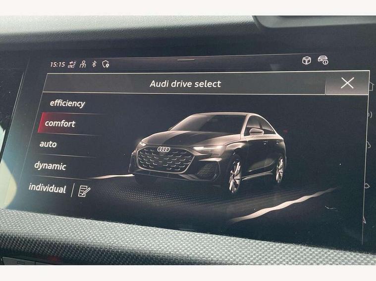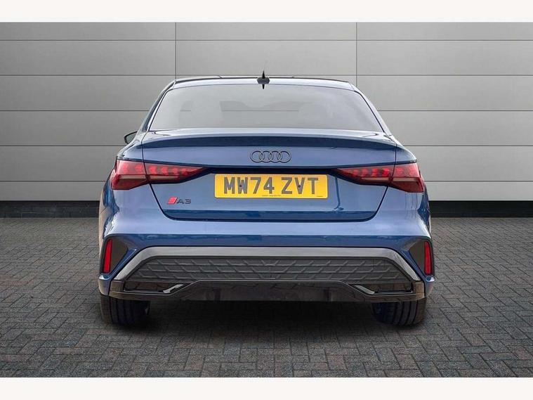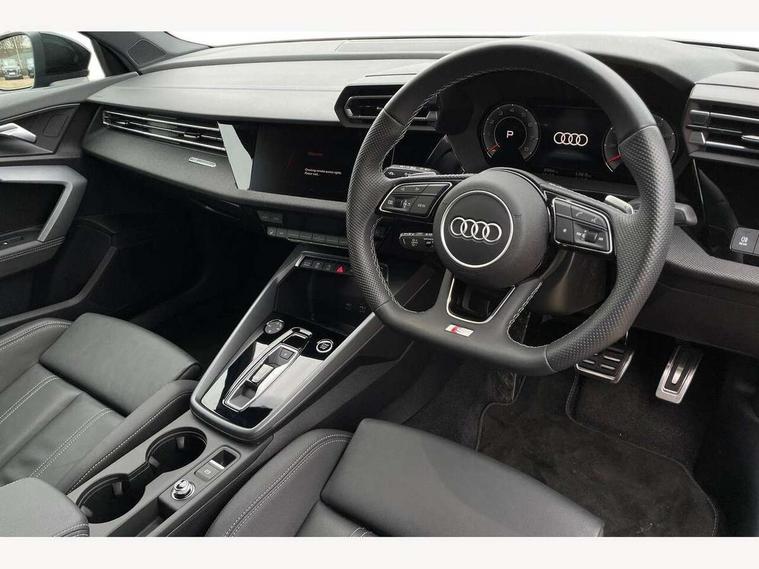 Adjustable speed limiter, Audi drive select, Audi smartphone interface with app store includes wireless Apple carplay, Android auto and Amazon alexa integration, Audi virtual cockpit plus - 12.3" full HD resolution dynamic digital instrument cluster, Automatic start/stop system with recuperation, Bluetooth interface, Camera based traffic sign recognition, Collision avoidance assistant, Cruise control, Distraction and Fatigue warning, e-Call (emergency call), Electromechanical power speed sensitive steering, Lane departure warning system, MMI Navigation Plus with high resolution 10.1" colour touch screen display, Park Assist with parking system Plus, Service indicator, Trip computer, Voice control system with natural language interaction, Sports suspension, Audi Phonebox light with wireless charging, Audi sound system - 10 loudspeakers including centre loudspeaker and subwoofer, DAB Digital radio, USB ports with charging function in the rear, Acoustic glass windscreen, Anthracite grey Audi rings (front and rear), Audi beam uses LEDs to project the Audi logo onto the ground as you exit your A3, Auto dimming frameless rear view mirror, Black accents front and rear bumpers, Black accents in the area of the Audi single frame grille, Black accents window trims strips, Electrically adjustable/heated/folding/auto dimming door mirrors with integrated LED indications + kerb view function for passenger side, Exterior model badging, Front electric windows, Heat insulating glass windscreen, Illuminated door sills with aluminium inserts at the front with S logo, LED 3rd brake light, LED daytime running lights, LED headlights with LED rear lights and dynamic rear indicators, Light and rain sensors, Privacy glass - dark tinted rear window, rear door and side windows, Rear boot, Rear electric windows, Rear side wing doors, 12V socket and storage compartment in front centre console, 3 seat bench in 2nd row, 3 spoke flat bottomed leather multifunction sport steering wheel with gear shift paddles, 3-zone deluxe automatic air conditioning, 4 way electrically adjustable lumbar support for driver and front passenger, 40/20/40 split folding rear seat bench, Black cloth headlining, Front and rear centre armrest in artificial leather, Front and rear centre armrest in artificial leather with contrasting stitching on armrests and instrument panel, Front and rear headrests, Front/rear floor mats, Heated front seats, Height and reach adjustable steering wheel, Manual boot compartment lid, Manually adjustable front seats, Rear cup holders, S badging on the steering wheel, Seat side bolsters, Single front passenger seat, Stainless steel pedals and front footrest in black, Twin leather upholstery with front sports seats S embossed logo, Aluminium interior elements pack - A3, Multi-coloured LED interior lighting package - A3 Black Edition, 3x3 point rear seat belts, Driver and front passenger airbag with passenger airbag deactivation, Electronic Stabilisation Control (ESC) including ABS, ASR and EDL, First aid kit with warning triangle and 2 safety vests, Front side airbags with head airbags and interaction airbag, Hill hold assist, Pre-sense front with pedestrian and cyclist detection, Seatbelt monitoring, Tyre pressure loss indicator, Anti theft alarm, Anti-theft wheel bolts, Electronically operated child locks, Immobiliser, Remote central locking with safelock, Inlays in black Impressum woven textile,