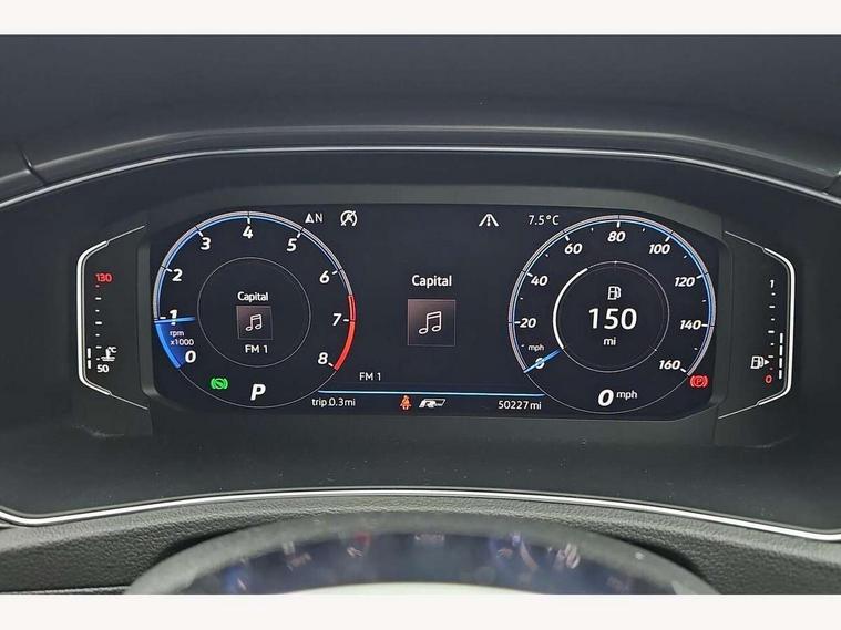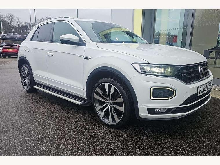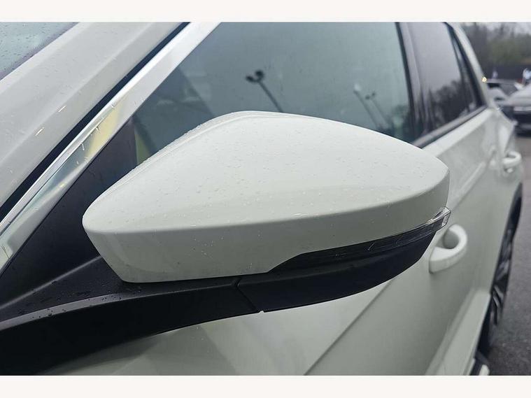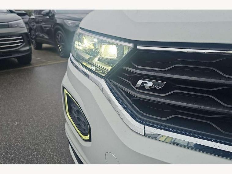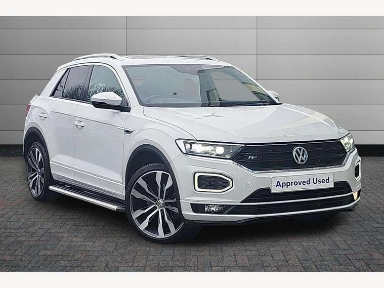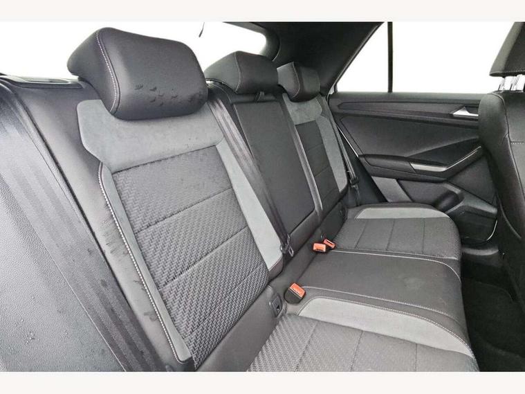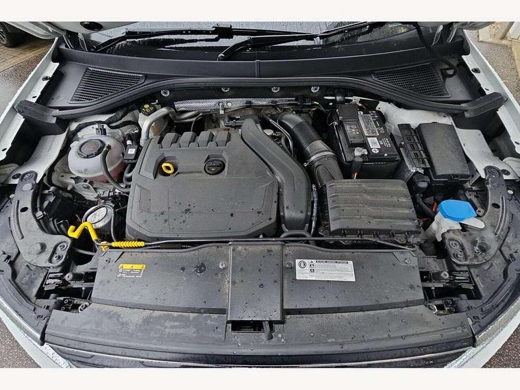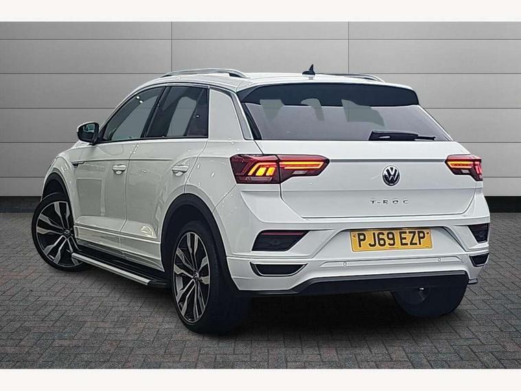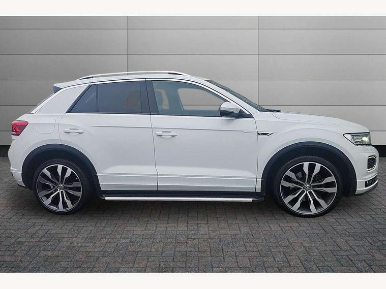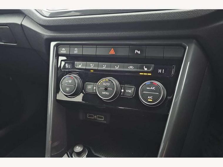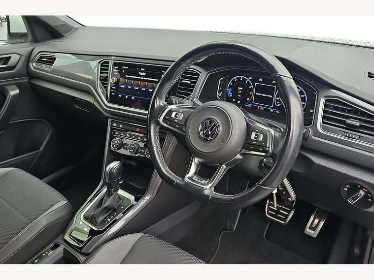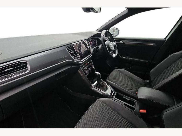 2 USB connection charging sockets, Active Info Display, 10.3" high resolution TFT dash display screen with customised information, Adaptive cruise control, App-Connect, Automatic start/stop system, Bluetooth telephone and audio connection for compatible devices, Car information display, Car-Net Security and Service, Discover navigation, 8" touch screen navigation/infotainment system with Car-Net, European map, CD/radio, 2D/3D map and speed limiter, Driver alert system with audible and visual fatigue detection system, Driver profile selection, Front assist, radar sensor controlled distance monitor, city emergency braking + predictive pedestrian protection, Lane assist, Multifunction computer with visual gear change recommendation for fuel consumption, Progressive power assisted steering, Service interval indicator, Think blue trainer driver tips and journey analysis, Voice activation, Warning sound and light for doors and tailgate open, Warning sound and light for front seatbelts unfastened, Battery regeneration during braking, Bluetooth - Simultaneous pairing of 2 compatible mobile devices, DAB Digital radio, Dynamic navigation based on TMC+, Multi device interface (MDI) with USB connection, Music playback - MP3, WMA and AAC files, Premium USB cable in choice of either Apple or Android smartphone compatibility, SD card slot, SMS functionality - read, compose and send SMS messages using touch-screen display, Three route options - Fast, Short, Eco, Title and cover art display, Auto dimming interior rear view mirror, Automatic hazard lights activation under emergency braking, Black grained lower door protectors, Black grained wheel arches, Body colour door handles, Body colour rear roof spoiler, Chrome effect left and right trapezoid exhaust tailpipe fascia surround, Chrome trim on upper and lower radiator grille, Door mirror integrated indicators, Dusk sensor, Electrically foldable, adjustable and heated door mirrors with puddle lights and reverse activated kerb-view adjustment on passenger's door mirror, Front and rear electric windows, Front fog lights with static cornering function, Front windscreen wiper with intermittent wipe and 4 position delay, Fully galvanised body, Heated rear window, High level 3rd brake light, LED darkened rear light clusters, LED rear number plate lights, Manual coming/automatic leaving home lighting function, Rain sensor, Rear tinted glass from B-pillar backwards approx 65% tinted, Rear windscreen washer and wiper with interval delay, 12V socket in centre console storage area, 2 LED front and rear reading lights, 3 rear head restraints, 4 load lashing points in luggage compartment, Aluminium pedals, Ambient lighting in front footwell and light strips below trim in front doors, Black decorative sleeve on gear handles, Black roof lining and sun visors, Carbon flag cloth upholstery, Climate control - 2 zone electronic air conditioning with automatic air recirculation and allergy filter, Drawer under drivers seat, Front + rear carpet mats, Front centre armrest with storage compartment, longitudinal and height adjustable and two rear air vents, Front cupholders x 2, Front footwell illumination, Front seat back storage pockets, Front sport seats, Glovebox, Height adjustable front seats, Height/reach adjust steering wheel, Illuminated vanity mirrors, Instrument lighting, white adjustable panel illumination, Interior light delay, Isofix easy fit child seat preparation for 2 outer rear seats, Load through provision with single cup holder when folded down, Luggage compartment cover, removable, Luggage compartment lighting, R Line badge, Split folding rear seat backrests with centre armrest, Storage compartment in left and right luggage area, Storage compartment in rear doors, Storage compartments in driver and front passenger doors, Three spoke multi function leather trimmed steering wheel and gear knob including paddle shift, Unique R Line door sill protectors, R line styling pack - T-Roc, Winter pack - T-Roc, 3 rear three point seatbelts, ABS, Driver and front passenger safety-optimised head restraints, Electronic parking brake with auto hold, ESC with EDL, ASR, EDTC and trailer stabilisation function, Front and rear curtain airbags, driver and front passenger airbags with passenger deactivation switch and front side impact airbags, Rigid safety cell with front and rear crumple zones, Three point height adjust front seatbelts + pretensioners, Tyre pressure loss indicator, Ventilated front and rear disc brakes, Volkswagen roadside assistance, Alarm with remote central locking and interior protection, Electronic engine immobiliser, Remote central locking with 2 remote folding keys, Shadow steel decorative inserts in dash and door panel, 19" Suzuka alloy wheels with low rolling resistance tyres and anti wheel bolts, Steel space saver spare wheel,