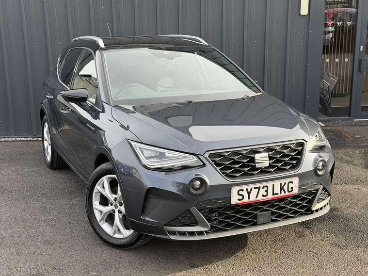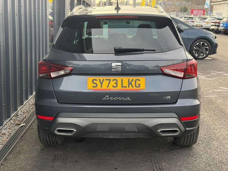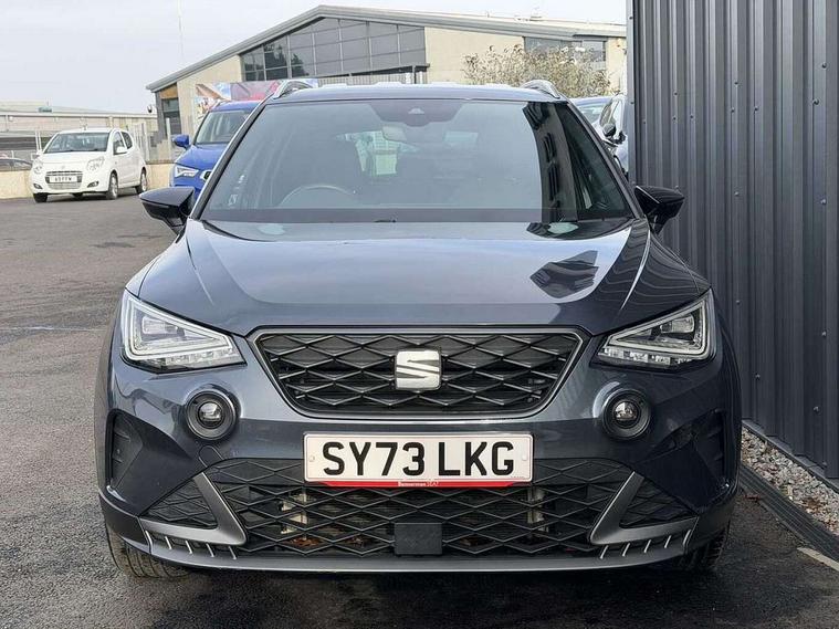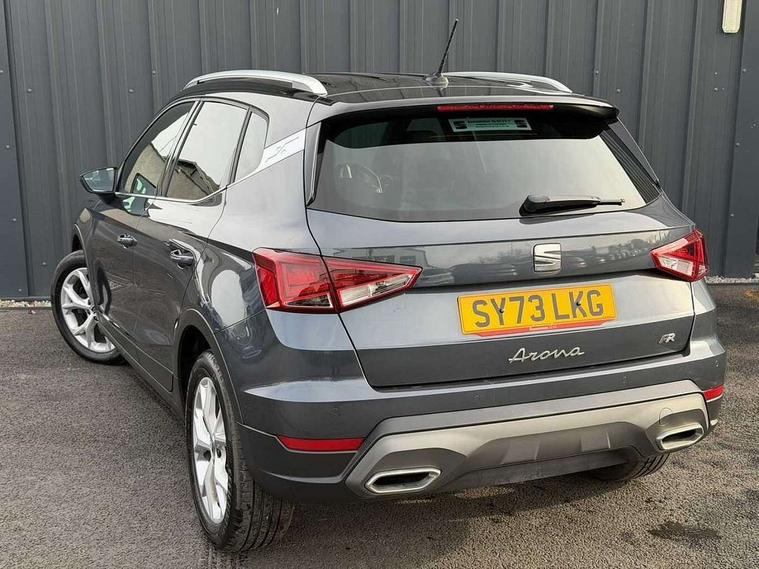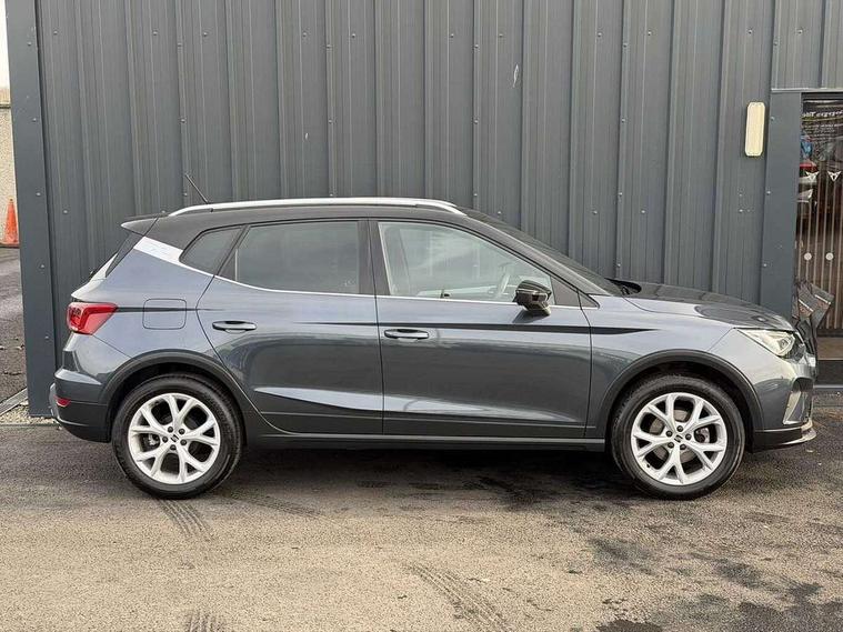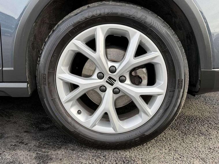 'Lights On' Reminder warning buzzer, 8" Digital cockpit, Digital clock, E-call, Electric speed sensitive power steering, Full Link Smartphone Integration with Mirror Link, Apple Car Play, Google Android Auto with USB Type C cable for Apple and Android compatibility, Lane keeping system, Low fuel warning light, Outside temperature display, Rear parking sensor, RPM counter, Seat connect with safety, service, remote and online, SEAT Drive profile - Four different models normal-sport-eco-individual, steering response, throttle response, Trip computer, Wireless phone charger, 9.2" colour touchscreen with navigation system, voice control and USB port (type c), Bluetooth interface for hands free and audio streaming, DAB digital radio and AM/FM radio, Steering wheel mounted audio controls, Anti theft roof antenna, Auto dimming interior rear view mirror, Automatic activation of hazard warning lights, Body coloured bumpers, Body coloured door handle inserts, Chrome roof rails and window surrounds, Dark tinted rear windows, Electric front/rear windows, Electrically adjustable, heated and folding door mirrors, Front fog lights with cornering function and rear fog light, FULL LED automatic headlights with dynamic headlight range control, coming and leaving home, LED daytime running lights, LED rear tail lights and licence plate lights, Protective side mouldings, Rain sensing wipers, Rear side wing doors, Rear spoiler, Rear window wash/wipe, Roof colour door mirrors, Third brake light, Twin exhaust pipe styling hidden exhaust pipe, Visible VIN plate, Windshield wiper with intermittent control and potentiometer, 2 cupholders, 3 seat bench in 2nd row, 60/40 split folding rear seat, Aircare filter, Black interior roof, Cloth upholstery, Double boot floor, Driver sunvisor with covered mirror + card holder, Dual zone climate control, Front courtesy light with front reading lights, Front sport seats, Gear shift indicator, Height adjustable front seats, Height/reach adjustable steering column, Illuminated boot, Instrument lighting with brightness control, Interior ambient lighting, Interior light in footwell, central console and door panel, ISOFIX points in outer rear seats with top tether anchorage points, Passenger sunvisor with vanity mirror, Perforated flat bottomed leather steering wheel/gear knob/handbrake with red stitching and FR logo, Single front passenger seat, Two front and three rear height adjustable headrests, Interior chrome pack - Arona, 3 point seatbelts on all rear seats, ABS, Active front headrests, Child locks on rear doors, Driver and front passenger airbags with front passenger airbag de activation, front side and curtain airbags, Electronic stability control, Emergency Brake Assist (EBA) and front assist, Front and rear seatbelt reminder, Hill hold control, Multi-Collision braking, Tiredness recognition system, Traction control, Tyre pressure monitoring system, Alarm with back-up horn, Electronic engine immobiliser, Locking wheel bolts, Remote central locking + deadlocks, Tow away protection, Titan black dashboard, 17" Dynamic alloy wheels,