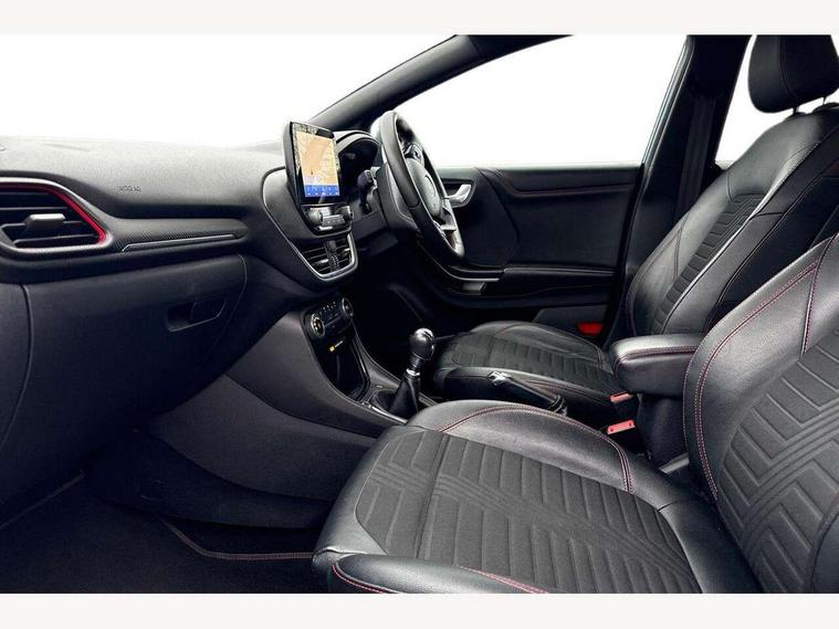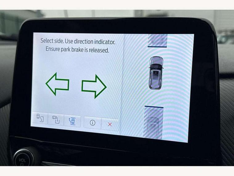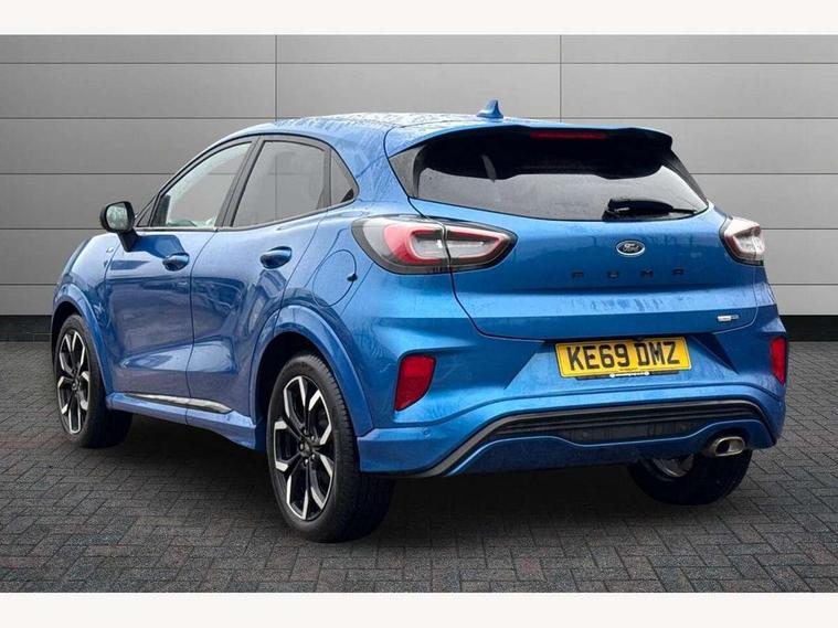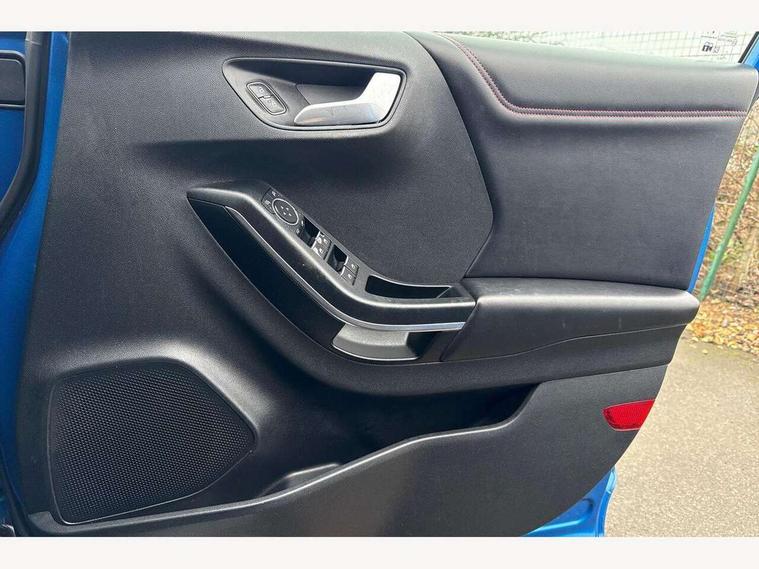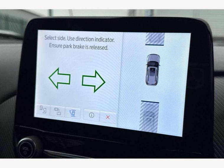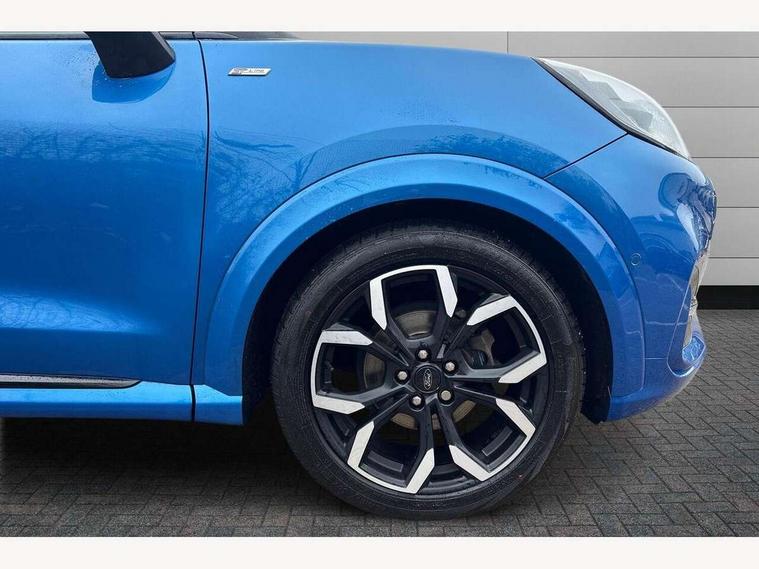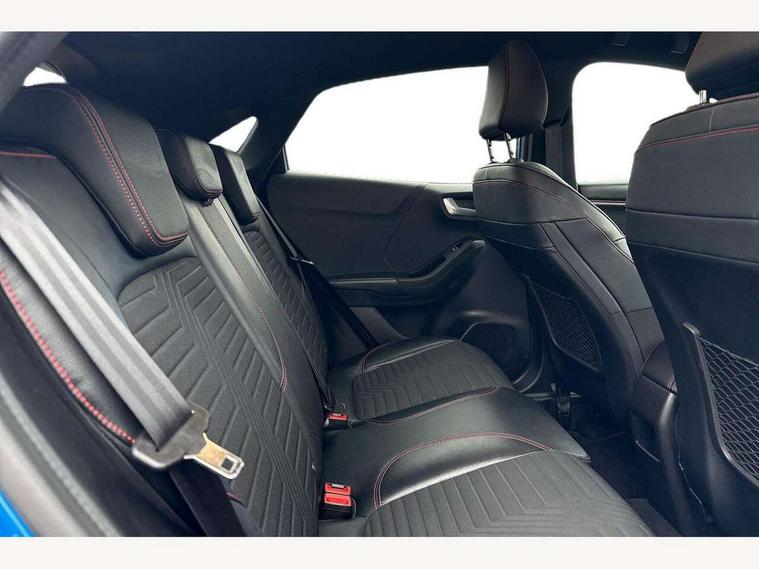 Ford easy fuel, Full digital 12.3" instrument cluster, Lane keeping aid with lane departure warning, Power liftgate hands free including keyless start + entry, motion sensing key fob, Rear parking sensor, Selectable drive modes(Normal, Eco, Sport, Slippery and Trail), Wireless charging pad, Automatic headlights with rain sensing wipers and auto high beam, Fixed LED headlamps, Front fog lights with cornering lights and LED rear lamps, Power foldable heated door mirrors with puddle lamps, Privacy glass to side rear windows and tailgate glass, Quickclear heated windscreen, ST-Line body kit with large rear spoiler wth sports suspension, Alloy sports pedals, Casual partial leather upholstery with salerno bolster, Centre console with armrest and stowage, Driver and passenger seat lumbar and height adjust, EATC - Electronic Auto Temperature control, Ford megabox extended bootspace, Front and rear floor mats, ST-Line flat bottomed leather steering wheel with leather handbrake and aluminium gear knob, B&O Premium Audio system + Ford SYNC 3 navigation pack - Puma, Driver assistance pack - Puma, 3 rear seatbelts, Electronic stability control (ESC) and hill start assist, Pre-collision assist with autonomous emergency braking, pedestrian/cyclist detection & post-collision braking, Tyre pressure monitoring system (TPMS), Thatcham alarm, Carbon look interior deco spears, 18" 5 spoke matt black machined finish alloy wheels, Tyre inflation kit,