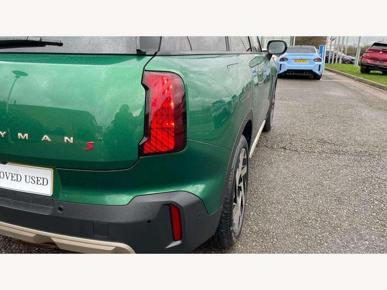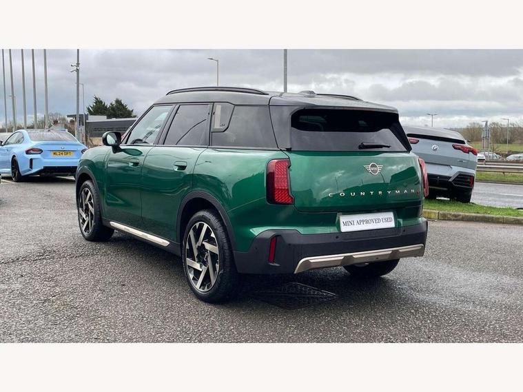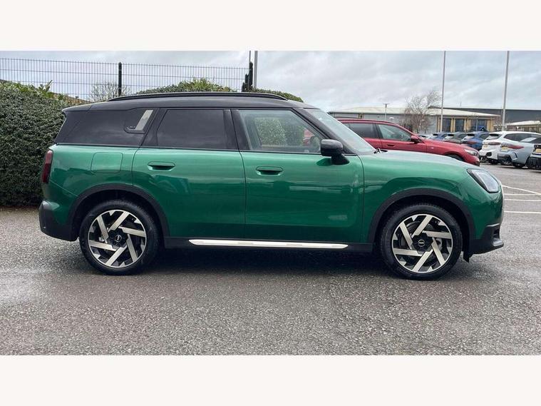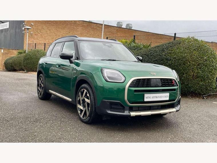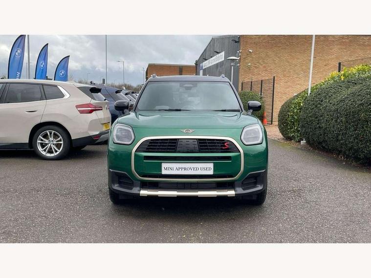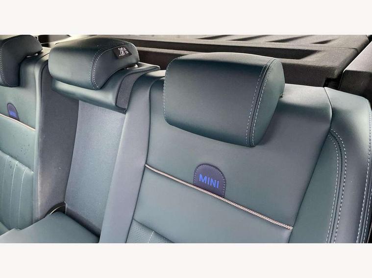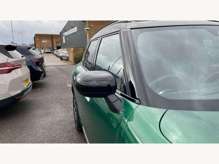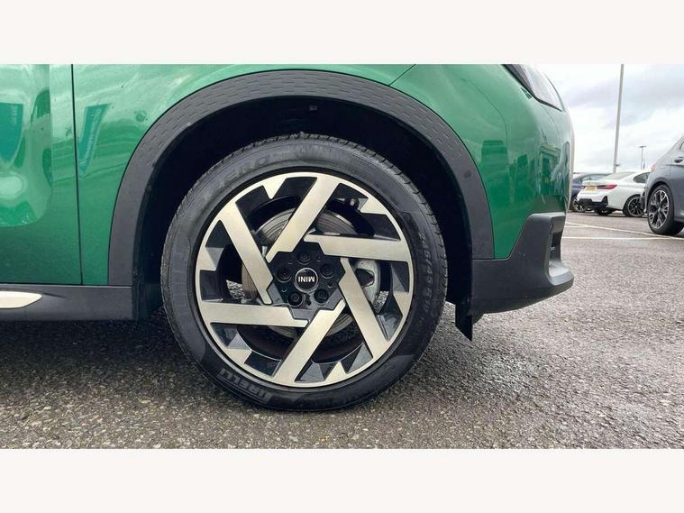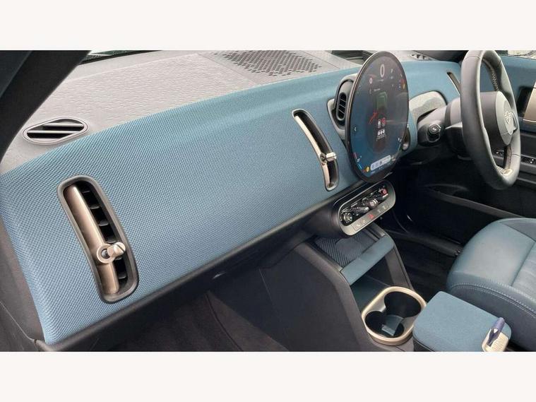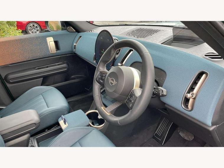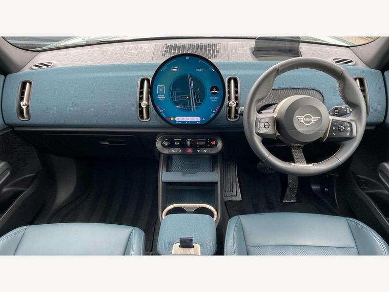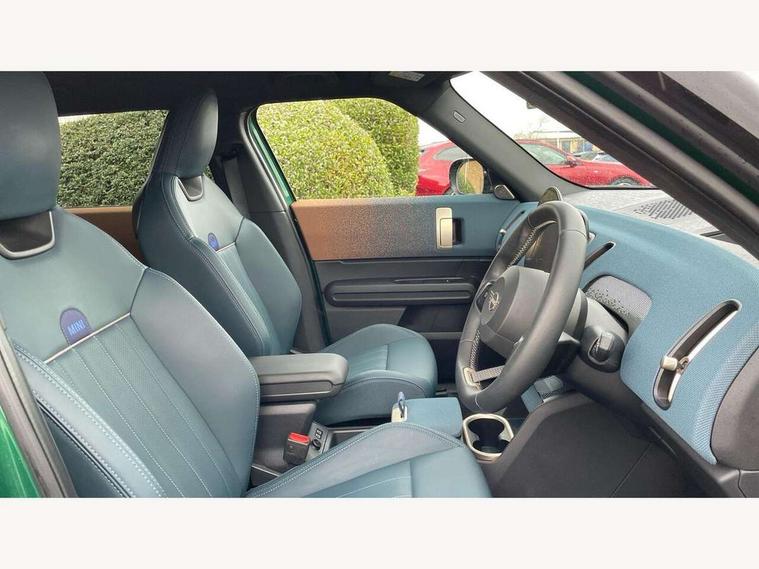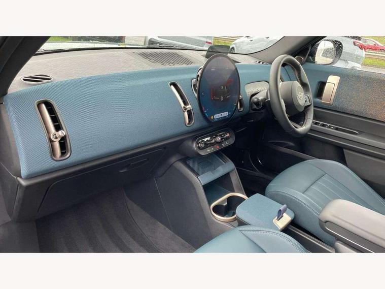 Bluetooth connection, Circular OLED Screen, Compatible mobile phone bluetooth with audio streaming, Cruise Control (DCC), Digital dashboard display, Driving Assistant Plus Preparation, E-call, Electro-mechanical speed dependant steering assistance, MINI Experience Modes, MINI Head up display, Mini navigation system, MINI TeleServices, Parking assistant in camera and ultrasound based assistance system, rear view camera, parking aid and distance control, Auto transmission with Paddles, Larger capacity fuel tank, 6 speakers, DAB Digital radio, Personal eSim, Auto tailgate, Electric adjustable heated door mirrors, Front and rear electric windows, Heated rear window, High beam assistant, Interior rear-view mirror with automatic anti-dazzle function, LED daytime running lights, LED headlights with extended contents including Adaptable light signatures, LED rear lights, LED third brake light, Logos in Vibrant Silver, Rain sensor with auto headlights, Rear side wing doors, Rear window wiper, Roof rails, Vibrant silver grille surround, 3 Seat sliding rear bench in 2nd row, 60/40 split rear bench seat, Anthracite headliner, Auto air conditioning, Driver and front passenger seat heating, Floor mats, Front armrest, Front headrests, Front sport seats, Heated steering wheel, Height and length steering column adjustment, Lidded storage box in Petrol knit, Luggage compartment separating net, Rear headrests, Seat adjustment for rear seats, Single front passenger seat, Sport Vescin Steering Wheel, Sunvisors with vanity mirrors, Vescin synthetic leather upholstery, Vibrant Silver sill inlay, Wireless charging tray, Interior and exterior mirror package - Mini Countryman, 3x3 point rear seat belts, 6 Airbags - front, side, head and seat belt tensioners, ABS, DSC - Dynamic Stability Control, Electronic handbrake, Electronic Stability Programme (ESP), Front ISOFIX (iSize), Hill descent control, Hill hold assist, Hill start assist, Manual rear child locks, Traction control, Tyre pressure monitoring system, Warning triangle, Alarm system with tilt sensor, monitoring doors, bonnet interior and tailgate, Auto drive away locking, Comfort access system, Deadlocking function, Electronic vehicle immobiliser, Locking wheel bolts, Remote control locking, Start/stop toggle with keyless go, Petrol/Brown dashboard knit, MINI Mobility Kit,