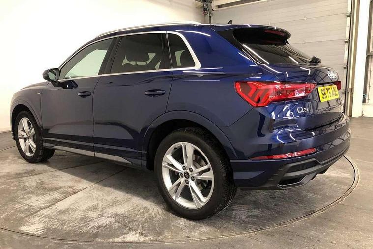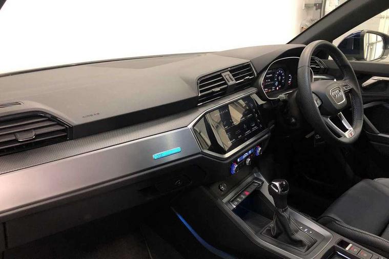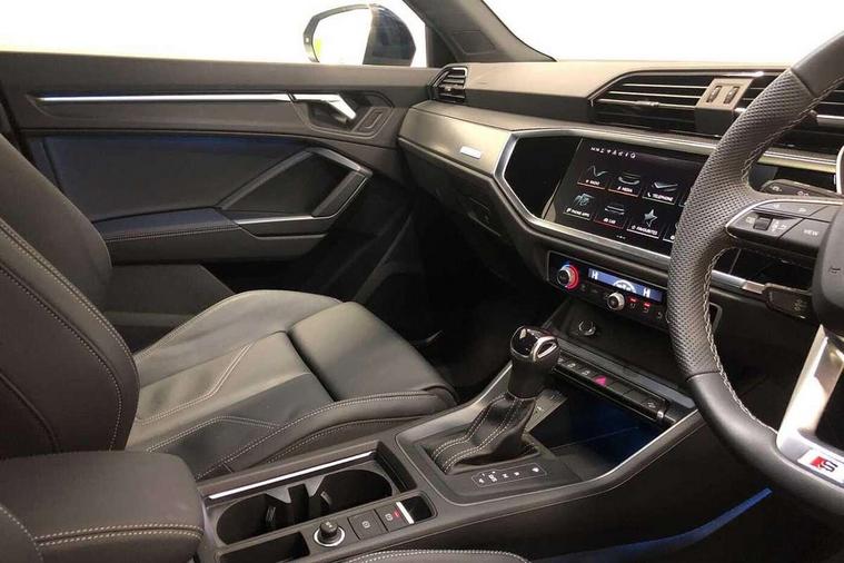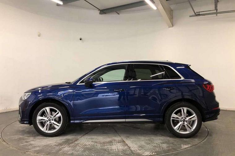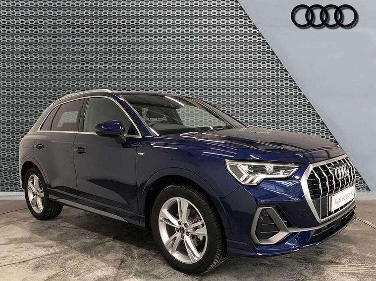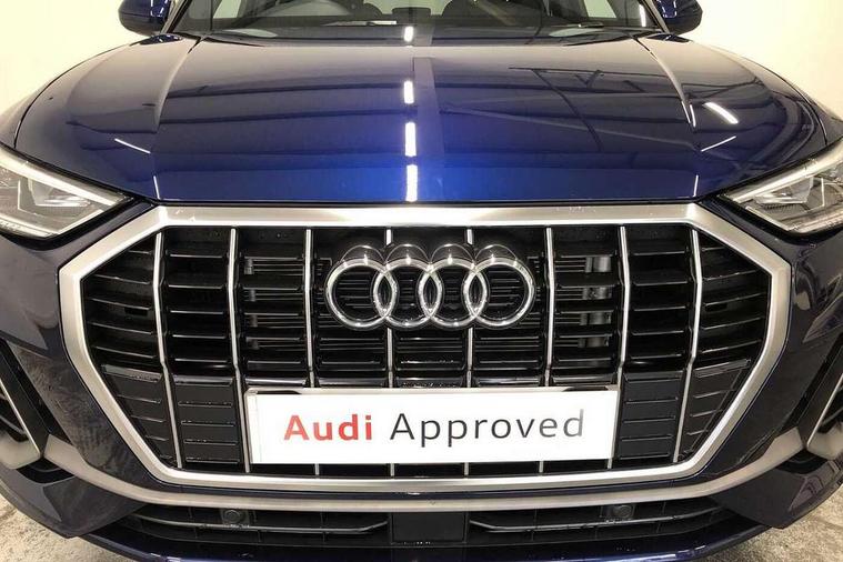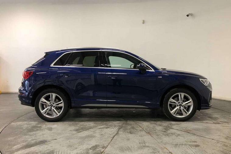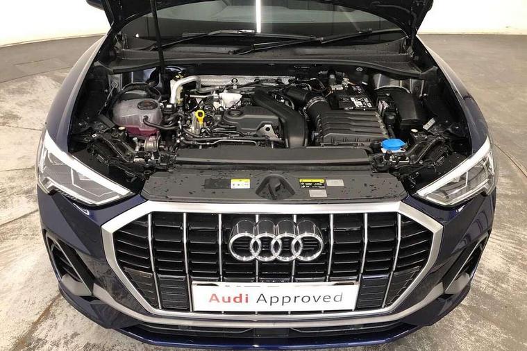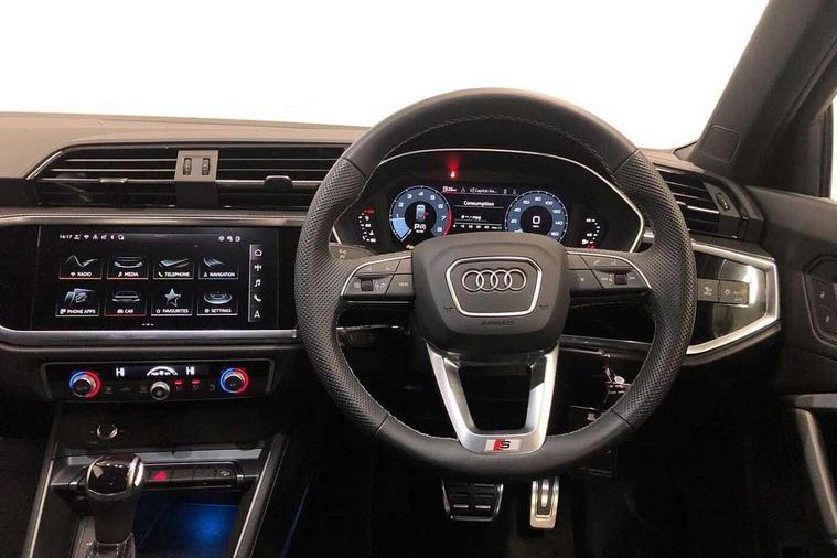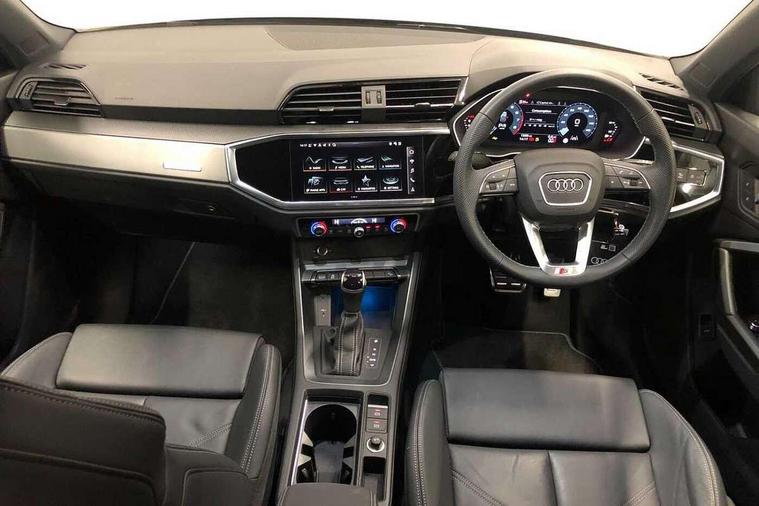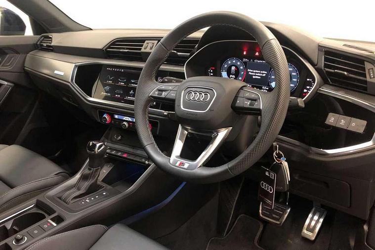 Amazon alexa Integration, Audi connect safety and service, Audi drive select, Audi lane departure warning, Audi Virtual Cockpit - 10.25" display, Bluetooth interface, Camera based traffic sign recognition, Distraction and Fatigue warning, Legal emergency call, MMI Navigation Plus with high resolution 10.1 inch touchscreen colour display, Power operated tailgate, Progressive steering, Service interval indicator, Smartphone interface includes wireless Apple carplay/Android Auto, Start stop system with recuperation, Voice control system with natural language interaction, Sports suspension, 2 USB-C ports with charge and data functions, 6 passive loudspeakers, DAB digital radio module, Acoustic windscreen, Aluminium roof rails, Aluminium window trim, Anthracite black radiator grille, Auto dimming door mirrors, Auto dimming frameless rear view mirror, Body colour front spoiler blade, Electrically folding, adjustable and heated door mirrors with integrated LED side indicators and kerb view function for passenger side, Front and rear electric windows, Front fog lights, Front side air inlets in matt platinum grey, Grille vertical bars in aluminium silver/Matt, High gloss black finish B and C pillars, LED Dynamic rear indicators, LED headlights with LED daytime running lights, LED rear lights, LED third brake light, Privacy glass dark tinted rear and rear-side windows (from B-pillar backwards), Rain and light sensors, Rear diffuser grille in grained matt black, Rear diffuser strip in matt anthracite black, Rear side wing doors, Rear wiper, S line badges on front wings, S Line front and rear bumpers and side skirts, Side skirt insert in matt Platinium grey, Variable front intermittent wipers, 12V socket in rear centre console, 3 seat bench in 2nd row, 3 spoke leather multifunction steering wheel features S badging and grips in perforated leather with contrast stitching, 40:20:40 folding with manual adjustment for 60:40 forwards/backwards position and backrest angle, Adjustable rear seat bench/backrest with centre armrest and cupholder, Black carpet mats, Black cloth headlining, Dual zone electronic climate control, Electric lumbar support, Front and rear black floor mats with contrast stitching in rock grey, Front and rear headrests, Front centre armrest, Height and reach adjustable steering wheel, Horizontal trim strip in matt platinum grey, Illuminated door sill trims with S logo, ISOFIX child seat mounting for front passenger with airbag deactivation and outer rear seat including top tether attachment point for outer rear seats, Luggage compartment sill protection in stainless steel, Manual front seats with height adjustment, Perforated leather gearknob, Single front passenger seat, Stainless steel pedals, Twin leather upholstery with front sport seats + S embossing, Non smoking pack - Q3, 3x3 point rear seatbelts, 6 airbags - Driver, front passenger, curtain and side windows, Audi pre-sense front with pedestrain and cyclist recognition, Electrically operated child locks on rear doors, Electromechanical parking brake, Electronic stabilisation control including ABS, ASR and EDL, Front seatbelt reminder, Hill descent control, Hill hold assist, Pre sense basic, Seatbelt monitoring, Tyre pressure warning, Warning triangle and first aid kit, Anti theft wheel bolts, Immobiliser, Remote central locking, Thatcham approved category 1 anti theft alarm, Aluminium look interior elements, Dark matt brushed aluminium inlay, Detail dashboard around MMI touch colour display in glass look, black with surround in aluminium look, Leatherette door armrest,