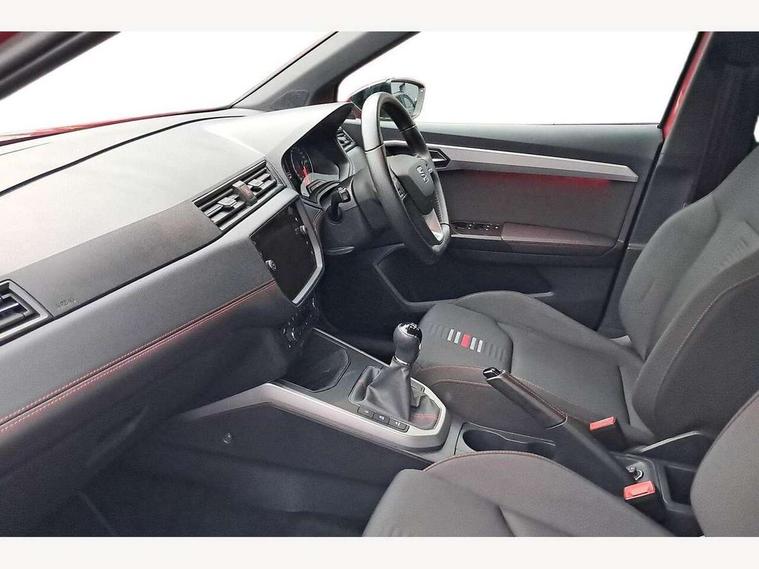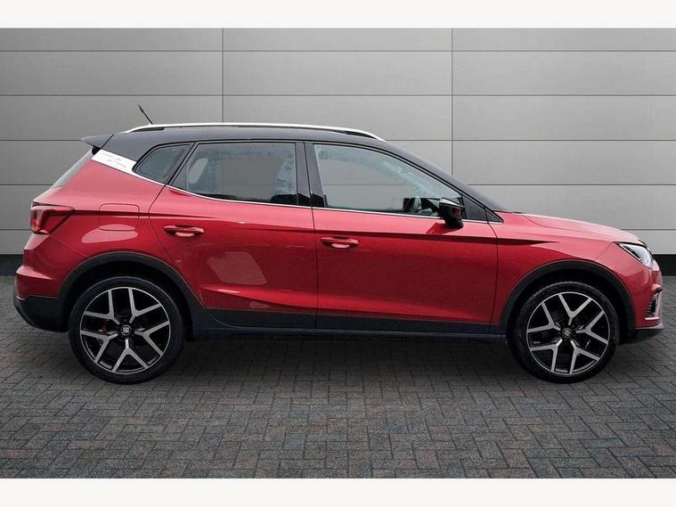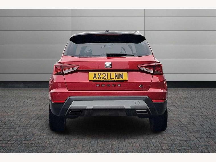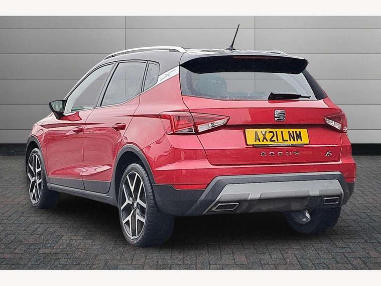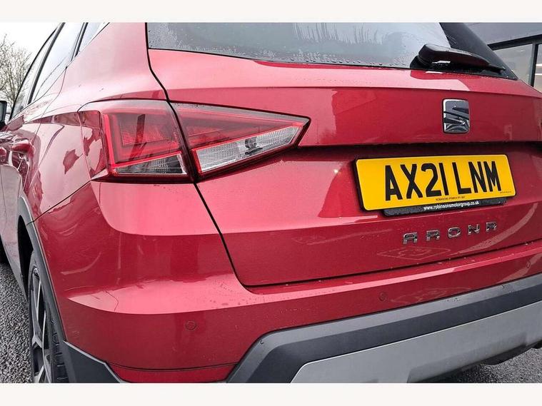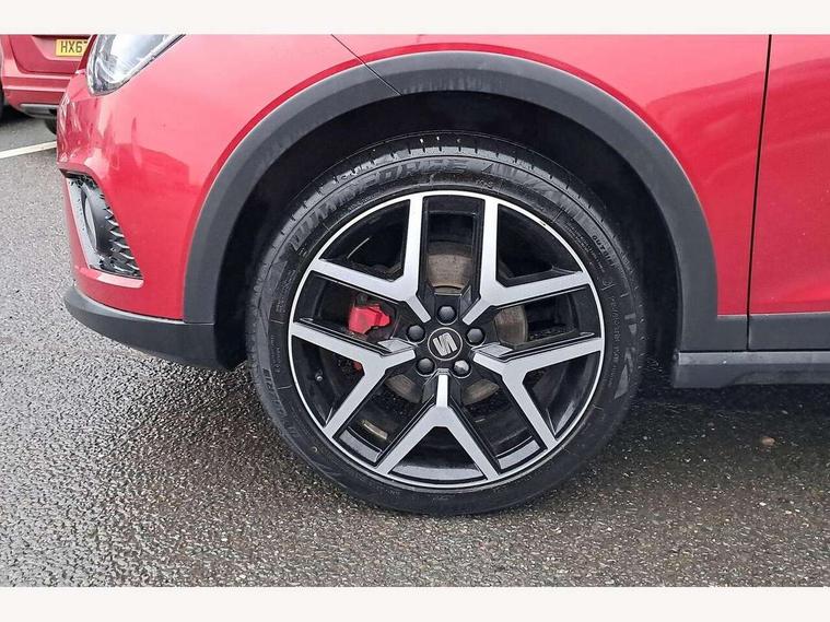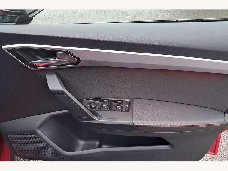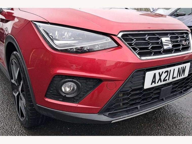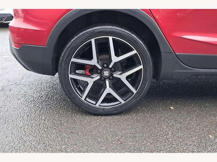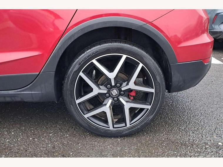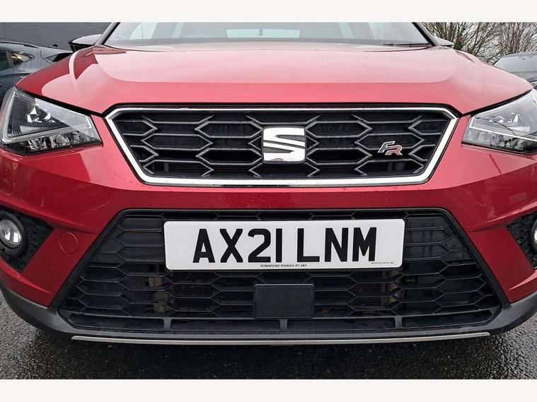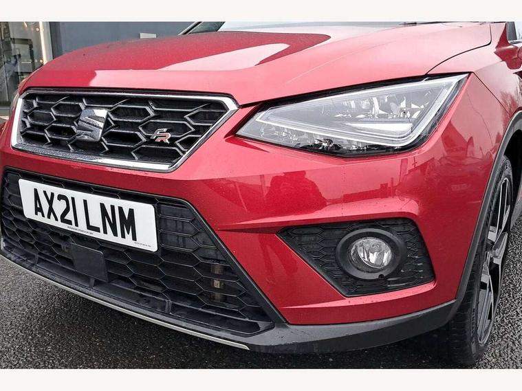 'Lights On' Reminder warning buzzer, Cruise control and speed limiter, Digital clock, Electric speed sensitive power steering, Full Link Smartphone Integration with Mirror Link, Apple Car Play, Google Android Auto with USB cable for Apple and Android compatibility, Low fuel warning light, Outside temperature display, Rear parking sensor, RPM counter, Seat connect with safety, service, remote and online, SEAT Drive profile with dynamic chassis control - Four different models normal-sport-eco-individual, steering response, throttle response, Trip computer, Sports suspension, 6 speakers, Bluetooth interface for hands free and audio streaming, DAB digital radio and AM/FM radio, Steering wheel mounted audio controls, Anti theft roof antenna, Auto dimming interior rear view mirror, Automatic activation of hazard warning lights, Automatic headlights, Body coloured bumpers, Body coloured door handle inserts, Chrome front grille frame, Chrome roof rails, Chrome window trim, Coming/leaving home lighting function, Dark tinted rear windows, Electric front/rear windows with one touch/auto up/down, Electrically adjustable, heated and folding door mirrors, Full LED headlights dipped and mainbeam + front and rear fog lights, LED daytime running lights, LED rear tail lights and licence plate lights, Protective side mouldings, Rain sensing wipers, Rear window wash/wipe, Roof colour door mirrors, Twin exhaust pipe styling hidden exhaust pipe, Visible VIN plate, Windshield wiper with intermittent control and potentiometer, 2 cupholders, 60/40 split folding rear seat, Aircare filter, Black interior roof, Double boot floor, Driver sunvisor with covered mirror + card holder, Dual zone climate control, Front courtesy light with front reading lights, Front sport seats, Gear shift indicator, Heated front seats, Height adjustable front seats, Height/reach adjustable steering column, Illuminated boot, Instrument lighting with brightness control, Interior light in footwell, central console and door panel, ISOFIX points in outer rear seats with top tether anchorage points, Multi-colour ambient interior lighting, Nora cloth upholstery, Passenger sunvisor with vanity mirror, Perforated flat bottomed leather steering wheel/gear knob/handbrake with red stitching and FR logo, Two front and three rear height adjustable headrests, Connectivity pack plus - Arona, Interior chrome pack - Arona, 3 point seatbelts on all rear seats, ABS, Active front headrests, Child locks on rear doors, Driver and front passenger airbags with front passenger airbag de activation, front side and curtain airbags, Electronic stability control, Emergency Brake Assist (EBA) and front assist, Front and rear seatbelt reminder, Hill hold control, Multi-Collision braking, Red brake calipers, Seatbelts with red stripe, Tiredness recognition system, Traction control, Tyre pressure monitoring system, 2 folding remote keys with window open/close function, Alarm with back-up horn, Electronic engine immobiliser, Locking wheel bolts, Remote central locking + deadlocks, Tow away protection, Interior chrome line trim, Leatherette dashboard, 18" Performance alloy wheels,