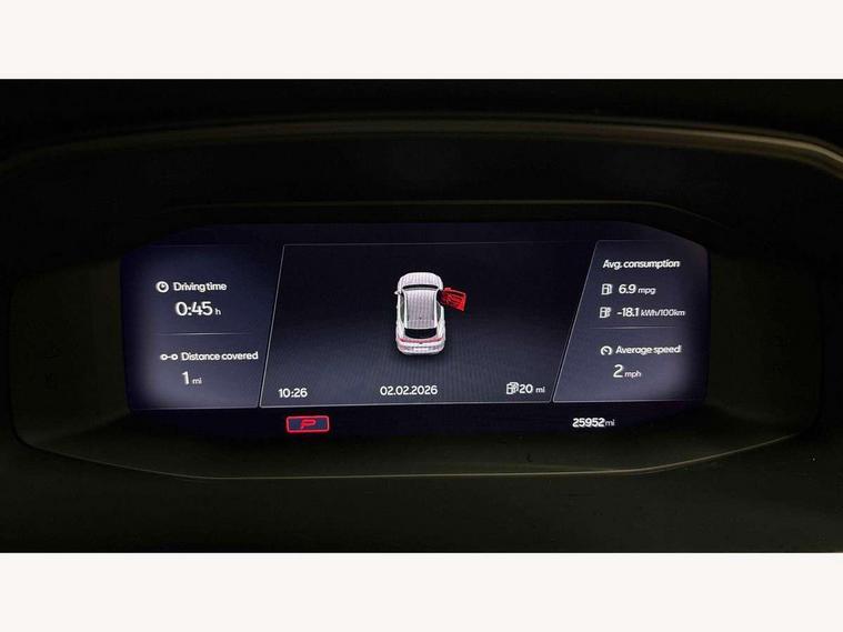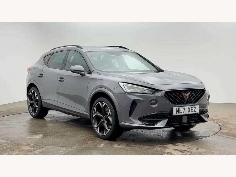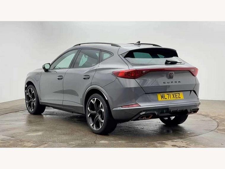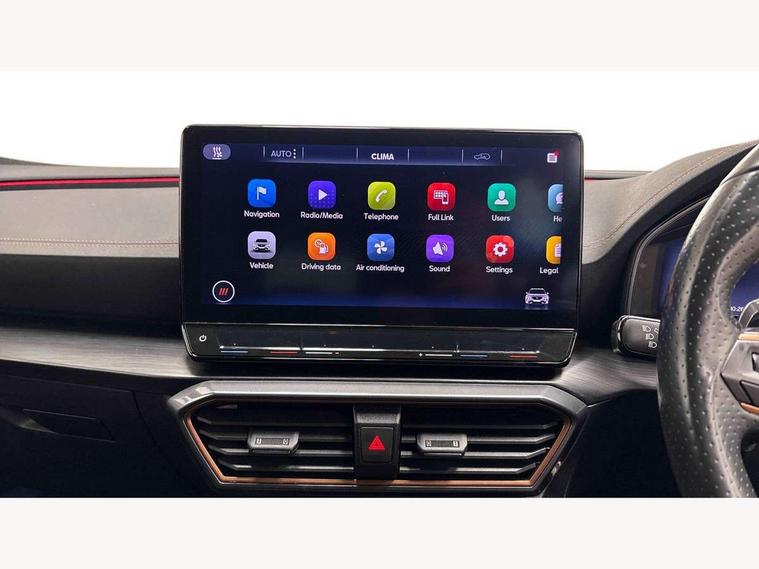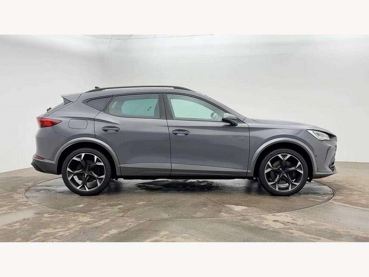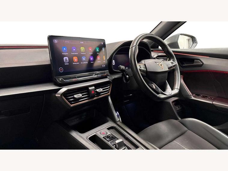 Digital cockpit and configurable dashboard, Driver alert system, Dynamic chassis control with driving profile selection (Comfort, Sport, CUPRA, Individual), Forward collision warning with automatic braking, Lane assist, Park assist (inc front/rear parking sensors), Predictive adaptive cruise control with speed limiter, Rear view camera, RPM, trip computer, outside temp gauge, instrument light brightness, low fuel warning light, lights on reminder, gearshift indicator, Service interval indicator, Speed sensitive power steering, Start/stop system with regenerative braking, Virtual pedal and electric tailgate, Wireless apple carplay, Wireless phone charger, 10 amp mode 2 charging cable, 16 amp mode 3 charging cable, 3.6 kw On-board charger, Electronic locking differential and dynamic traction support, Sports suspension with front shock absoption, 2 front and 2 rear USB type C sockets, 6 speakers, Auxiliary input socket, DAB radio, Auto dimming rear view mirror, Body colour door handles, Body coloured bumpers, Dark grey wing mirror, Daytime running light with automatic headlight control and coming home feature, Dynamic headlight range control, Electric front/rear windows, Electrically adjustable, heated and folding door mirrors, Front fog lamps with cornering function, Gloss black roof rails and window surrounds, LED Headlights, LED Taillights with dynamic indicator, Rain sensing wipers, Rear diffuser with single exhaust pipe on each side with simulated exhaust pipes, Rear wash/wipe, Sports bumpers, Tinted rear windows, Welcome lights, 12v power supply in centre console, 12V socket, 12v socket in loadspace, 2 front and 2 rear reading lights, 230V socket, 60/40 split rear bench seat with armrest and mechanical seat release, Black headlining, Cupra sports pedals, Dust/pollen filter, Front and rear head restraints, Front centre armrest, Height/reach adjust steering wheel, Illuminated interior front door sills, Illuminated sunvisor with mirror, Isofix, Leather multi function heated steering wheel with gear shift paddles, Luggage tie-down hooks, Manually adjustable height and lumbar support for front seats, PVC/Cloth upholstery with copper stitching + bucket seats, Three zone climate control with control panel in rear, Wraparound lighting, Navigation system pack - Formentor, 3 point seatbelts on all rear seats, ABS, Brake control system - ESC and brake booster, Child proof door locks, Driver and front passenger airbags with front passenger airbag de-activation, Electronic parking brake, Front and rear disc brakes, Front side curtain airbags, Hill hold control, Seat belt reminder for front and rear seats, Tyre pressure monitoring system, Anti theft alarm system, Keyless entry and start system (KESSY), Locking wheel bolts, Copper and aluminium interior detailing, 19" 'Exclusive' machined sport matte black and silver alloy wheels, Tyre repair kit,