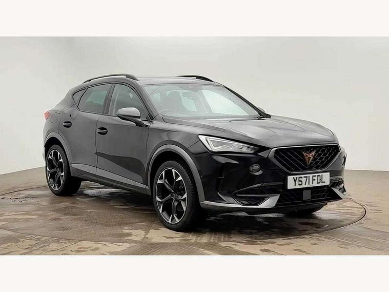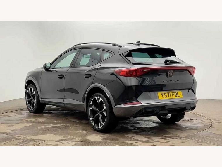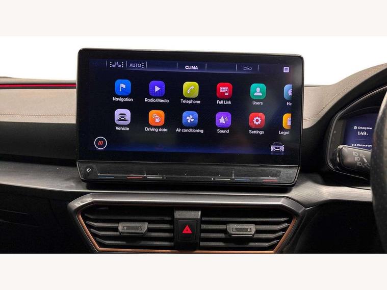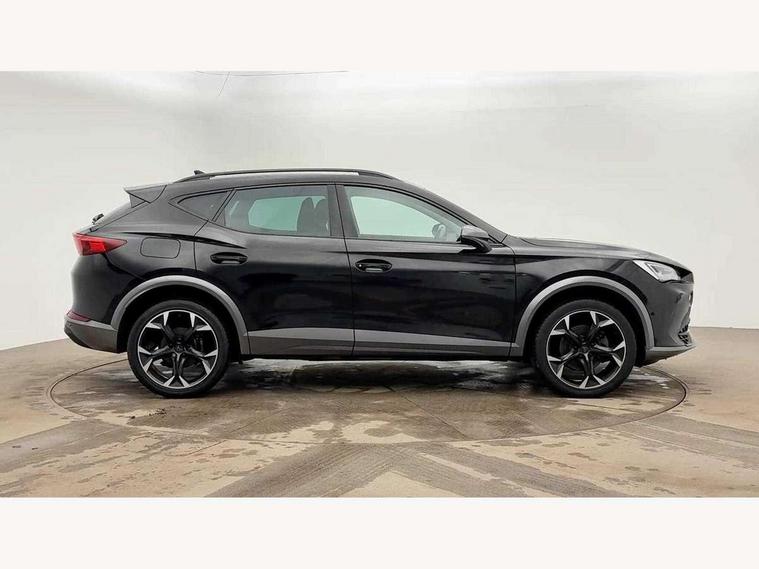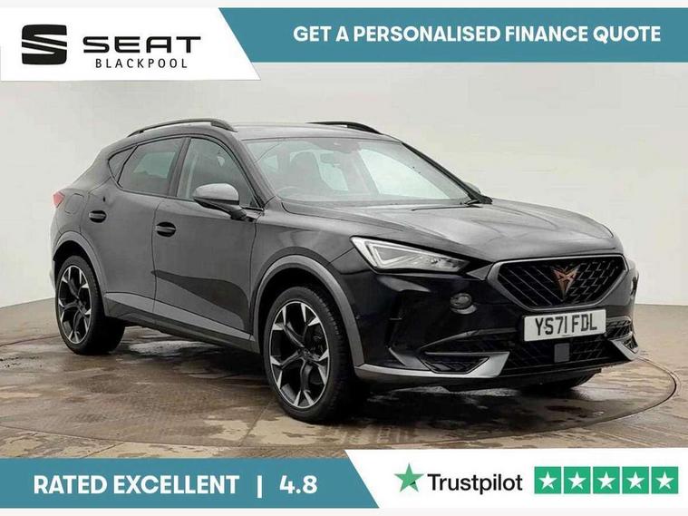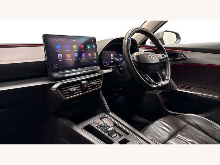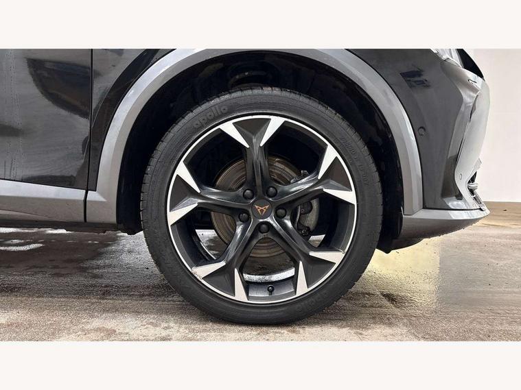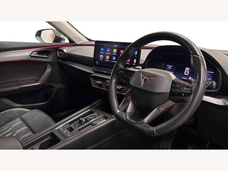 Digital cockpit and configurable dashboard, Driver alert system, Driving profile selection, E-call, Forward collision warning with automatic braking, Lane assist, Park assist (inc front/rear parking sensors), PAS, Predictive adaptive cruise control with speed limiter, Rear view camera, RPM, trip computer, outside temp gauge, instrument light brightness, low fuel warning light, lights on reminder, gearshift indicator, Service interval indicator, Start/stop system with regenerative braking, Wireless apple carplay, Wireless phone charger, Electronic locking differential and dynamic traction support, Standard suspension, 2 front and 2 rear USB type C sockets, Auxiliary input socket, DAB radio, Auto dimming rear view mirror, Body colour door handles, Body coloured bumpers, Dark grey wing mirror, Daytime running light with automatic headlight control and coming home feature, Dynamic headlight range control, Electric front/rear windows, Electrically adjustable heated and folding door mirrors with memory function, Front fog lamps with cornering function, Gloss black roof rails and window surrounds, LED Headlights, LED Taillights with dynamic indicator, Rain sensing wipers, Rear diffuser with black simulated exhaust pipes, Rear side wing doors, Rear wash/wipe, Third brake light, Tinted rear windows, Welcome lights, 12v power supply in centre console, 12V socket, 12v socket in loadspace, 2 front and 2 rear reading lights, 230V socket, 3 seat bench in 2nd row, 60/40 split rear bench seat with armrest and mechanical seat release, Dust/pollen filter, Front and rear head restraints, Front centre armrest, Height/reach adjust steering wheel, Illuminated interior front door sills, Illuminated sunvisor with mirror, Isofix, Leather multi function heated steering wheel with gear shift paddles, Luggage tie-down hooks, Single front passenger seat, Three zone climate control with control panel in rear, Variable luggage/load compartment floor, Wraparound lighting, Genuine Nappa leather Pack - Cupra, Navigation system pack with 10" navigation system - Formentor, 3 point seatbelts on all rear seats, ABS, Brake control system - ESC and brake booster, Child proof door locks, Driver and front passenger airbags with front passenger airbag de-activation, Electronic parking brake, Front and rear disc brakes, Front side curtain airbags, Hill hold control, Seat belt reminder for front and rear seats, Tyre pressure monitoring system, Anti theft alarm system, Keyless entry and start system (KESSY), Locking wheel bolts, Copper and aluminium interior detailing, 19" 'Exclusive' machined sport matte black and silver alloy wheels,