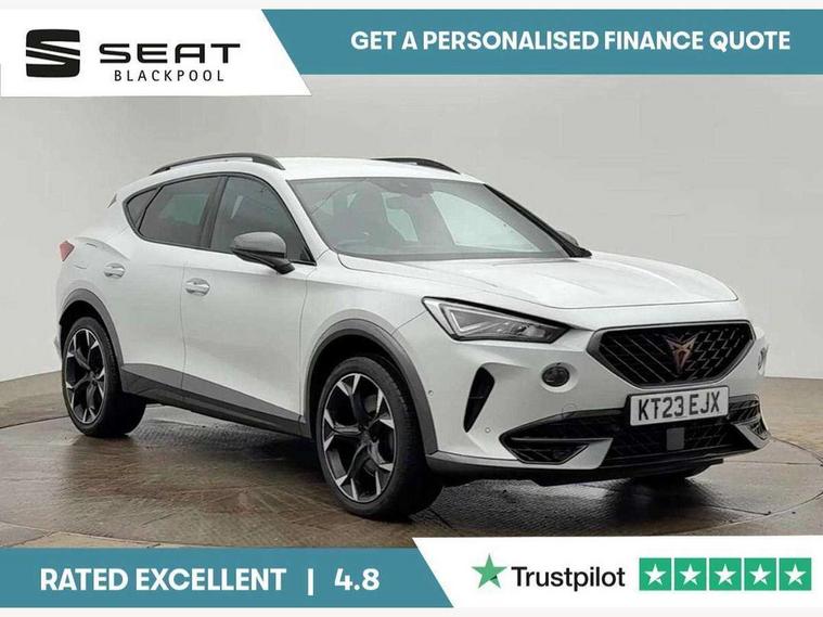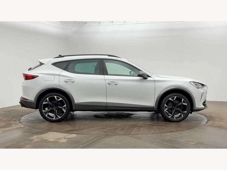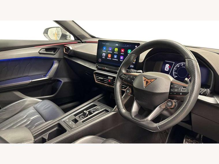 Digital cockpit and configurable dashboard, Driver alert system, Dynamic chassis control with driving profile selection (Comfort, Sport, CUPRA, Individual), Forward collision warning with automatic braking, Lane assist, Navigation system with 12'' Touchscreen Display, Park assist (inc front/rear parking sensors), Predictive adaptive cruise control with speed limiter, RPM, trip computer, outside temp gauge, instrument light brightness, low fuel warning light, lights on reminder, gearshift indicator, Service interval indicator, Speed sensitive power steering, Start/stop system with regenerative braking, Virtual pedal and electric tailgate, Voice control system, Wired Android Auto, Wireless apple carplay, Wireless phone charger, Electronic locking differential and dynamic traction support, Sports suspension with front shock absoption, 2 front and 2 rear USB type C sockets, Auxiliary input socket, DAB radio, Auto dimming rear view mirror, Body colour door handles, Body coloured bumpers, Dark grey wing mirror, Daytime running light with automatic headlight control and coming home feature, Dynamic headlight range control, Electric front/rear windows, Electrically adjustable heated and folding door mirrors with memory function, Front fog lamps with cornering function, Gloss black roof rails and window surrounds, LED Headlights, LED Taillights with dynamic indicator, Rain sensing wipers, Rear diffuser with twin exhaust pipe on each side, Rear side wing doors, Rear wash/wipe, Sports bumpers, Third brake light, Tinted rear windows, VZ logo rear badging, Welcome lights, 12v power supply in centre console, 12V socket, 12v socket in loadspace, 2 front and 2 rear reading lights, 230V socket, 3 seat bench in 2nd row, 60/40 split rear bench seat with armrest and mechanical seat release, Black headlining, Cupra sports pedals, Dust/pollen filter, Front and rear head restraints, Front centre armrest, Height/reach adjust steering wheel, Illuminated interior front door sills, Illuminated sunvisor with mirror, Isofix, Leather heated multi-function sports steering wheel with start stop, CUPRA mode button and gear shift paddles, Luggage tie-down hooks, Single front passenger seat, Three zone climate control with control panel in rear, Variable luggage/load compartment floor, Wraparound lighting, Genuine Nappa leather Pack - Cupra, Safety and driving pack (XL) - Formentor, 3 point seatbelts on all rear seats, ABS, Brake control system - ESC and brake booster, Child proof door locks, Driver and front passenger airbags with front passenger airbag de-activation, Electronic parking brake, Front and rear disc brakes, Front side curtain airbags, Hill hold control, Public e-call, Seat belt reminder for front and rear seats, Tyre pressure monitoring system, Anti theft alarm system, Keyless entry and start system (KESSY), Locking wheel bolts, Copper and aluminium interior detailing, 19" 'Exclusive' machined sport matte black and silver alloy wheels, Space saver spare wheel,