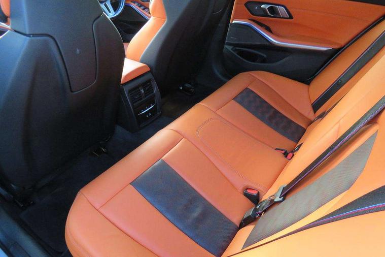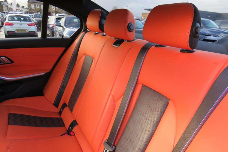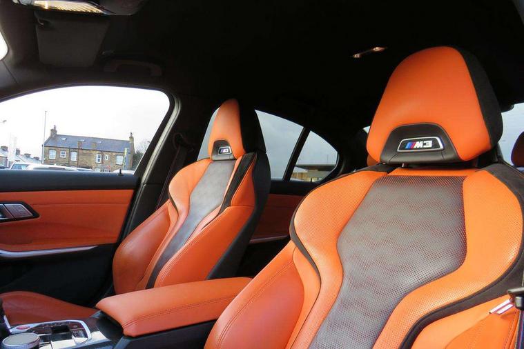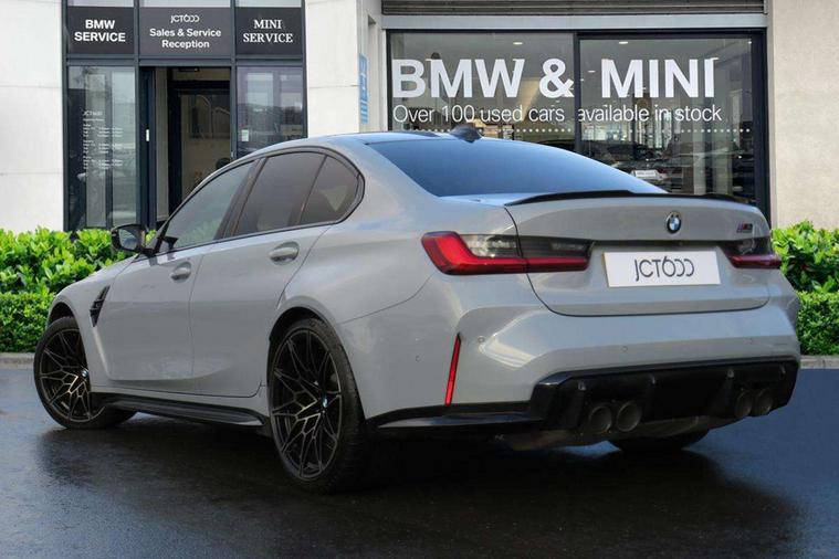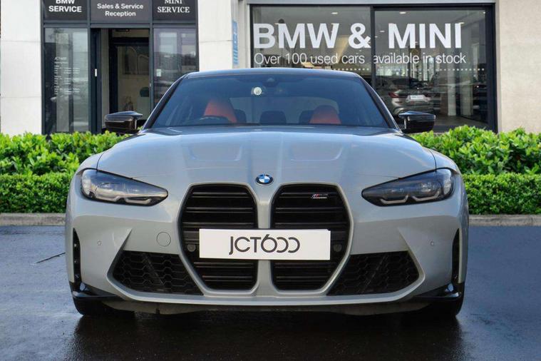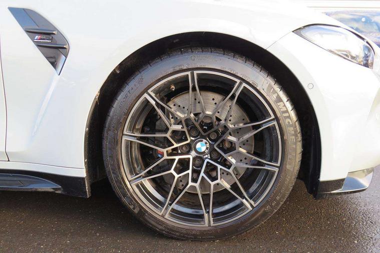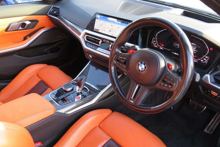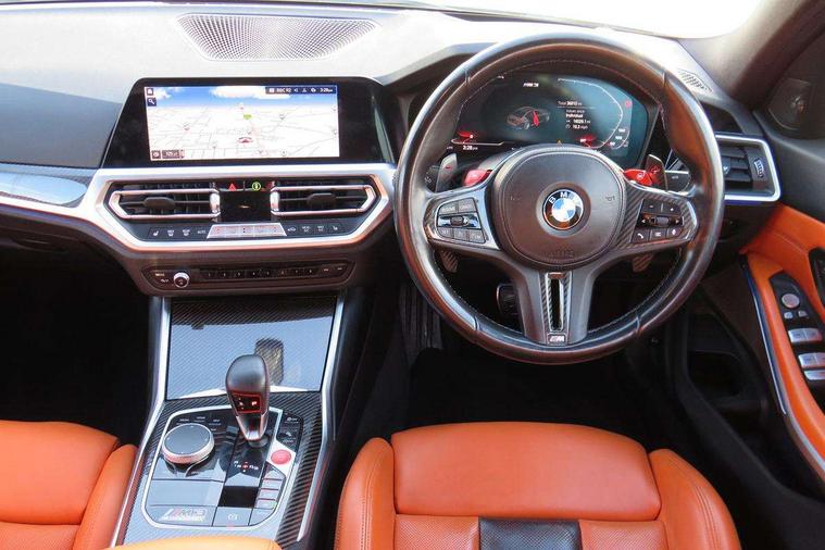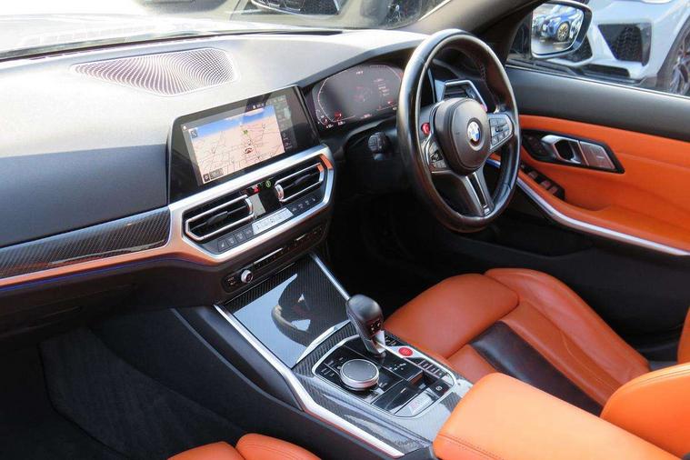 Active guard plus, Automatic start/stop system, Bluetooth functionality with Apple CarPlay/Android Auto, BMW iDrive controller on centre console, BMW legal emergency call, BMW Live Cockpit Professional sat nav system with 12.3" instrument display and high resolution control display, BMW Online services, BMW Teleservices, Brake pad wear indicator warning light, Condition based service, Connected drive services, Door/boot open warning light, Driving experience switch, Electric Power Steering (EPS) with Servotronic, Instrument cluster with extended contents, Lights on warning, M drive buttons, Oil sensor for level and grade, warning by check control system, Oil temperature gauge, On board computer, On board diagnostics, Optimum shift indicator, Outside temperature display, Pull away assistant, Run flat indicator, Service interval indicator, Speed limiter, Widescreen display, Adaptive M Sport suspension, Double joint spring strut front axle, Electronic differential lock control (EDLC), M Drive Professional including track mode, laptimer, traction control & Drift analyser, M Sport differential, M steptronic sport transmission with drivelogic, Safety battery terminal clamp, 8 programmable favourite buttons, Auxiliary point for auxiliary devices, BMW professional radio/CD/MP3, DAB Digital radio, Harman/Kardon loudspeaker system, 3rd brake light, Acoustic glazing, Auto dimming driver's door mirror, Auto dimming rear view mirror, Automatic headlights + automatic windscreen wipers, Black chrome exhaust tailpipes, Black model designation badges, BMW emblem on engine compartment lid and tailgate, BMW high gloss shadow line with extended contents, BMW Individual shadowline lights, Body colour bumpers, Body colour door handles, Carbon fibre reinforced plastic (CFRP) roof, Day time running light, Door mirror integrated indicators, Door sill finishers with aluminium inserts, Dynamic brake lights, Electric adjustable heated door mirrors, Electric folding door mirrors, Electric front and rear windows with one touch/convenient open/close function, Follow me home headlights, Front and rear apron plastic in body colour, Front and rear bumper system, Headlight beam throw control, Heat protection, sun protection glazing, Heated rear window with automatic switch off, High beam assistant, High gloss black frameless kidney grille with M badge, LED number plate light, LED tail lights with 3D L-shaped LED light design, M designation, Mirror glass aspheric on driver's side, convex on passenger side, Rear boot, Rear fog lights, Rear reflectors, Rear right M3 competition inscription, Rear side wing doors, Reversing light, Shark fin roof aerial, Strakes in front side panel, black matt/black high-gloss, with model badge, Visible VIN plate, Welcome lighting, Windscreen wipers with integrated washing jets, 2 cupholders in front centre console, 2 x 12 V Power sockets (luggage compartment and front centre console), 2 x USB Type C ports for charging and data transmission in front centre console, 2 x USB Type C ports for charging in rear centre console, 3 folding rear headrests, 3 seat bench in 2nd row, Ambient lighting, Anthracite headlining, Battery in luggage compartment, Carbon fibre centre console incl. cover for cupholders, Carbon fibre decorative steering wheel finishers, Carbon fibre shift paddles, Carbon fibre strip in instrument panel on front passenger side, Centre console armrest with storage compartment, Compartment in front of cupholder, Driver/passenger sunvisors with illuminated vanity mirrors + covers, Electric front seats + driver memory, English handbook, Floor mats in velour, Footwell lighting, Front and rear door exit lights, Front door storage bins with bottle holder, Front interior light, Front isofix attachment + airbag deactivation, Front seat backrest width adjustment, Front seats lumbar support, Front/rear door armrests, Gearshift lever with embossed M badge, Heated front seats, Height adjustable front headrests, Interior mirror lighting, Isofix on 2nd row outer seats, Lockable/illuminated glovebox, Luggage compartment lighting, Manual 40:20:40 split folding rear seat with two tilt positions for backrest, Rake/reach adjustable steering wheel, Single front passenger seat, Storage compartment in rear doors, Storage tray and compartment with cover in centre console, Three zone automatic air conditioning, Through loading system, Toolkit located in luggage compartment, Wireless charging tray, Additional storage compartment pack - M3, Connected package professional - M3, High gloss shadowline exterior trim pack - M3, 3 point seatbelts on all seats, ABS/EBD, Automatic Stability Control (ASC), Brake energy regeneration, Brake fade compensation, Compound structure brake discs, Cornering brake control (CBC), Crash sensor, Driver/Front Passenger airbags, Dry braking, Dynamic brake control, Dynamic Stability Control with M Dynamic mode, Dynamic Traction Control - DTC, Electromechanical parking brake, Front and rear head airbags, Front seat side impact airbags, Front seatbelt pretensioners + load limiters, Hill start assist, M Sport seat belts, Rear child proof door locks, Seatbelt warning, Side impact protection, Two tone horn, Tyre pressure sensor, Warning triangle and first aid kit, Digital key, Electronic immobiliser, Remote central locking, Thatcham cat 1 remote alarm, Vehicle Key with 4 buttons including the integrated key, Galvanic finish to control surrounds, High gloss black interior trim, Tyre repair kit,