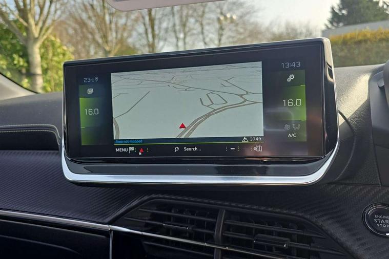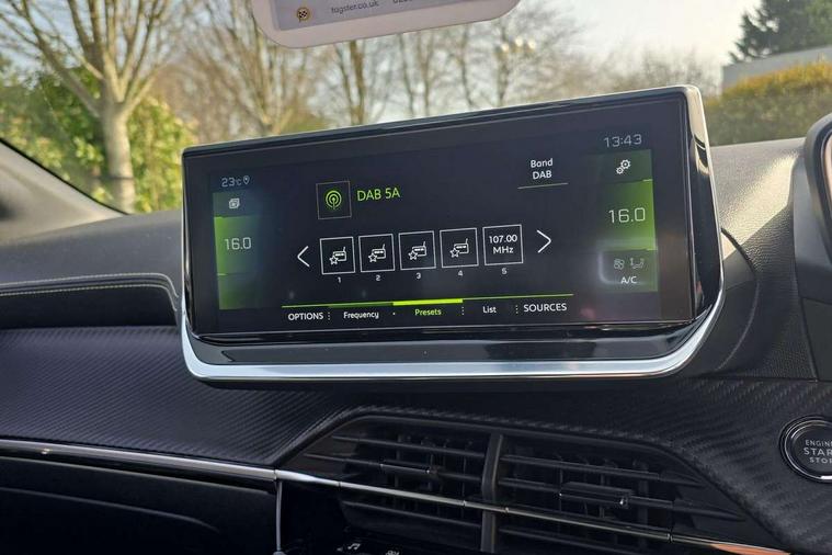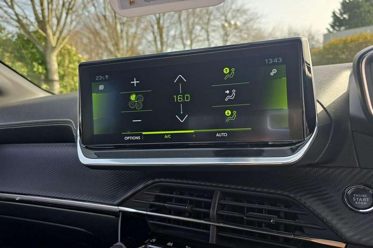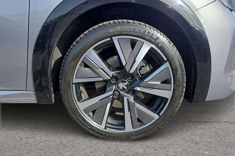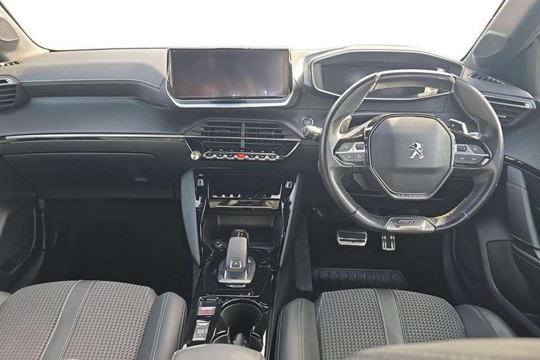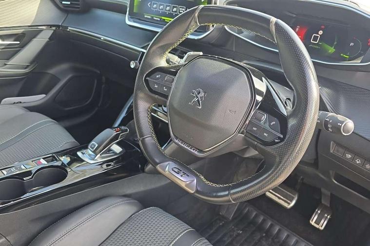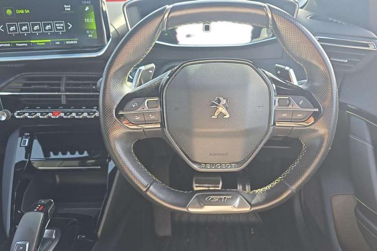 Carbon effect Dashboard, front and rear door panel finish, 17" Camden diamond cut two tone alloy wheels, Space saver spare wheel, Automatic door locking when moving off, Automatic hazard light activation upon heavy brake application, Deadlock, Electronic code immobiliser, Thatcham Cat.1 alarm, 2 front USB socket with USB-C, 2x USB sockets in rear, 6 speakers radio with mp3 compatible, DAB Digital radio, Voice recognition for radio, navigation and telephony features, 2x 2nd row ISOFIX child seat mountings, 3 point seatbelts on all rear seats, ABS (Anti-lock Braking System) with EBD (Electronic Braking Distribution) and EBA (Emergency Braking Assistance), Active safety brake with night function/cyclists/pedestrians, Child locking functionality on rear doors, Driver and passenger airbags with Passenger airbag deactivation system, Driver/front passenger side airbags, Electric parking brake, ESP with Hill Assist, Front and rear curtain airbags, Front and rear disc brakes, Front optimised safety headrests and 3 x rear retractable headrests with height adjustable, Front three point retractable seatbelts with force limiters, Tyre pressure sensor, 2 X Rear number plate lights, Automatic lights, Automatic windscreen wipers, Body coloured exterior door handles, Dark tinted Rear side and tailgate windows, Diamond Black roof, Electric front windows + one touch + anti-pinch, Electric rear windows with one touch/anti-pinch, Electrically adjustable, heated and power folding door mirrors, Extended diamond black rear spoiler, Follow me home headlights, Frameless electrochrome interior rear view mirror, Front windscreen wiper with magic wash cleaning system, Full LED headlights with smartbeam assist, Gloss black finish on B pillar, Gloss black rear cluster connecting strip, Gloss black wheel arch extensions, Gloss black window surround, GT Line model designation badging on C pillar, GT Line model designation badging on tailgate, Headlights left on audible warning, LED daytime running lights with 3 claw headlight with distinctive tooth design, LED side indicator lights integrated into door mirrors, Model designation badges front and rear, Nera black door mirror shells, Radiator grille - Dark chrome chequered and gloss black edge trim, Rear bumper with gloss black finish, Rear full LED 3D peugeot signature claw effect lights with daylight function, Rear lower bumper diffuser effect trim in gloss black, Rear reversing lights, Rear windscreen wiper triggered automatically in reverse gear, Stainless steel door sill scuff plates, Tailgate with heated rear windscreen and wiper blade, Twin chrome exhaust tailpipes, 1/3 to 2/3 split folding rear seats, 12V socket, 8 Colour personalisable ambient lighting, Aluminium pedals and foot rest, Automatic gear lever in full grain leather and satin chrome, Driver and front passenger seat manual adjustment in longitudinal and back rest angle, Driver and front passenger seat mechanical height adjustment, Driver and front passenger sport seats, Dual zone electronic climate control, Electric power steering with reach and rake adjustable steering column, Front and rear carpet mats in black with lime green stitch detail, Front centre armrest with storage compartment, Front LED interior light with 2 reading spotlights and rear interior light with timer, High centre console with 2 cup holders, ISOFIX child seat mounting points on passenger seat, Lime green contrast stitching to armrest, front centre console, door panels and dashboard facia, Map pockets on the backs of the front seats, Mistral full grain perforated leather steering wheel with aikinite stitch detail and satin chrome 'GT' emblem, Piano keys gloss black plated toggle switches to access main functions of the vehicle, Roof lining - Mistral black, Seatbelt unfastened on the move audible and visual alert for front and rear seats, Bluetooth telephone facility, Driver attention warning, Exterior temperature indicator with ice warning, Front and rear parking sensors, Mirror screen with mirror link, apple carplay and android auto, Multi function trip computer, Peugeot connect SOS and assistance, PEUGEOT i-Cockpit with compact steering wheel, PEUGEOT i-Cockpit with configurable 3D headup instrument panel, Push button start, Smart phone docking station, Smartphone charging plate, Speed limit recognition and recommendation, Visio Park 1 with 180 degree Colour reversing camera,