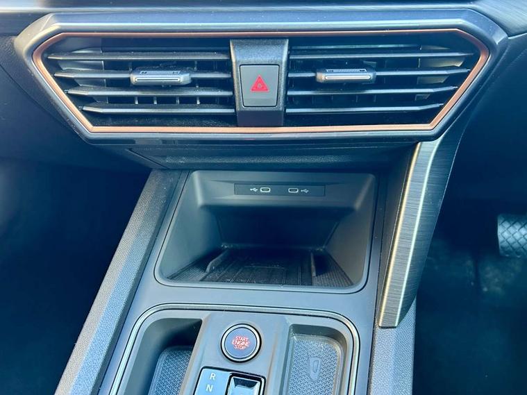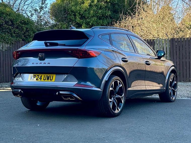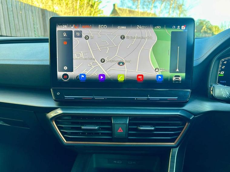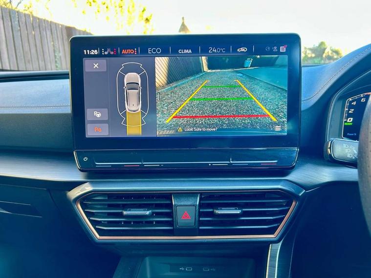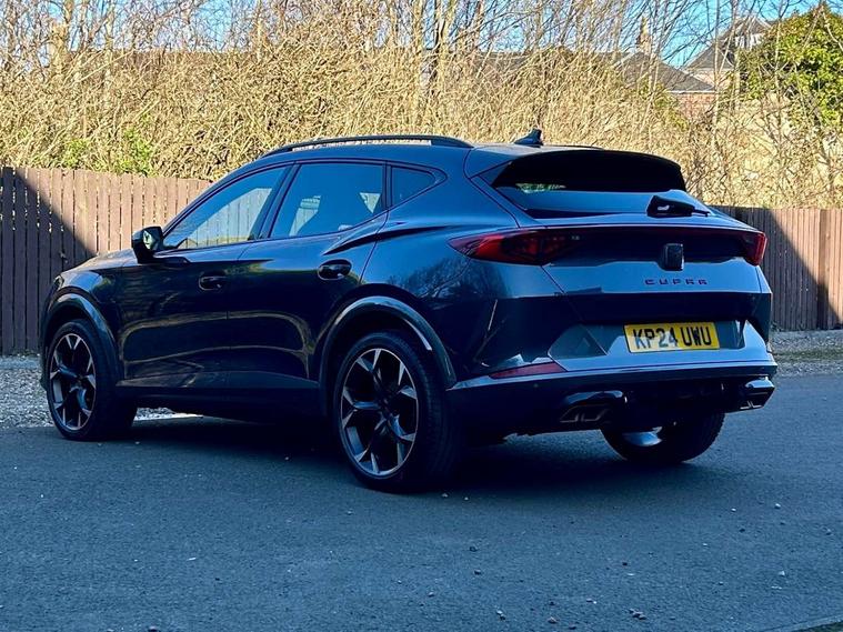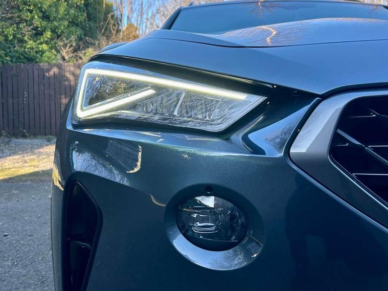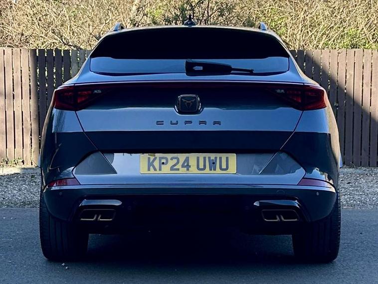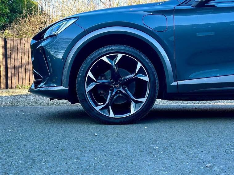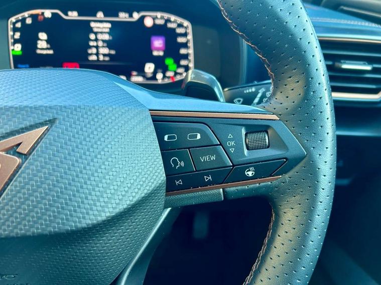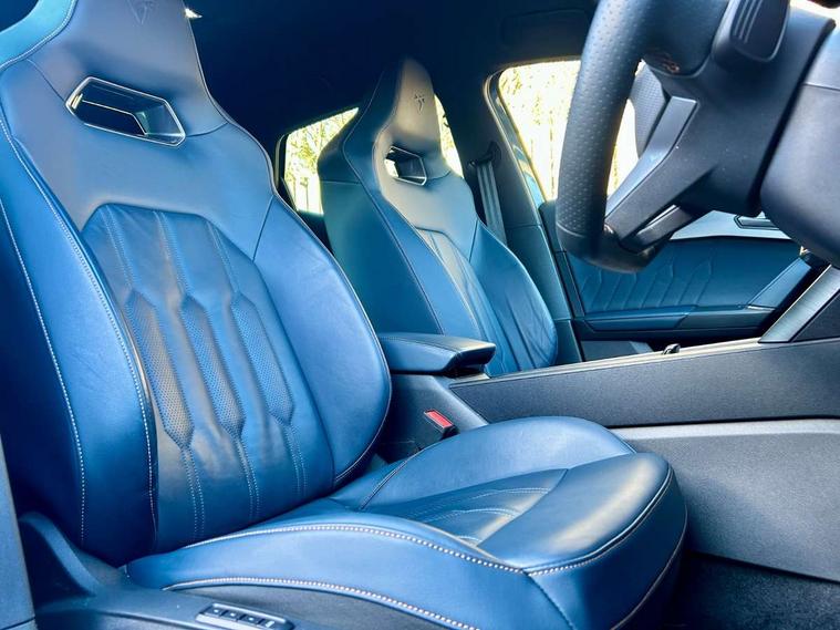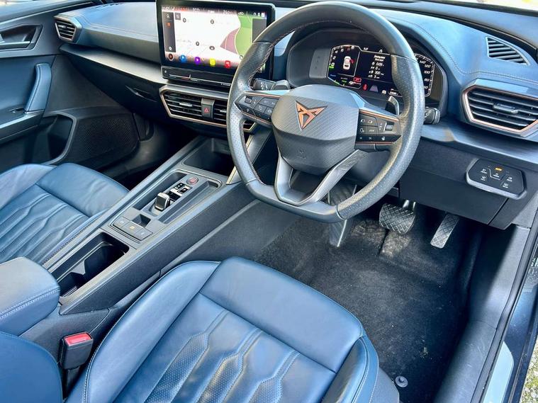 Digital cockpit and configurable dashboard, Driver alert system, Driving profile selection, Forward collision warning with automatic braking, Lane assist, Navigation system with 12'' Touchscreen Display, Park assist (inc front/rear parking sensors), PAS, Predictive adaptive cruise control with speed limiter, Rear view camera, RPM, trip computer, outside temp gauge, instrument light brightness, low fuel warning light, lights on reminder, gearshift indicator, Service interval indicator, Start/stop system with regenerative braking, Voice control system, Wired Android Auto, Wireless apple carplay, Wireless phone charger, 10 amp mode 2 charging cable, 16 amp mode 3 charging cable, 3.6 kw On-board charger, Electronic locking differential and dynamic traction support, Standard suspension, 2 front and 2 rear USB type C sockets, DAB radio, Auto dimming rear view mirror, Body colour door handles, Body coloured bumpers, Dark grey wing mirror, Daytime running light with automatic headlight control and coming home feature, Dynamic headlight range control, Electric front/rear windows, Electrically adjustable heated and folding door mirrors with memory function, Front fog lamps with cornering function, Gloss black roof rails and window surrounds, LED Headlights, LED Taillights with dynamic indicator, Rain sensing wipers, Rear diffuser with black simulated exhaust pipes, Rear side wing doors, Rear wash/wipe, Third brake light, Tinted rear windows, Welcome lights, 12V socket, 2 front and 2 rear reading lights, 3 seat bench in 2nd row, 60/40 split rear bench seat with armrest and mechanical seat release, Black headlining, Dust/pollen filter, Front and rear head restraints, Front centre armrest, Height/reach adjust steering wheel, Illuminated interior front door sills, Illuminated sunvisor with mirror, Isofix, Leather multi function heated steering wheel with gear shift paddles, Single front passenger seat, Three zone climate control with control panel in rear, Wraparound lighting, Genuine Nappa leather Pack - Cupra, 3 point seatbelts on all rear seats, ABS, Brake control system - ESC and brake booster, Child proof door locks, Driver and front passenger airbags with front passenger airbag de-activation, Electronic parking brake, Front and rear disc brakes, Front side curtain airbags, Hill hold control, Public e-call, Seat belt reminder for front and rear seats, Tyre pressure monitoring system, Anti theft alarm system, Keyless entry and start system (KESSY), Locking wheel bolts, Copper and aluminium interior detailing, 19" 'Exclusive' machined sport matte black and silver alloy wheels, Tyre repair kit,