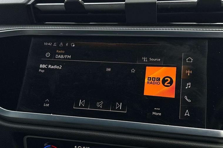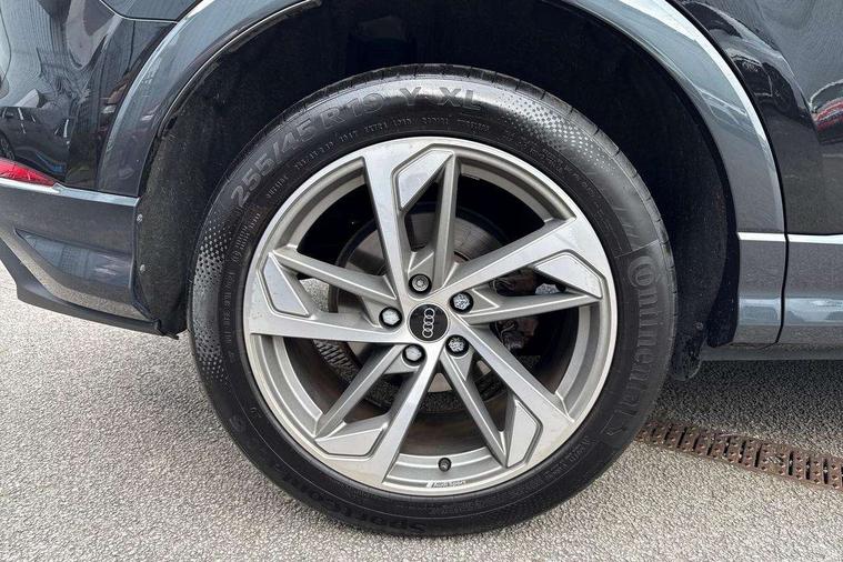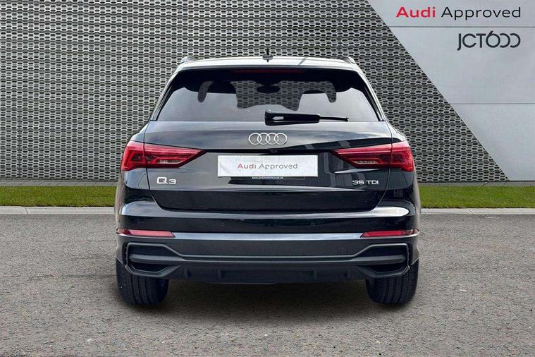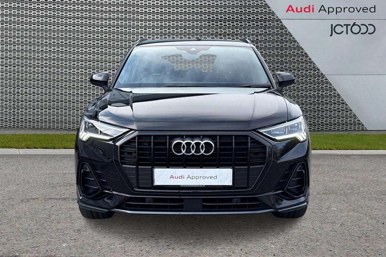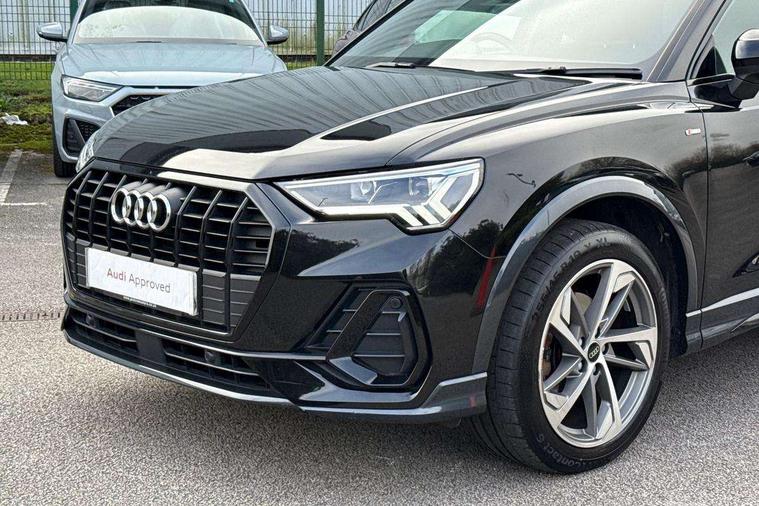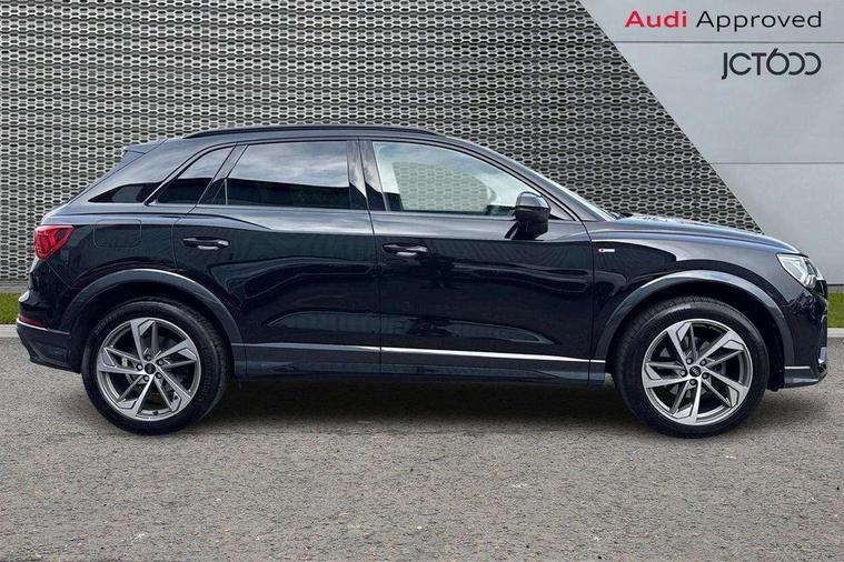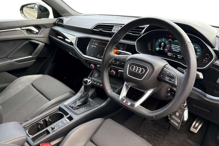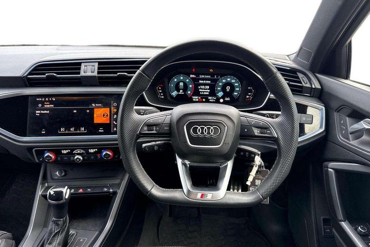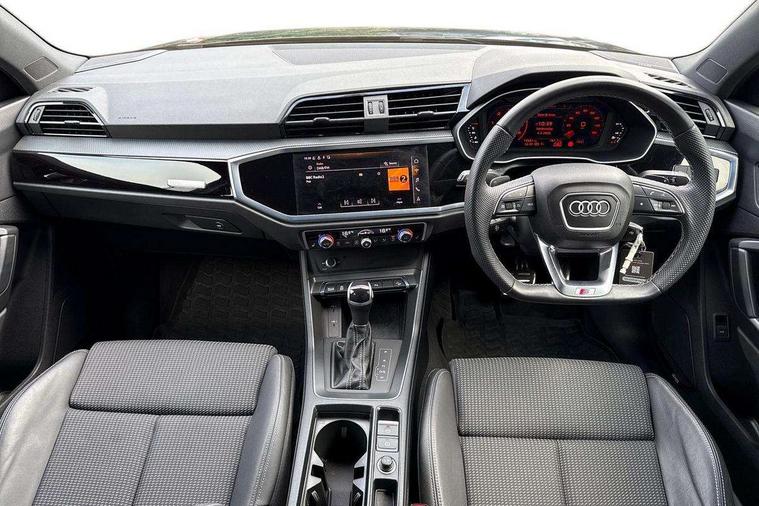 Amazon alexa Integration, Audi drive select, Audi lane departure warning, Audi smartphone interface includes wireless Apple carplay/Android Auto, Audi Virtual Cockpit - 10.25" display, Bluetooth interface, Camera based traffic sign recognition, Legal emergency call, MMI Navigation Plus with high resolution 10.1 inch touchscreen colour display, Power operated tailgate, Progressive steering, Service interval indicator, Start stop system with recuperation, Voice control system with natural language interaction, Diesel particulate filter, Sports suspension, 2 USB-C ports with charge and data functions, 6 passive loudspeakers, DAB digital radio module, Acoustic windscreen, Auto dimming frameless rear view mirror, Black roof rails, Electrically folding, adjustable and heated door mirrors with integrated LED side indicators and kerb view function for passenger side, Front and rear electric windows, Front fog lights, Grille vertical bars in aluminium silver/Matt, High gloss black finish B and C pillars, LED Dynamic rear indicators, LED headlights with LED daytime running lights, LED rear lights, LED third brake light, Privacy glass dark tinted rear and rear-side windows (from B-pillar backwards), Rain and light sensors, Rear diffuser grille in grained matt black, Rear diffuser strip in matt anthracite black, Rear side wing doors, Rear wiper, S line bumpers in contrasting Manhattan grey, Variable front intermittent wipers, 12V socket in rear centre console, 3 seat bench in 2nd row, 40:20:40 folding with manual adjustment for 60:40 forwards/backwards position and backrest angle, Adjustable rear seat bench/backrest with centre armrest and cupholder, Black cloth headlining, Dual zone electronic climate control, Front and rear black floor mats with contrast stitching in rock grey, Front and rear headrests, Front and rear roof module including reading lights, Front centre armrest, Glove compartment lighting, Height and reach adjustable steering wheel, Illuminated door sill trims with S logo, ISOFIX child seat mounting for front passenger with airbag deactivation and outer rear seat including top tether attachment point for outer rear seats, Luggage compartment light, Manual front seats with height adjustment, Perforated leather gearknob, Single front passenger seat, Stainless steel luggage compartment sill finisher, Stainless steel pedals, Ambient lighting pack - Q3, Black styling pack - Q3, Non smoking pack - Q3, 3x3 point rear seatbelts, 6 airbags - Driver, front passenger, curtain and side windows, Electrically operated child locks on rear doors, Electromechanical parking brake, Electronic stabilisation control including ABS, ASR and EDL, Front seatbelt reminder, Hill descent control, Hill hold assist, Pre sense basic, Seatbelt monitoring, Tyre pressure warning, Warning triangle and first aid kit, Anti theft alarm, Anti theft wheel bolts, Audi pre-sense front with pedestrain and cyclist recognition, Immobiliser, Remote central locking, Aluminium look interior elements, Detail dashboard around MMI touch colour display in glass look, black with surround in aluminium look, Leatherette door armrest, Piano black inlay, 19" 5 twin arm design diamond cut audi sport alloy wheels in matt grey look,