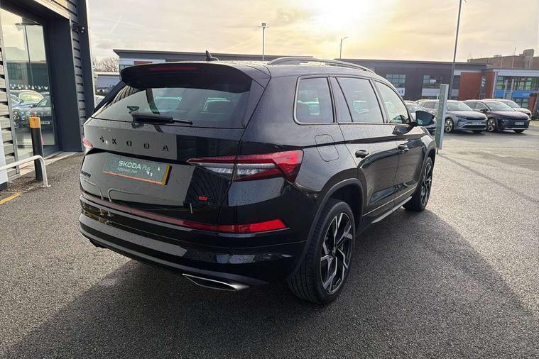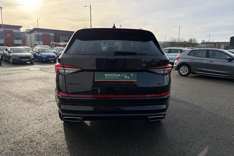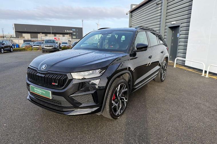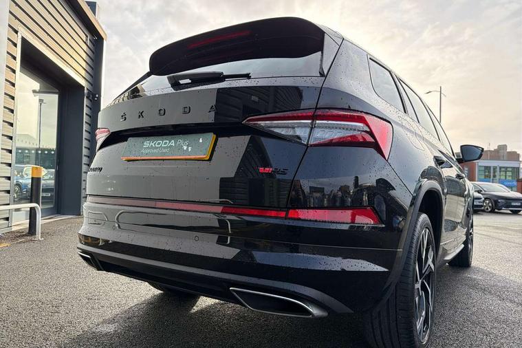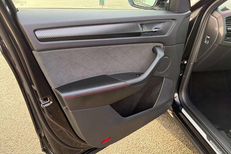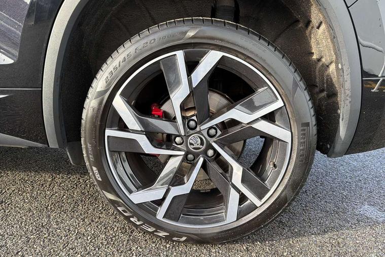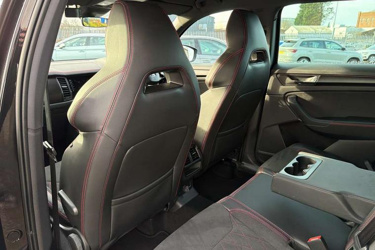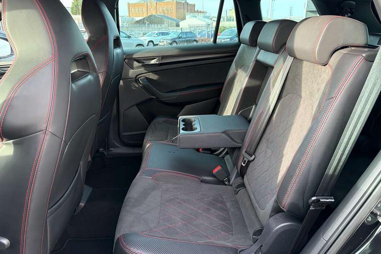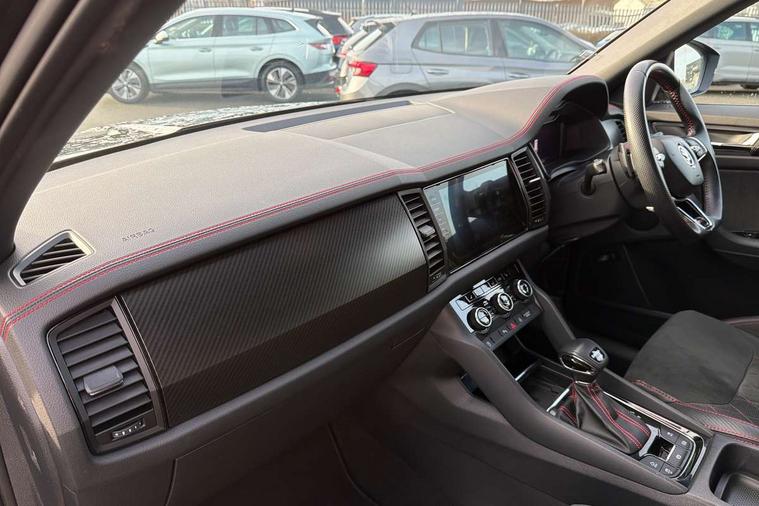 Bluetooth system, Columbus satellite navigation with 9.2" touchscreen, integrated Wi-Fi, web radio, Digital voice enhancement, e call+, ECO Stop/start function, Exterior temperature indicator, Progressive steering, Rear view camera, Smartlink wireless for apple carplay and wired for android auto, Speed limiter, Tailgate unlocking from outside, USB C Port x 2 in front centre console, Virtual Cockpit - 10.25" digital display, Wireless charging, Dynamic Chassis Control including off-road function, 8 Speakers, DAB Digital radio, Dynamic sound booster, Aero front windscreen wipers with intermittent function, Aero rear window wiper, Auto dimming rear view mirror, Black wheel arch surrounds, Body colour bumpers, Body colour door handles, Chrome exhaust tailpipe, Electric adjustable/heated/folding door mirrors, driver side auto dimming with boarding sports and memory function, Electric front and rear windows, Extended rear spoiler with finlets in gloss black, Front fog lights, Full LED matrix headlights with AFS (adaptive front light system), cornering function and AWL (all weather lighting system), Gloss black door mirrors, Gloss black roof rails, Heated rear window, LED daytime running lights, LED rear fog light, LED third brake light in rear spoiler, Light assistant (coming/leaving home/tunnel light), Off-road style lower front bumper element, Privacy glass, Rain and light sensors, Rear diffuser, Rear LED lights (high functionality) with welcome effect and dynamic indicators, Rear side wing doors, Safety reflectors on front and rear doors, Tailgate lettering in Black without 4x4 badge, vRS exterior design - vRS front and rear bumpers with vRS badging (gloss black on tailgate and chrome on radiator grille) + black window surround, Window control switches with black trim, Without engine designation, 12V socket in boot, 2 rails with 2 hooks, 2 seat bench in 3rd row, 3 seat bench in 2nd row, 3 spoke leather sports multi-function steering wheel with vRS logo and paddle, 4 foldable roof handles with rear coat hooks, 60:40 foldable rear seat with sliding adjustment and backrest angle adjustment, Aluminium pedals, Black roof headlining, Bottle holders in door panel in the 1.5 litre front and 1 litre rear, Cargo storage compartments, Chrome headlight control button, Chrome interior door handles, Coat hooks on B pillar, Covered storage compartment on driver side, Decorative door sill covers, Front and rear door armrest with black adductor trim, Front centre armrest with storage compartment, cup holder and 12V socket, Front courtesy lights, Gear shift lever with chrome frame and black gloss insert with vRS logo, Height adjustable front headrests, Illuminated glovebox, Illuminated luggage compartment, Isofix child seat fittings in outer rear seats with top tether, Manually adjustable steering column, Microsuede door panels with vRS black stitching, Net programme in boot (1x horizontal Net, 2x vertical Nets), Overhead glasses storage compartment, Pollen filter, Rear centre armrest with cupholders, Single front passenger seat, Sliding trunk cover, Small Bags on the inner sides of the front backrests, Sports seats, Sunvisors with illuminated vanity mirrors, Three rear height adjustable headrests, Ticket holder on A Pillar, Umbrella in door panel, Variable boot floor, vRS red stitching in front and rear armrests and door panel armrests, LED Interior light pack - Kodiaq, Auto door release and activation of warning lights in the event of an accident, Driver and front passenger airbag with knee airbag and front passenger airbag deactivation, Electronic parking brake with hill start assist, Emergency rear braking signal, ESC (incl. ABS+MSR+ASR+EDS+HBA+DSR+RBS+MKB), Front assist with autonomous emergency braking, Front side airbags with curtain airbags, Fuel cut off safety device, Height adjustable front 3 point seatbelts + pretensioners, Hill hold control, Rear disc brakes, Red brake calipers, Safety vest holder in door, Seat belt reminder for all seats, Three point rear seat belts, Two tone horn, Tyre pressure monitor, Alarm with interior monitoring and tilt sensor with safe function, Anti-theft wheel bolts, Immobiliser, Keyless entry and start system (KESSY), Remote central locking with 2 keys, Black air vent surround, Carbon finish dashboard and door inserts, Red stitching in dashboard, 20" Sagitarius anthracite alloy wheels with aero covers, Temporary spare wheel (space saver),